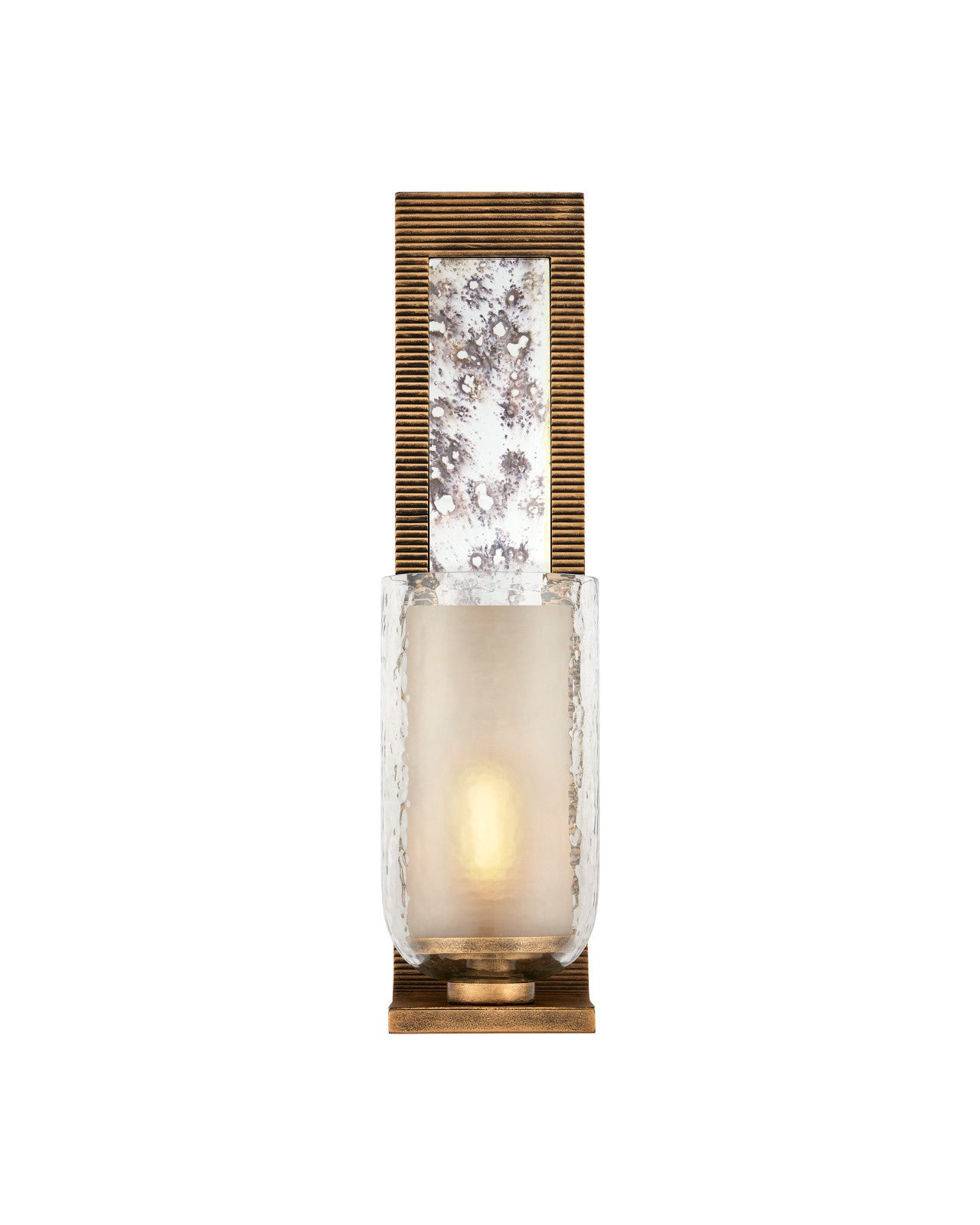 The Wynyard Wall Sconce features a wallplate inset with antique mirror that reflects light and brightens the ribbed iron frame in an antique gold finish. Extending from the plate is a clear hammered glass canister that holds a frosted glass diffuser, softening the illumination while adding texture and depth to the design. The one-light sconce is dimmable, and there will be subtle variations in the mirrored glass from fixture to fixture.