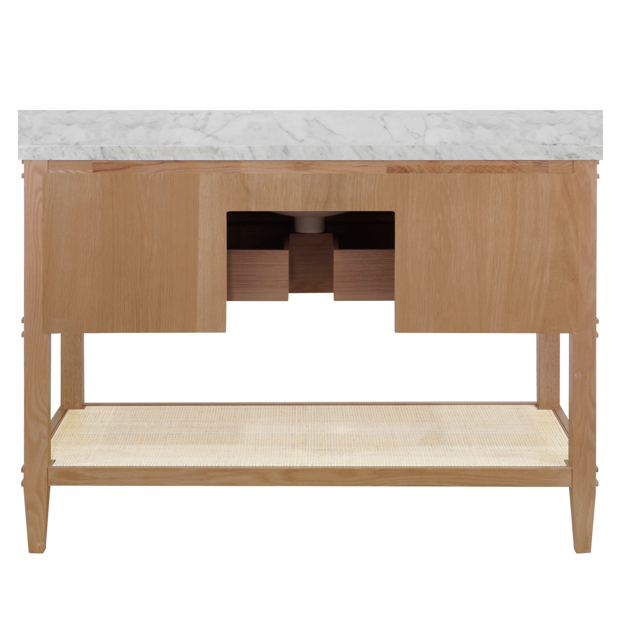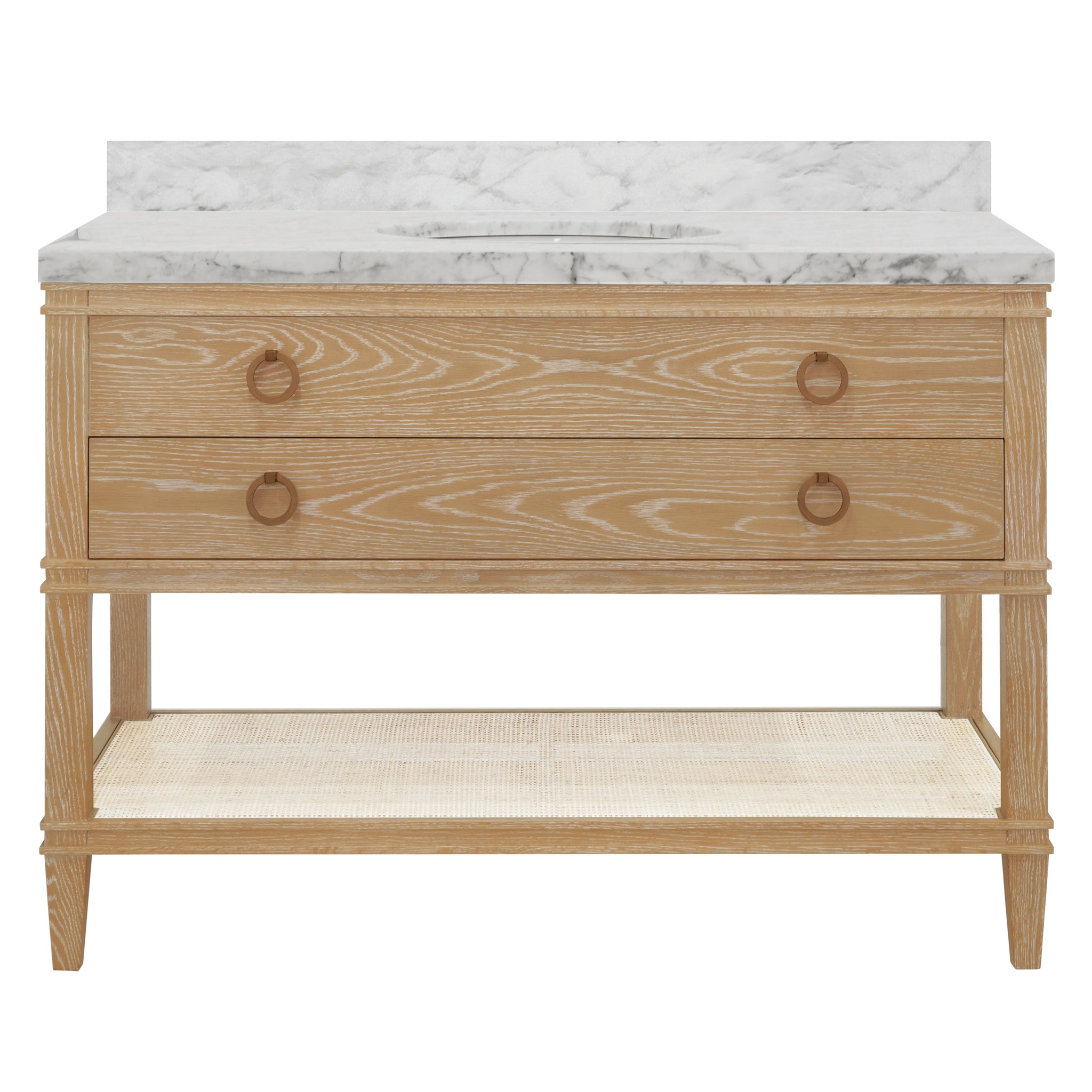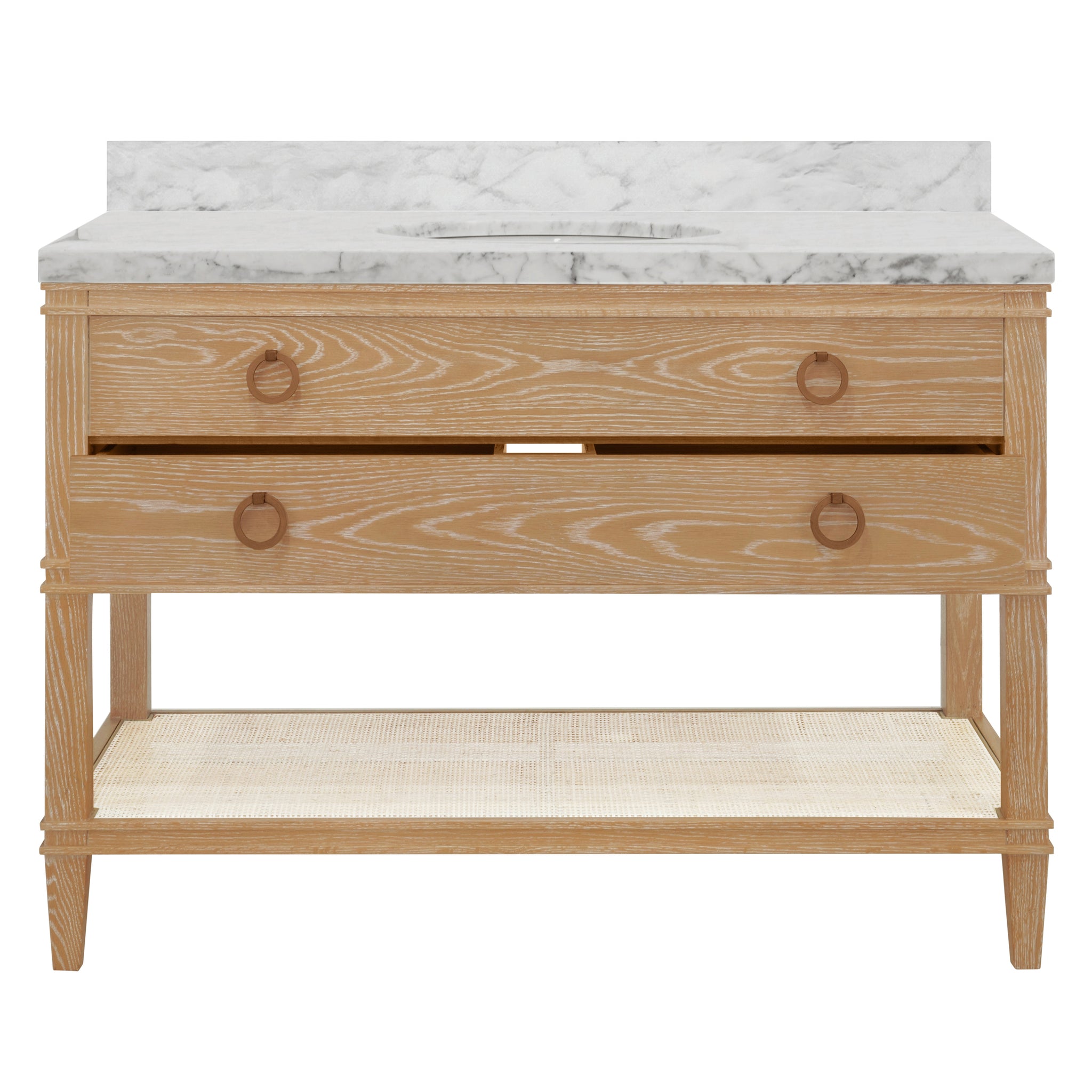 Cutler Bath Vanity In Cerused Oak With Open Cane Shelf, White Marble Top, Porcelain Sink, And Antique Brass Ring Hardware, 48" Wide