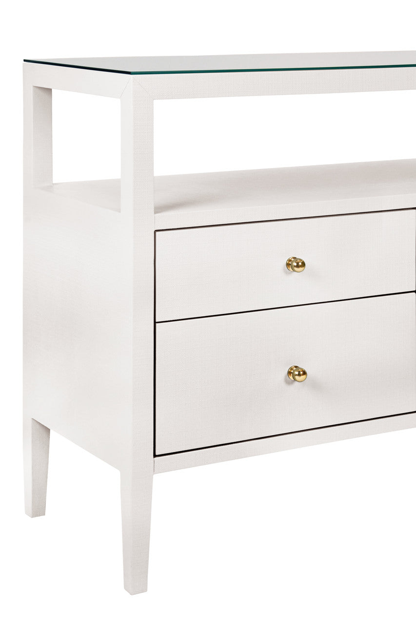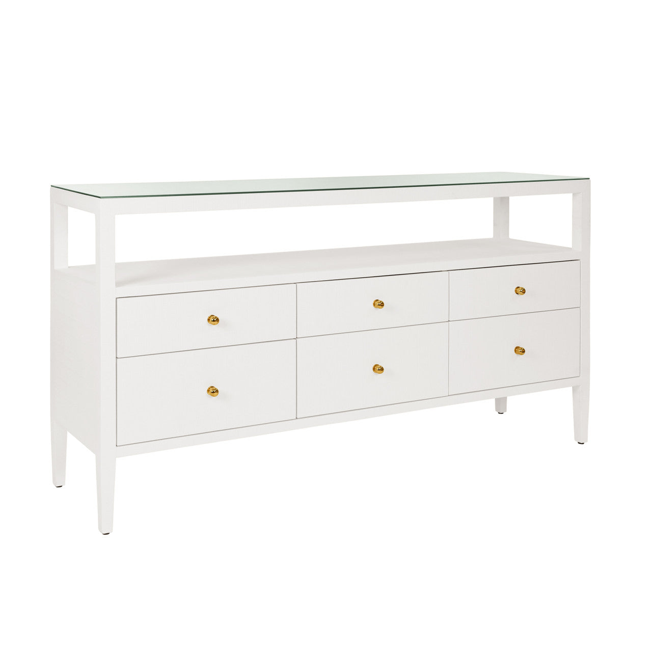 Jordan Six Drawer Console With Open Shelf In Textured White Linen With Polished Brass Knobs