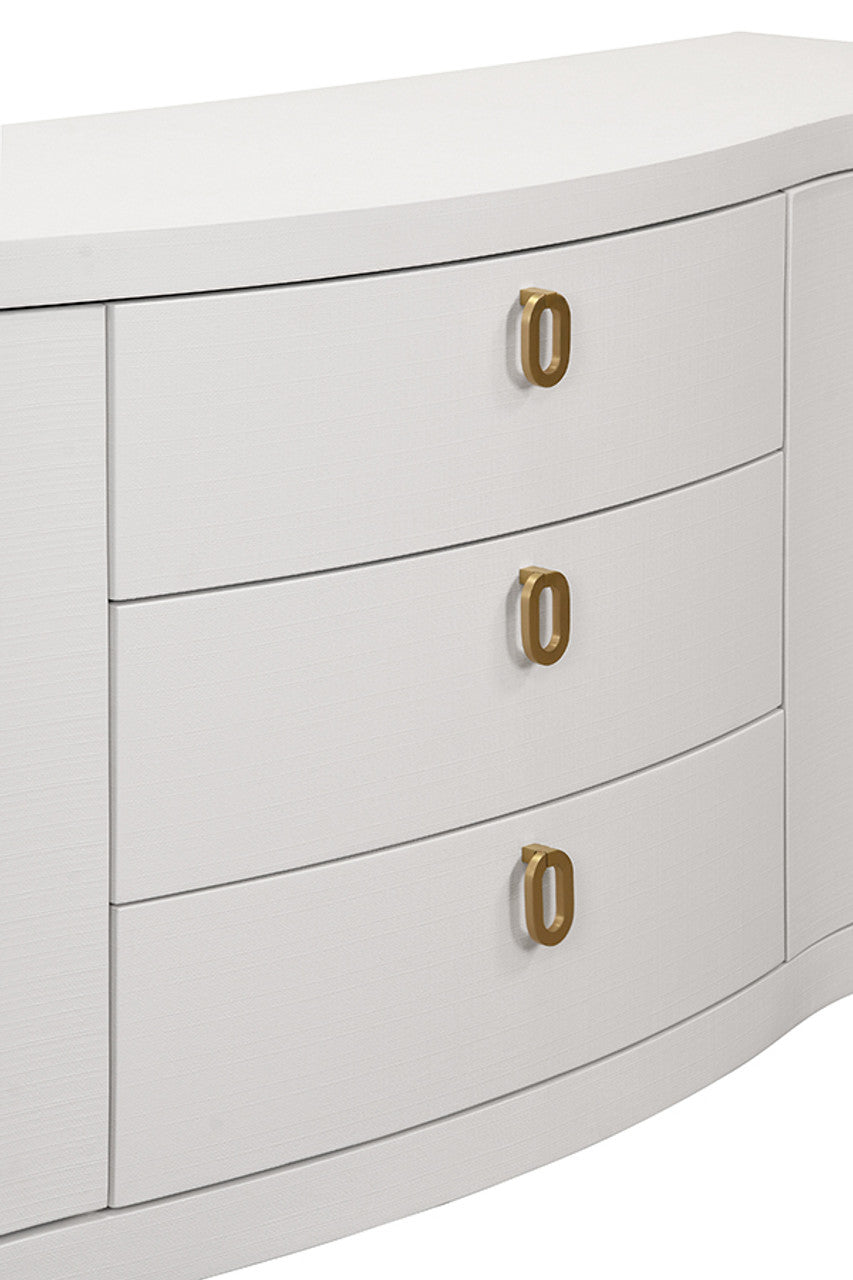 Elegant and sculptural, the Paulina WH curved-front buffet brings refined texture and graceful form to any dining or living space. Paulina is gracefully wrapped in textured white linen, softened by its gently bowed silhouette and elevated by the subtle sheen of satin brass ring pulls. Two doors and three drawers offer versatile storage, seamlessly blending function with high-end design. With its crisp palette and tailored detailing, this buffet makes a sophisticated statement while maintaining an air of relaxed elegance.