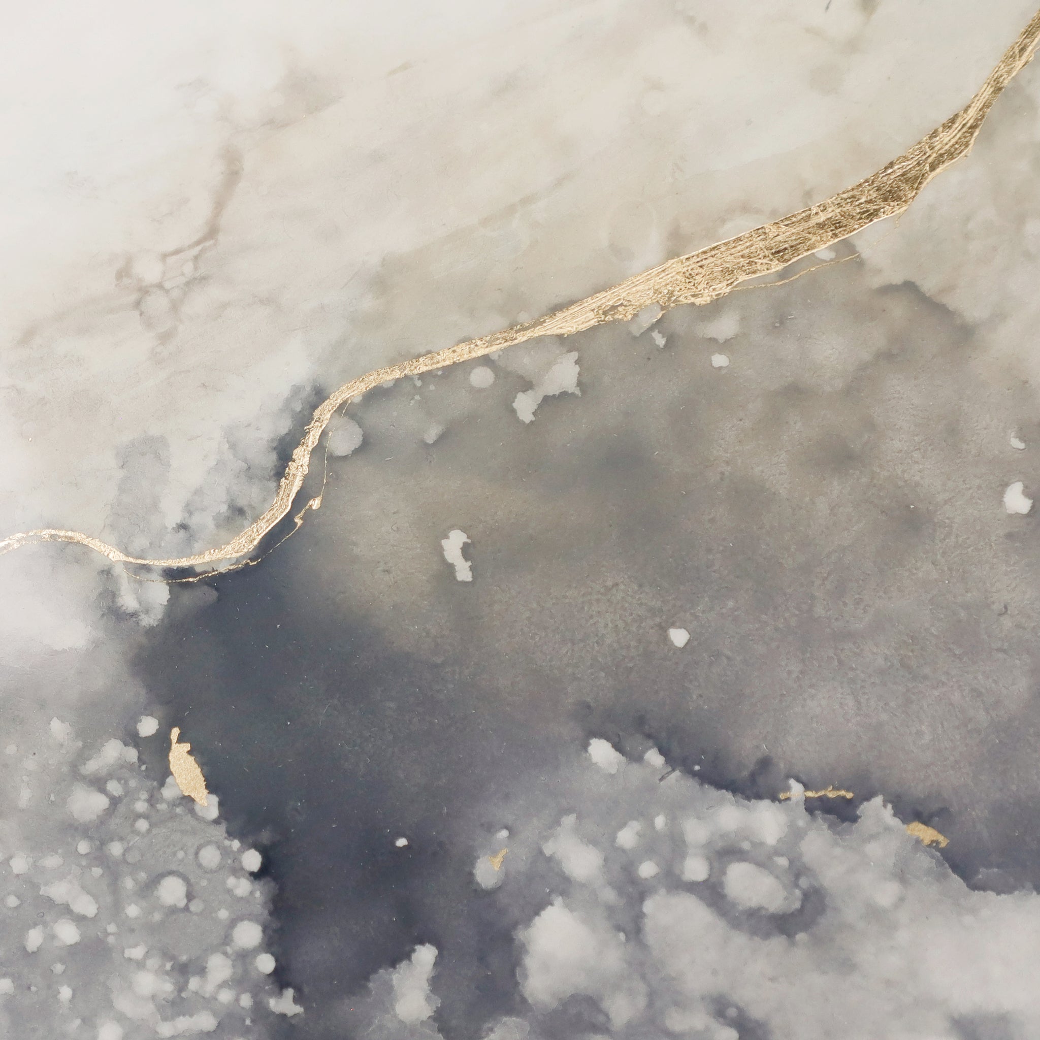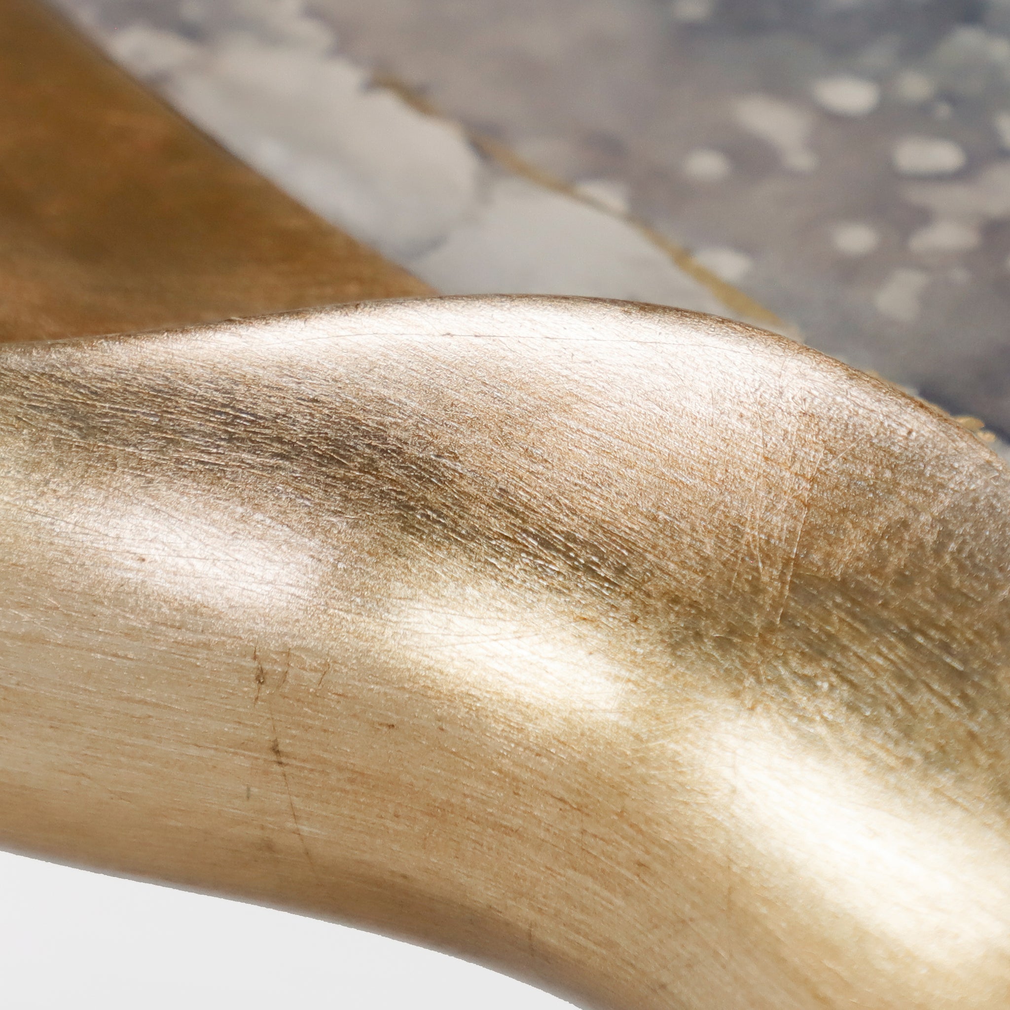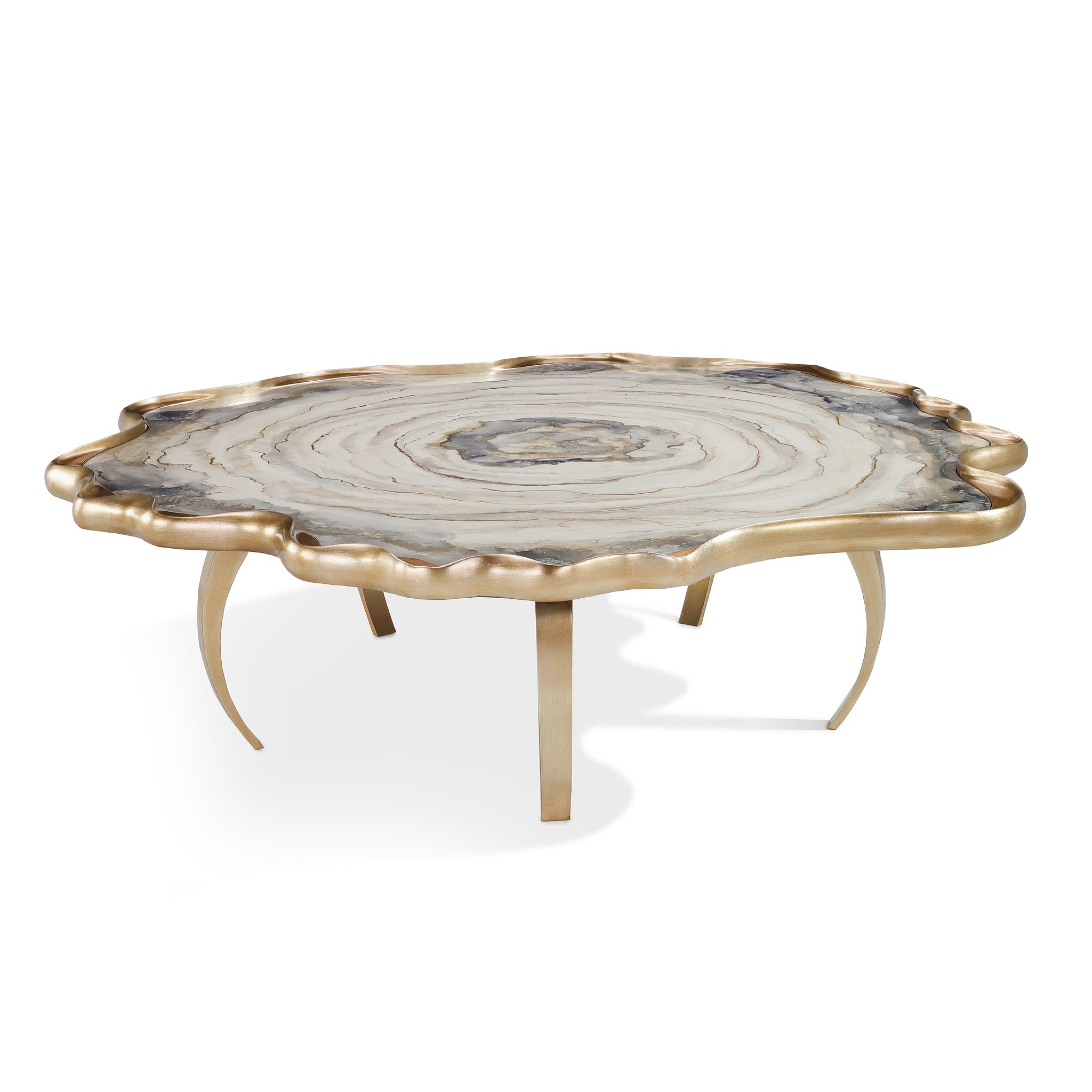 The Achates Cocktail Table brings organic beauty into a refined, contemporary context. The surface is adorned in a stunning Grey Agate finish, showcasing rich banding and layered depth that evokes the beauty of natural stone. Organically shaped edges in a Valyrian Gold finish match the arched aluminum legs, contributing opulent tones to the flowing motifs.