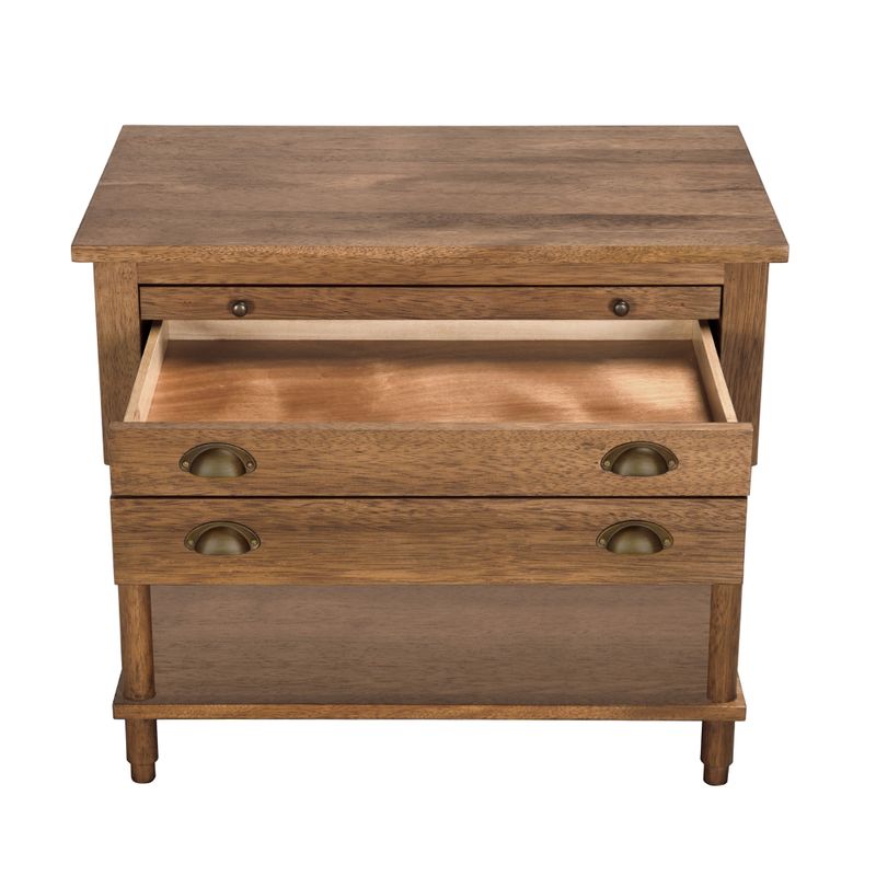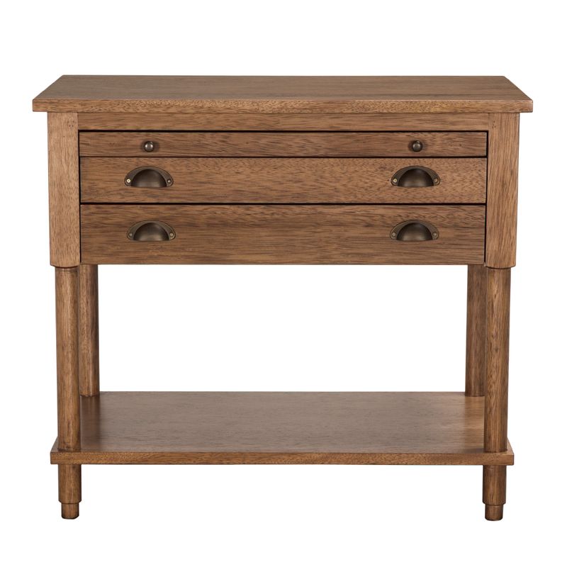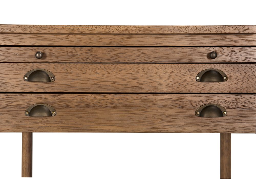 A transitional side table with a dark walnut finish features two drawers and a pull-out writing tray. Timeless brass accents and rich textural contrasts lend versatility to any interior setting.
