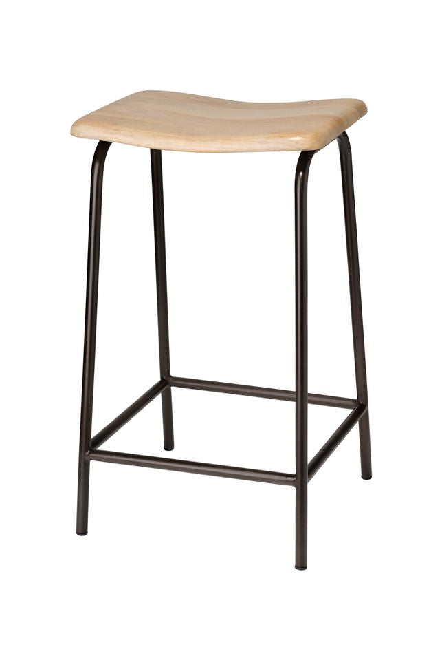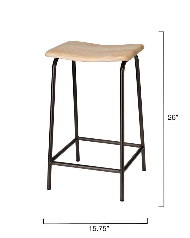 This counter-height stool pairs industrial strength with artisanal beauty. Its hand-forged iron legs, finished in a deep, matte black, rise to meet an ergonomically curved seat hand-carved from bleached mango wood. The striking ebony-and-ivory palette and sleek, contemporary lines make it visually captivating, while the craftsmanship speaks to enduring quality. Perfect for kitchens, bars, or gathering spaces, it balances comfort, texture, and timeless modern appeal.