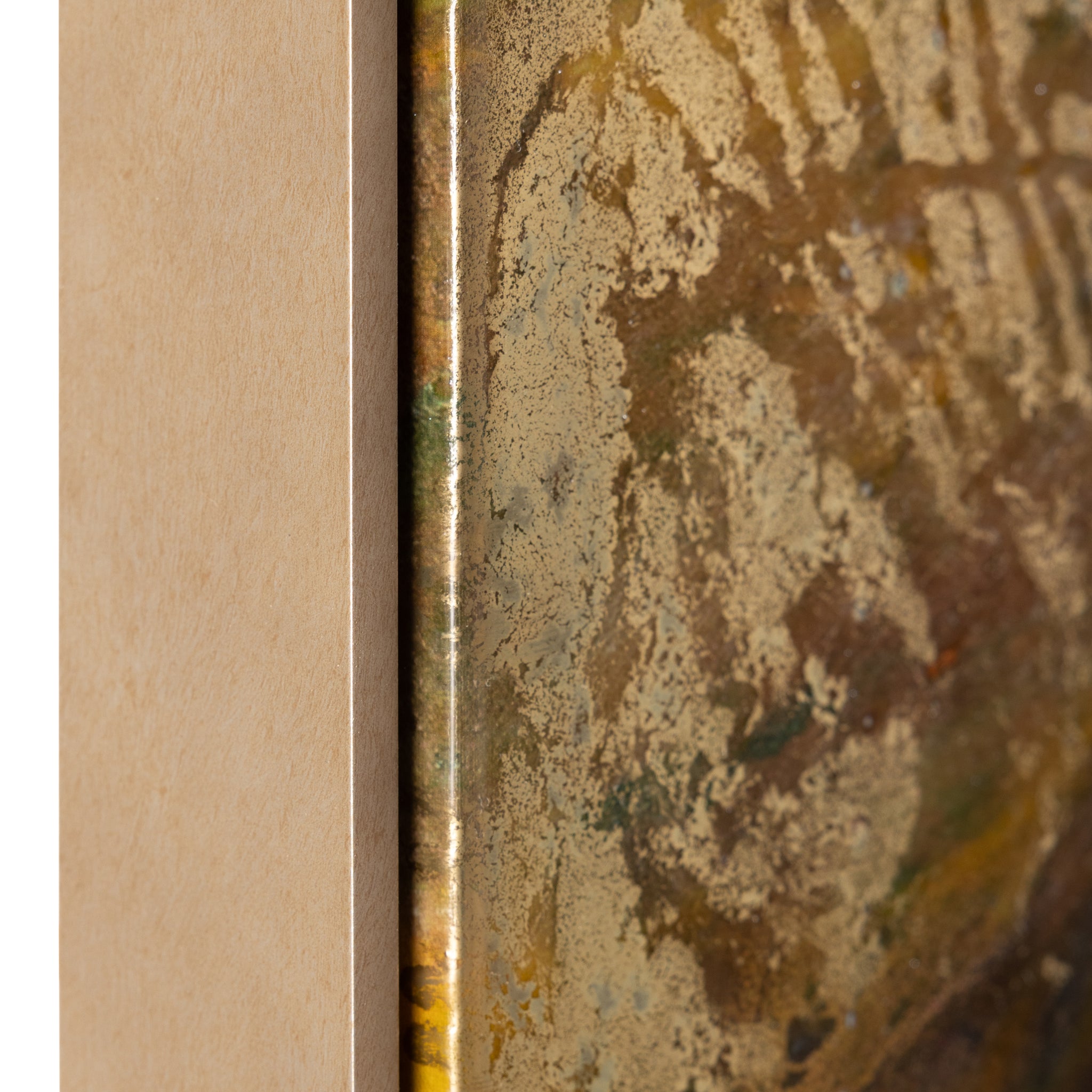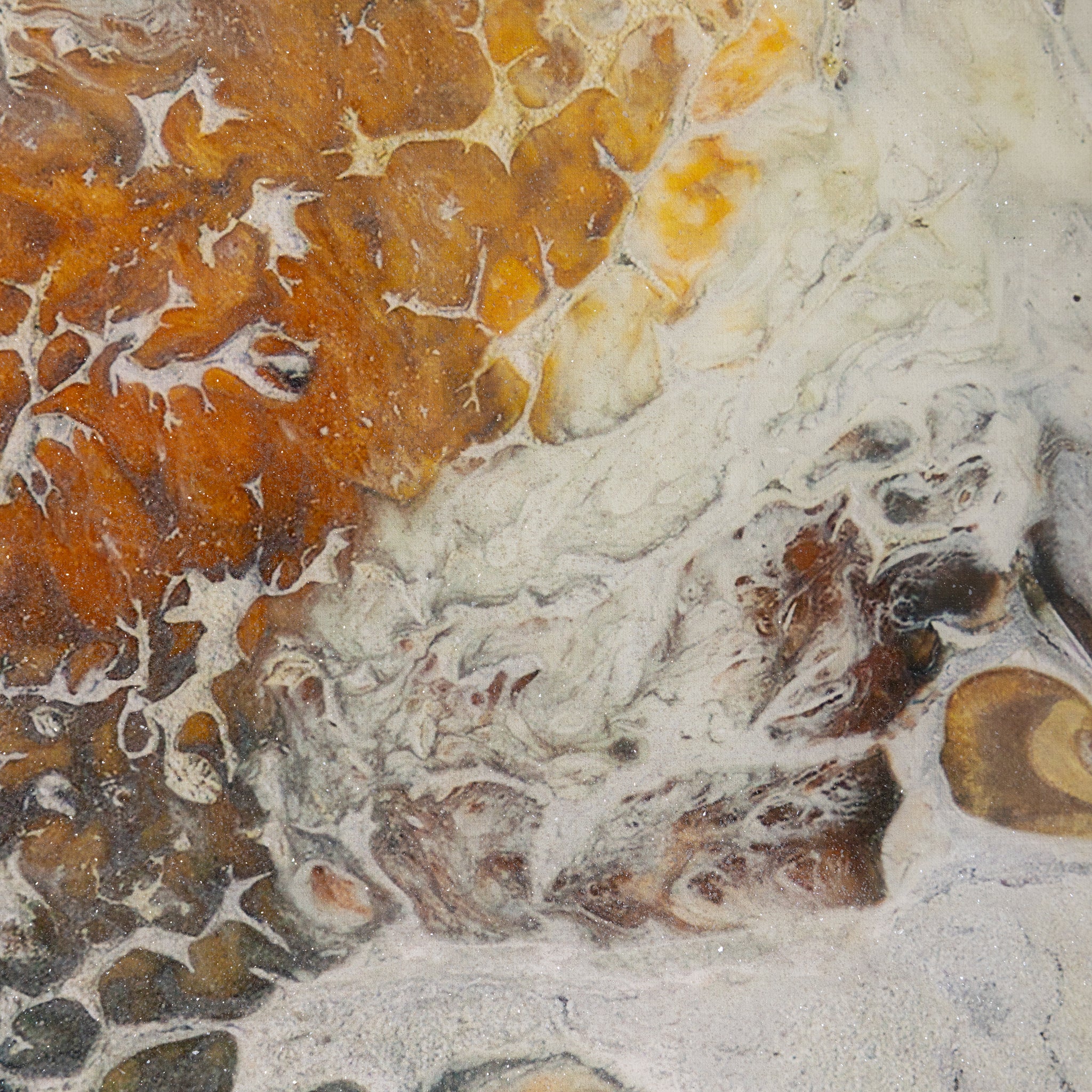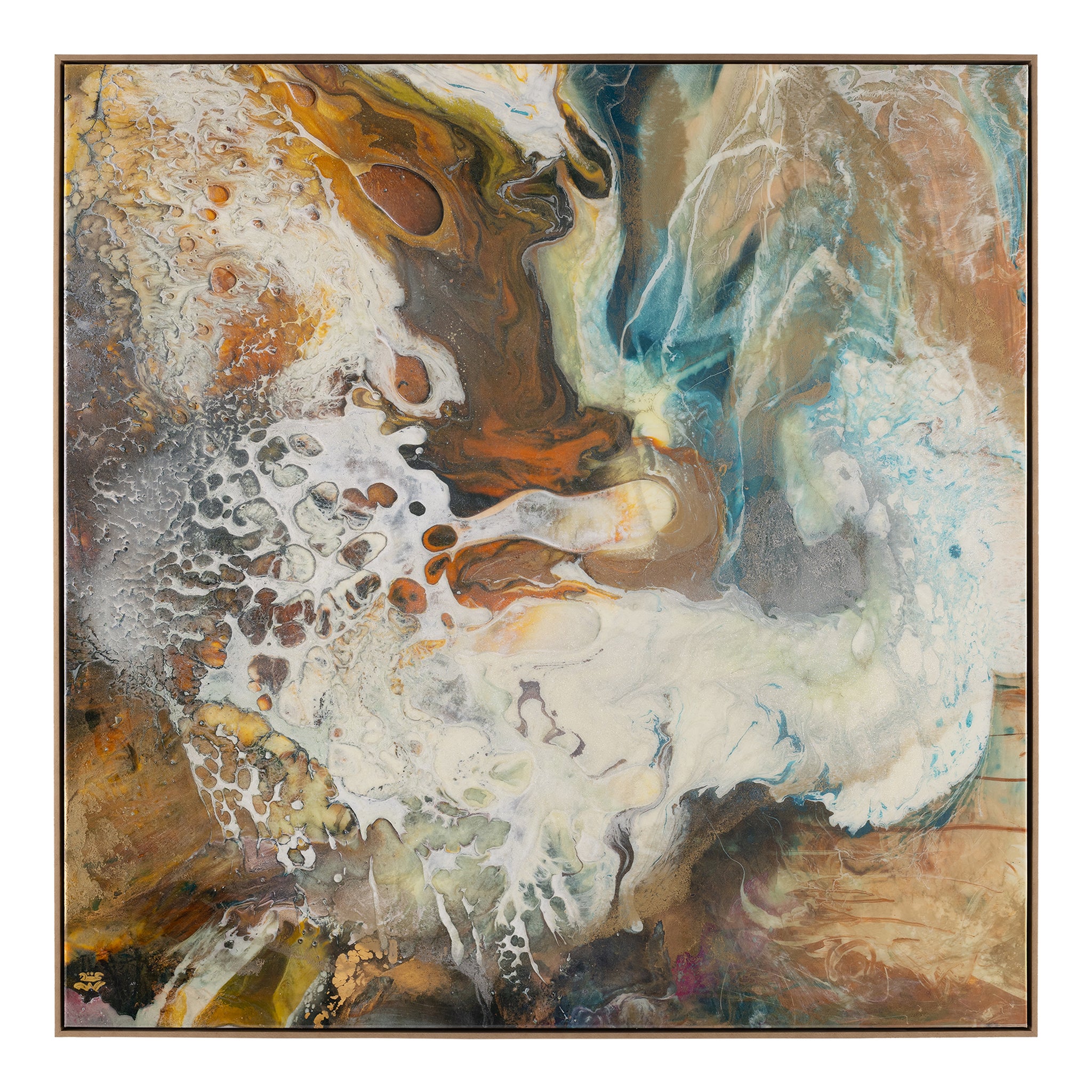 Dragons by artist Brendan Parker is a gorgeous abstract work printed on canvas that showcases a gorgeous ebb and flow in rich tones of gold, blue, and white. The piece is enhanced with a vitreous finish and metallic dust, lending a wealth of texture and visual depth. Displayed in a Champagne floater frame, this artwork is meant to be displayed in a vertical orientation only.