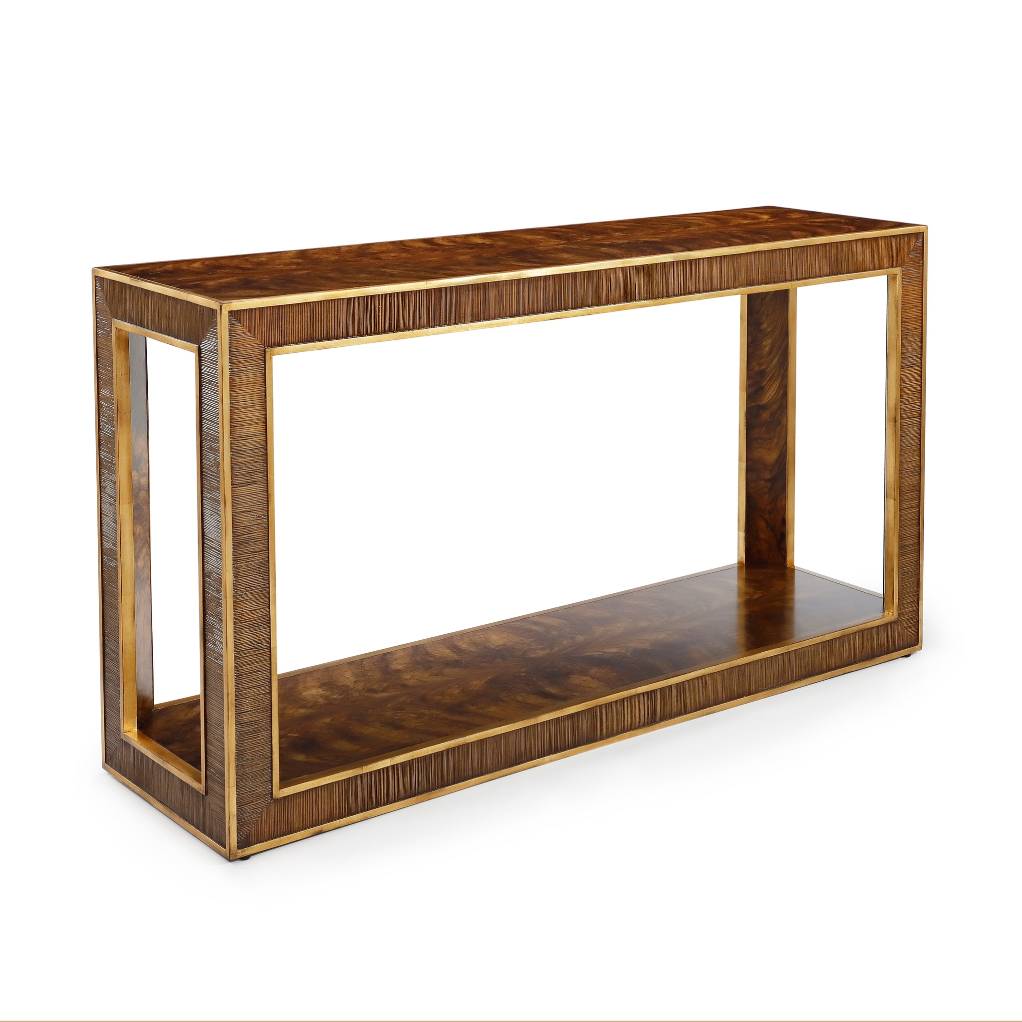The Cadre Console Table features a sleek, geometric silhouette that brings a sense of openness to a space. Sculptural molding finished in Distressed Gold highlights striking zebralli wood grain in a Lucerne finish. Intricate composite texturing along the exterior sides contributes layers of visual depth, greatly enriching the sophisticated aesthetic.