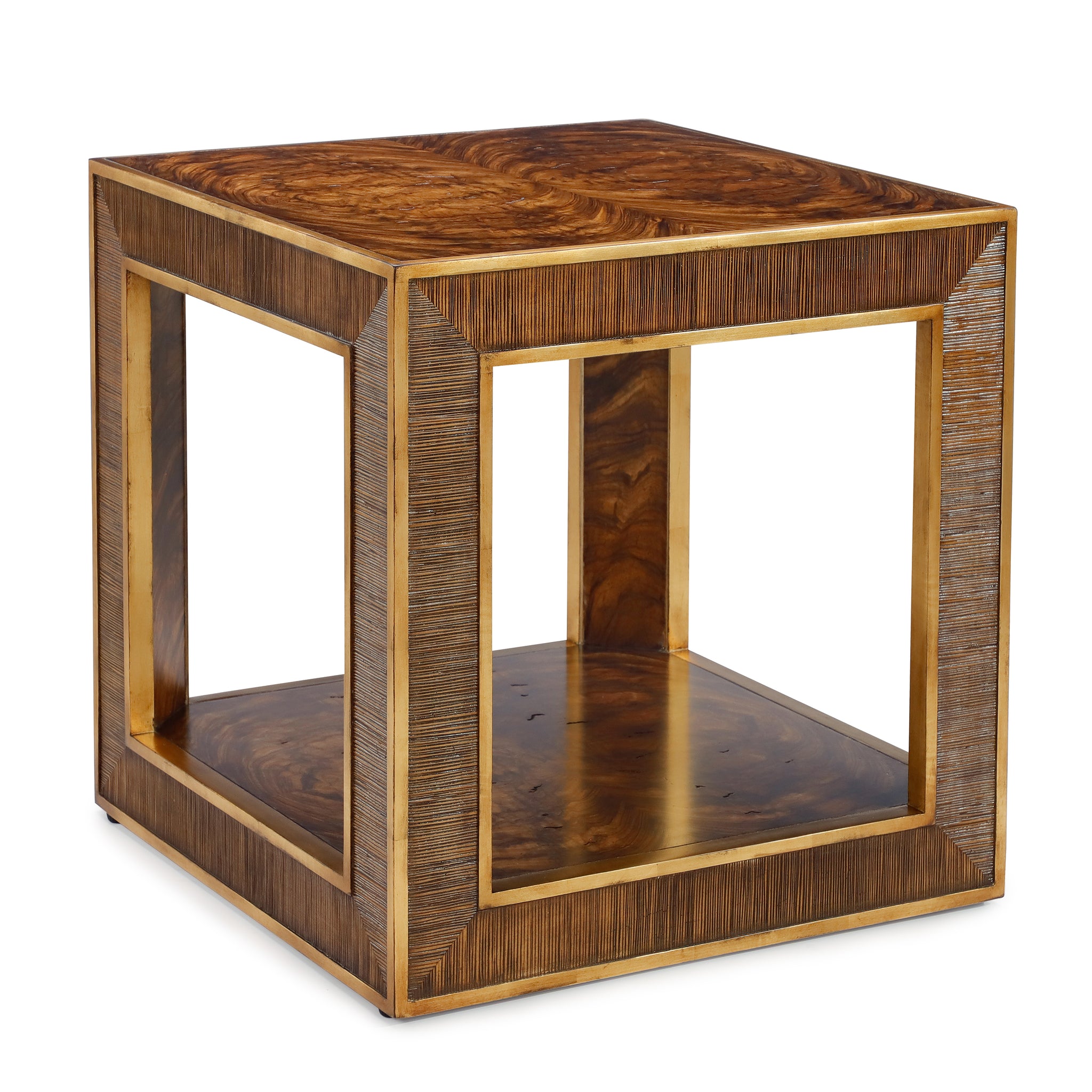 The Cadre Side Table features a sleek, geometric silhouette that brings a sense of openness to a space. Sculptural molding finished in Distressed Gold highlights striking zebralli wood grain in a Lucerne finish. Intricate texturing along the exterior sides contributes layers of visual depth, greatly enriching the sophisticated aesthetic.