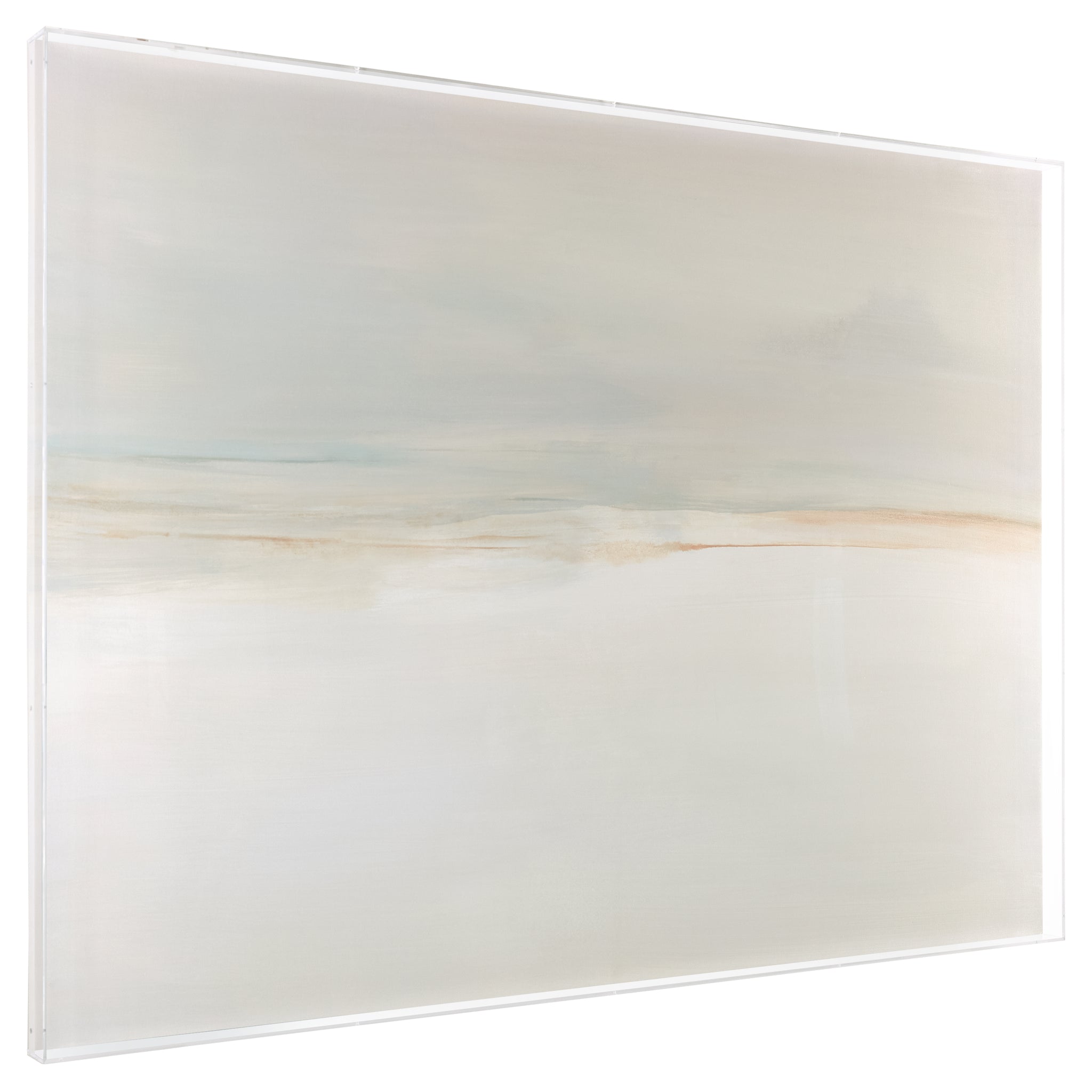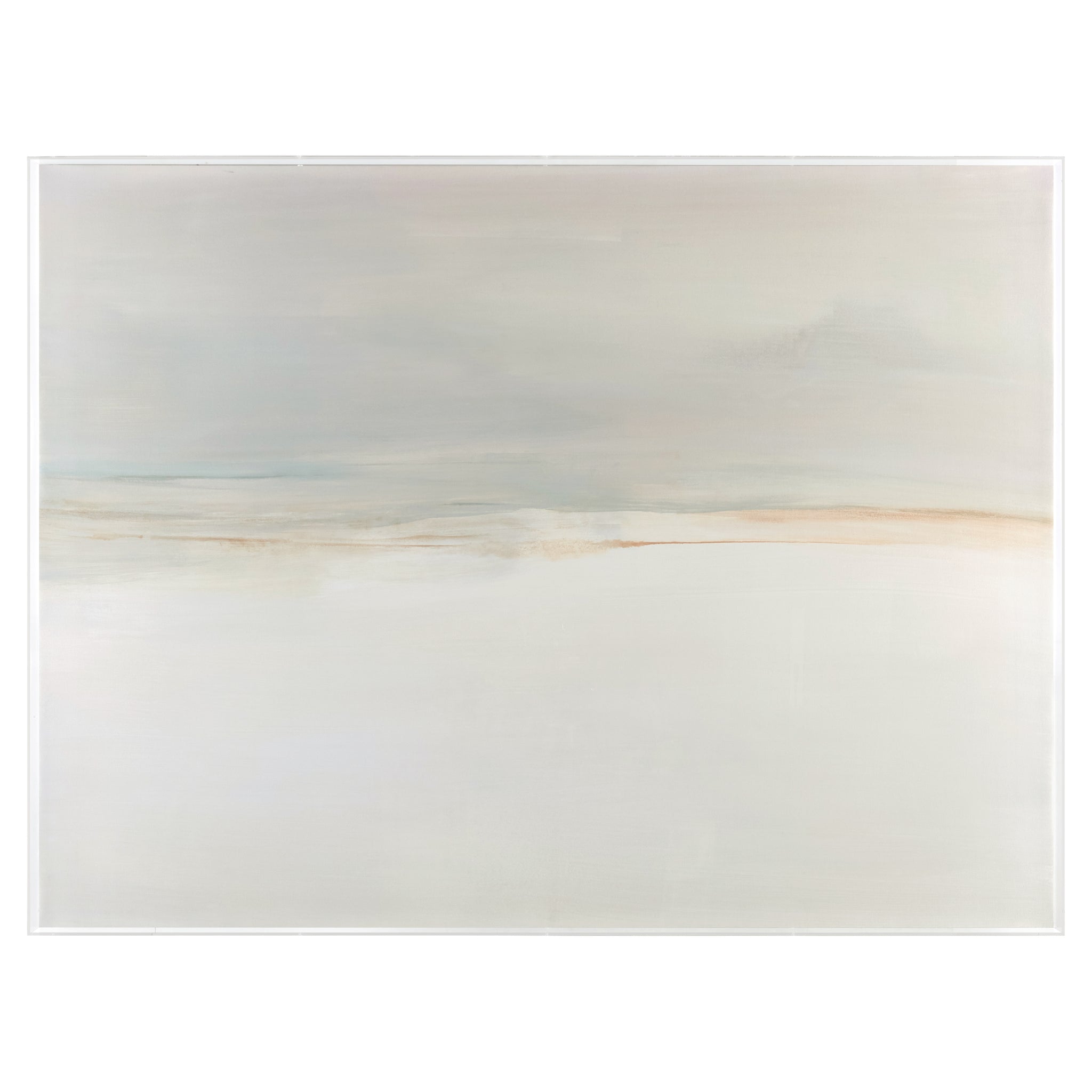 Endless Sky by Carol Benson-Cobb is a giclée print on canvas that captures a soft, tranquil skyline. The muted off-whites and grays blend gently into traces of blue at the top to create a calming, open atmosphere within a space. This contemplative artwork is framed in a clear acrylic box frame, designed for horizontal display only.