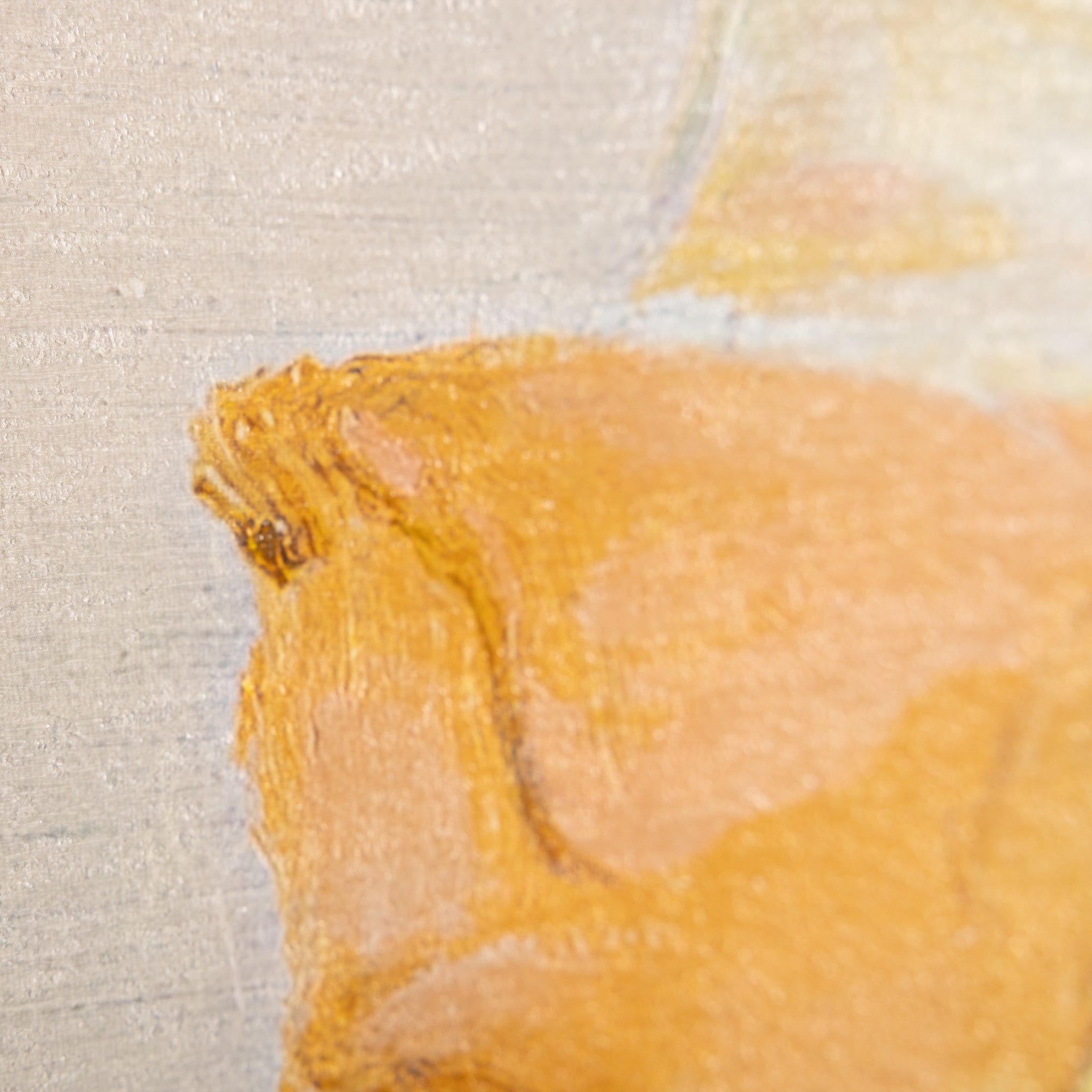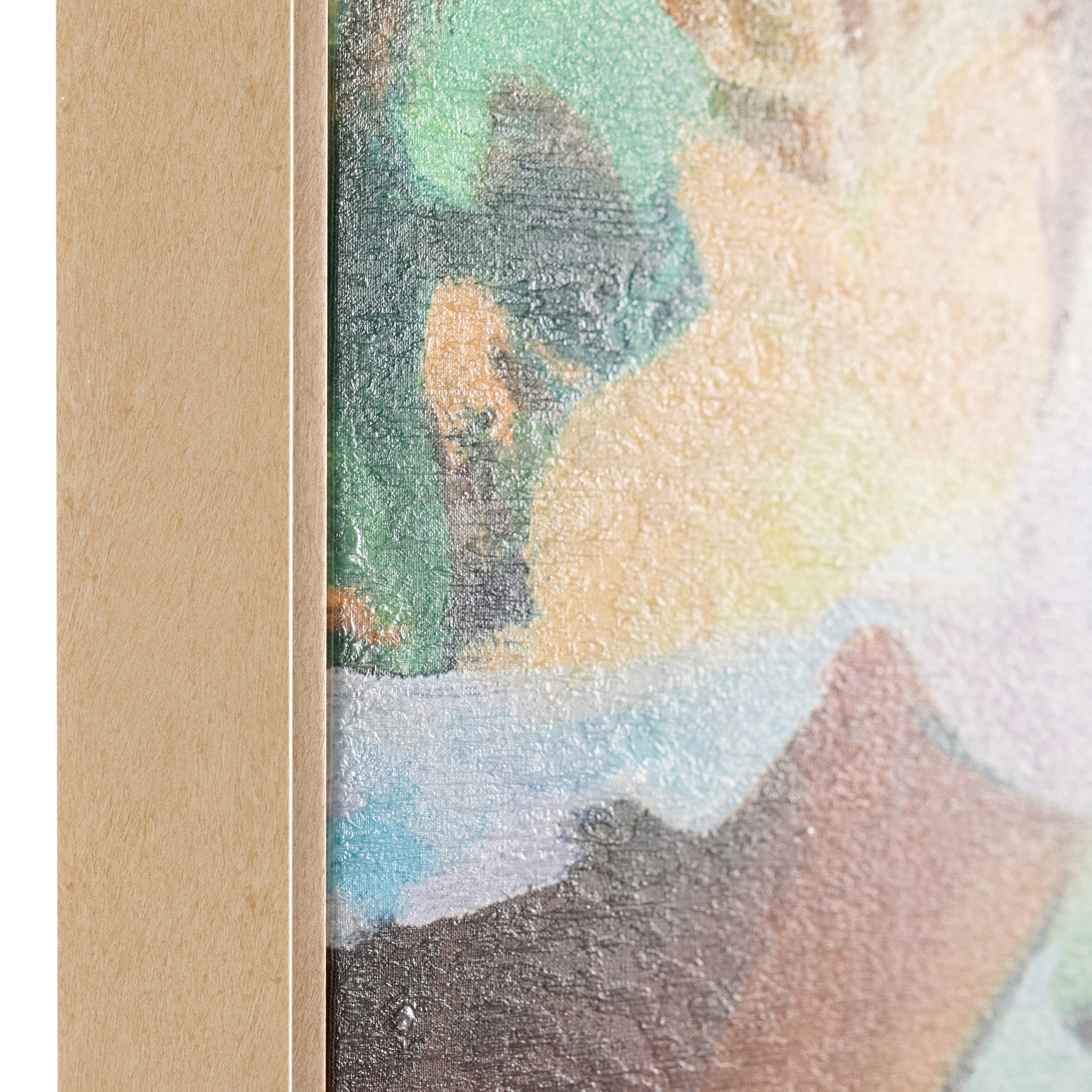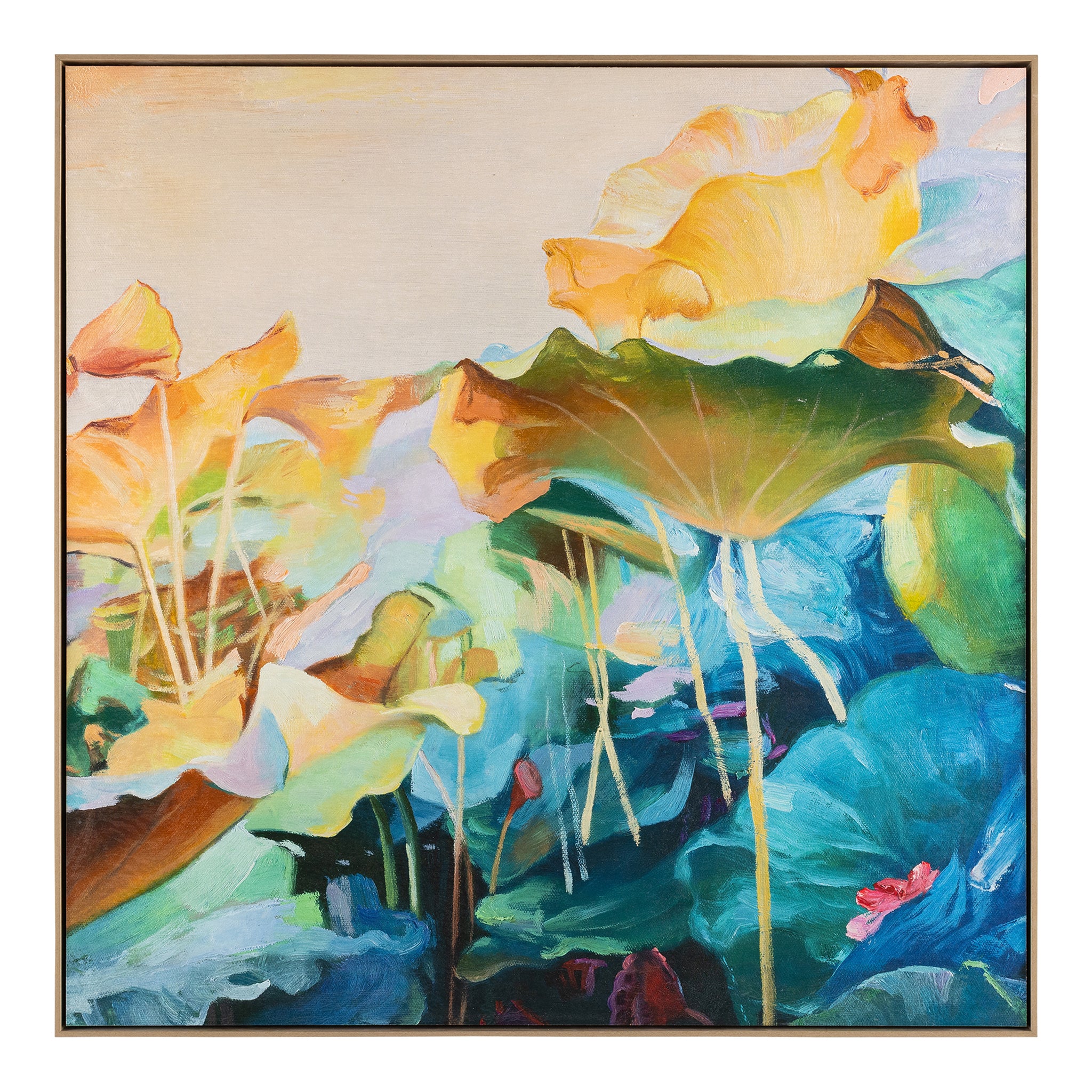 Dreaming is a captivating in-house creation printed on canvas, featuring vibrant florals in orange and blue hues that evoke a dreamlike atmosphere. The addition of a textural matte gel enhances the visual depth, bringing the beautiful tones to life. Set within a champagne floater frame, this piece adds a touch of opulence to the naturally inspired motifs.