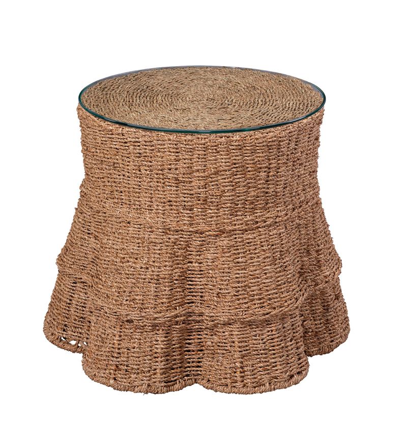 A “tablecloth” of rigid, hand-woven seagrass is draped over a strong metal frame to create this uniquely decorative accent table. The natural reed is topped with glass for stability. The perfect size for a cup of tea or a chilled glass of chardonnay, its tropical inspirations make it a wonderful choice for your casual, comfortable decor.