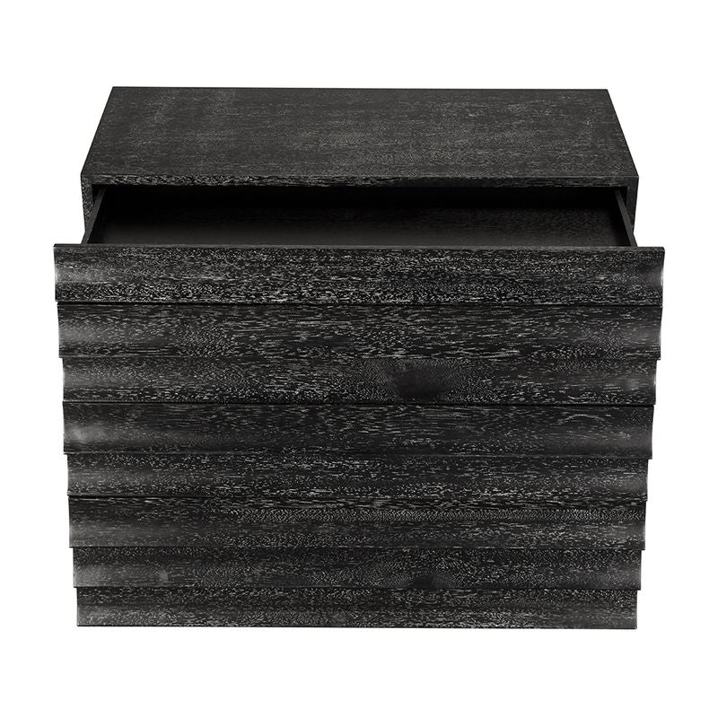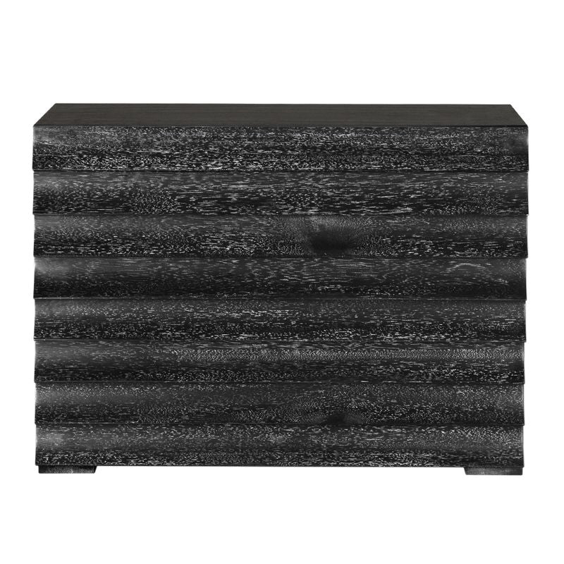 A four-drawer modern black cabinet featuring a ridged, wave-like front that doubles as drawer pulls. Its cerused finish enhances light and shadow, merging brutalist form with artisanal craftsmanship for a sculptural statement.