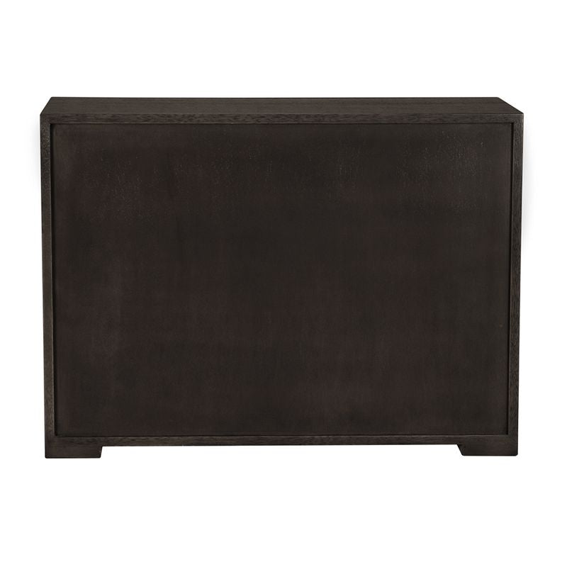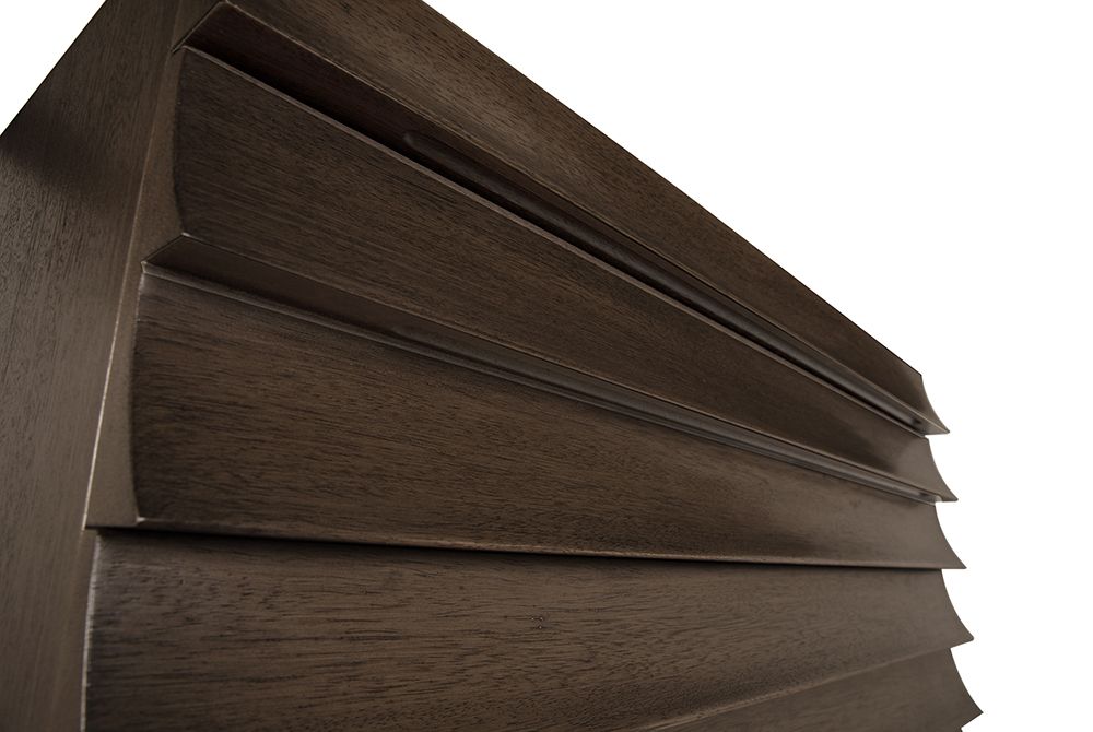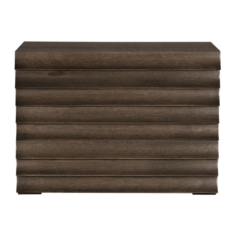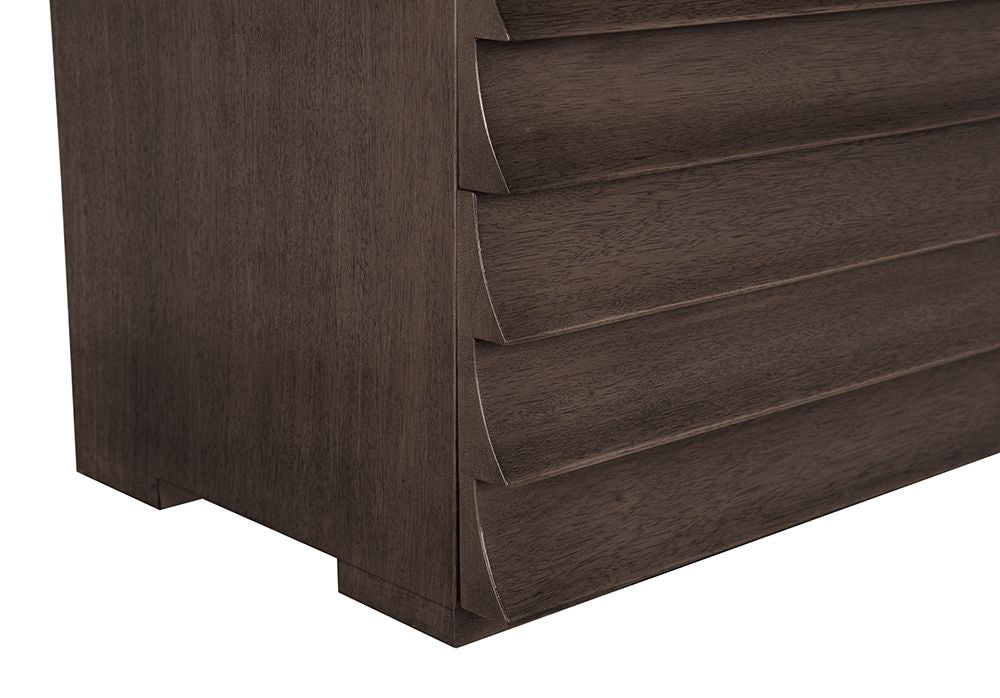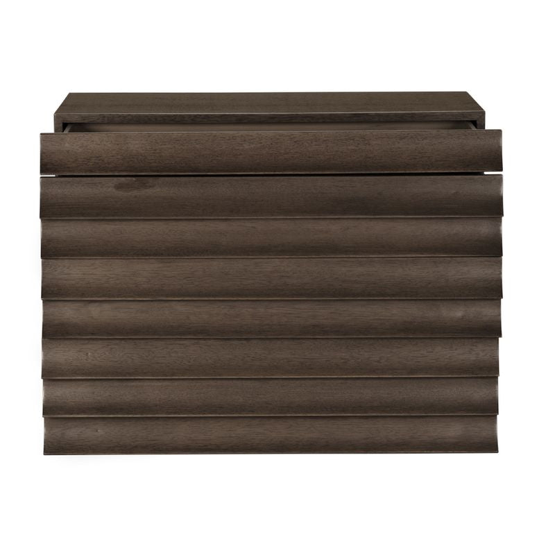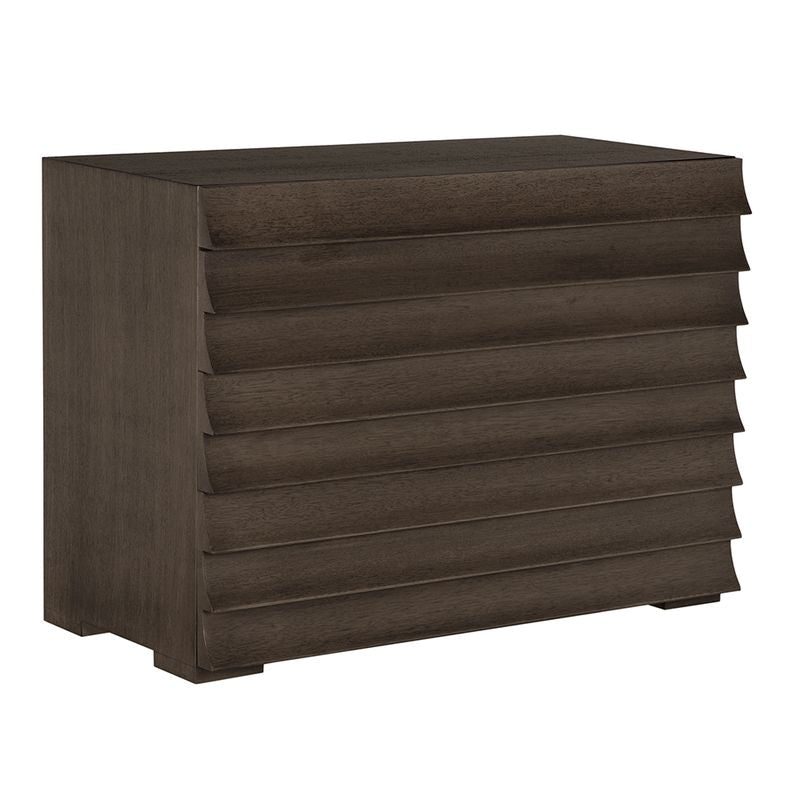 A four-drawer modern Greige finished cabinet featuring a ridged, wave-like front that doubles as drawer pulls. Its fluted front enhances light and shadow, merging brutalist form with artisanal craftsmanship for a sculptural statement.