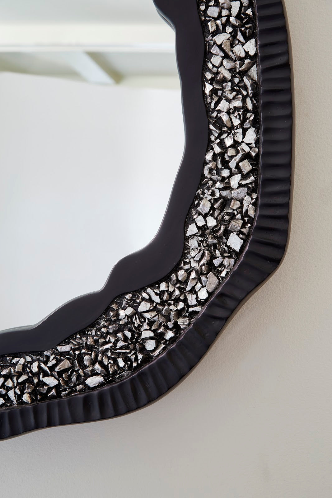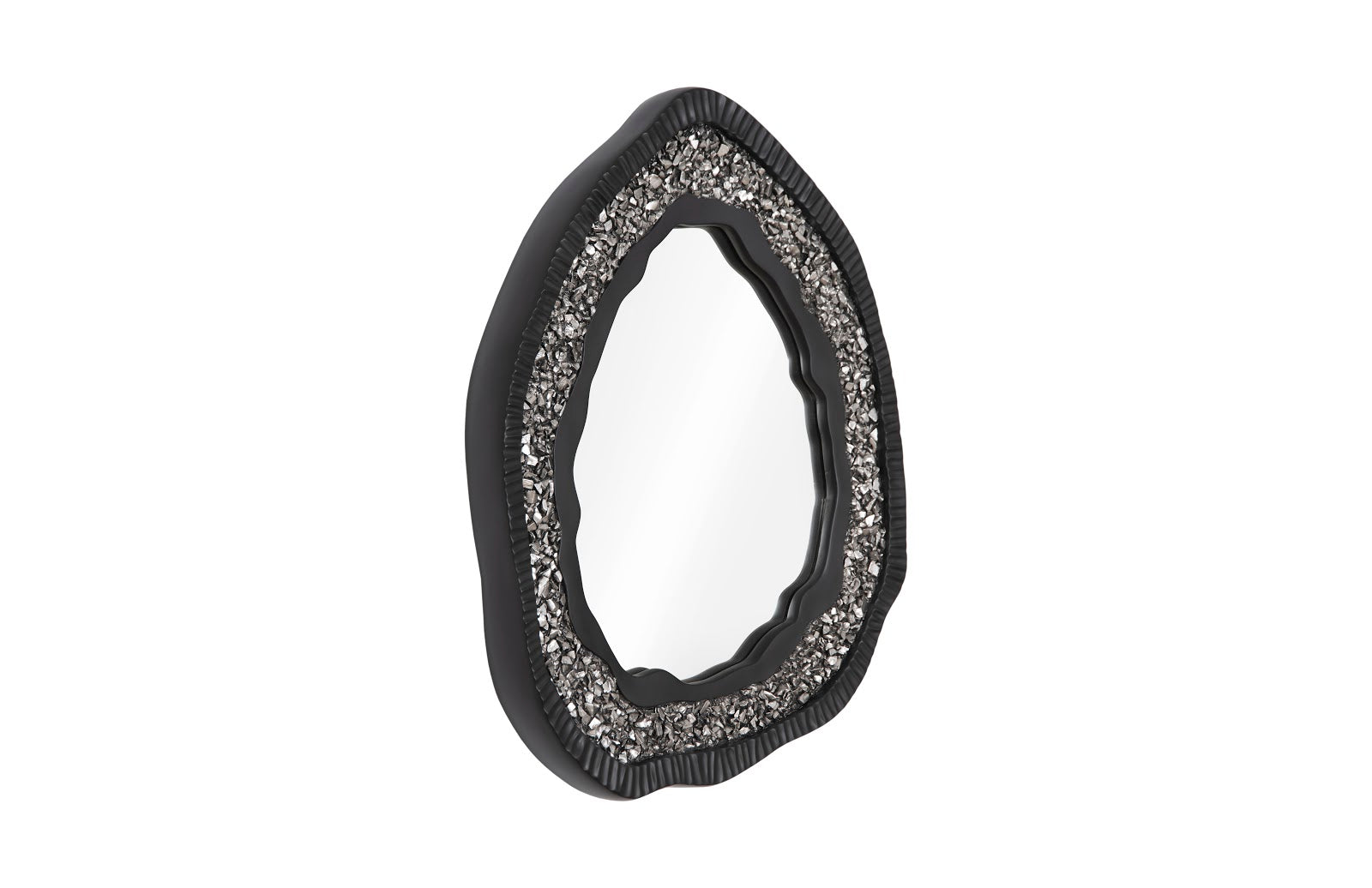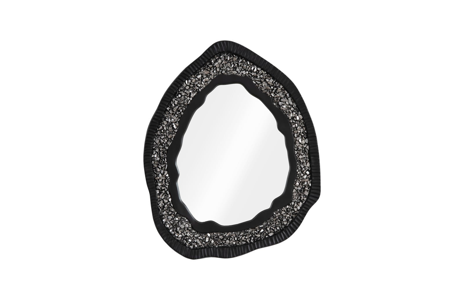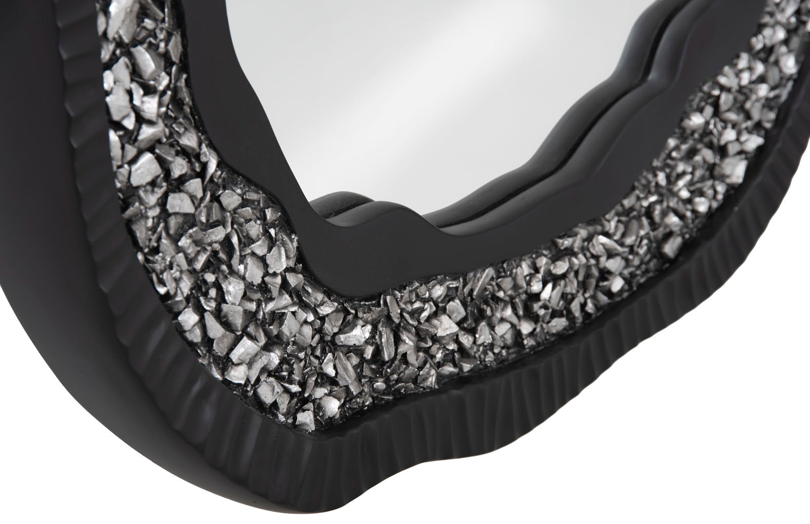 Exhibiting the characteristics of a real piece of glittering stone, the Geode Silver Mirror is a trickster, as it is made of composite in a mix of matte black and silver finishes rather than rock that has developed its sparkle over centuries underground. We cast the silver and black decorative mirror with organic lines to mimic the asymmetrical profile for which real geodes are known. For a warmer color palette, we also offer the Geode in a black and gold combination. These oval mirrors reflect the ethos that Phillips Collection personifies: modern organic.