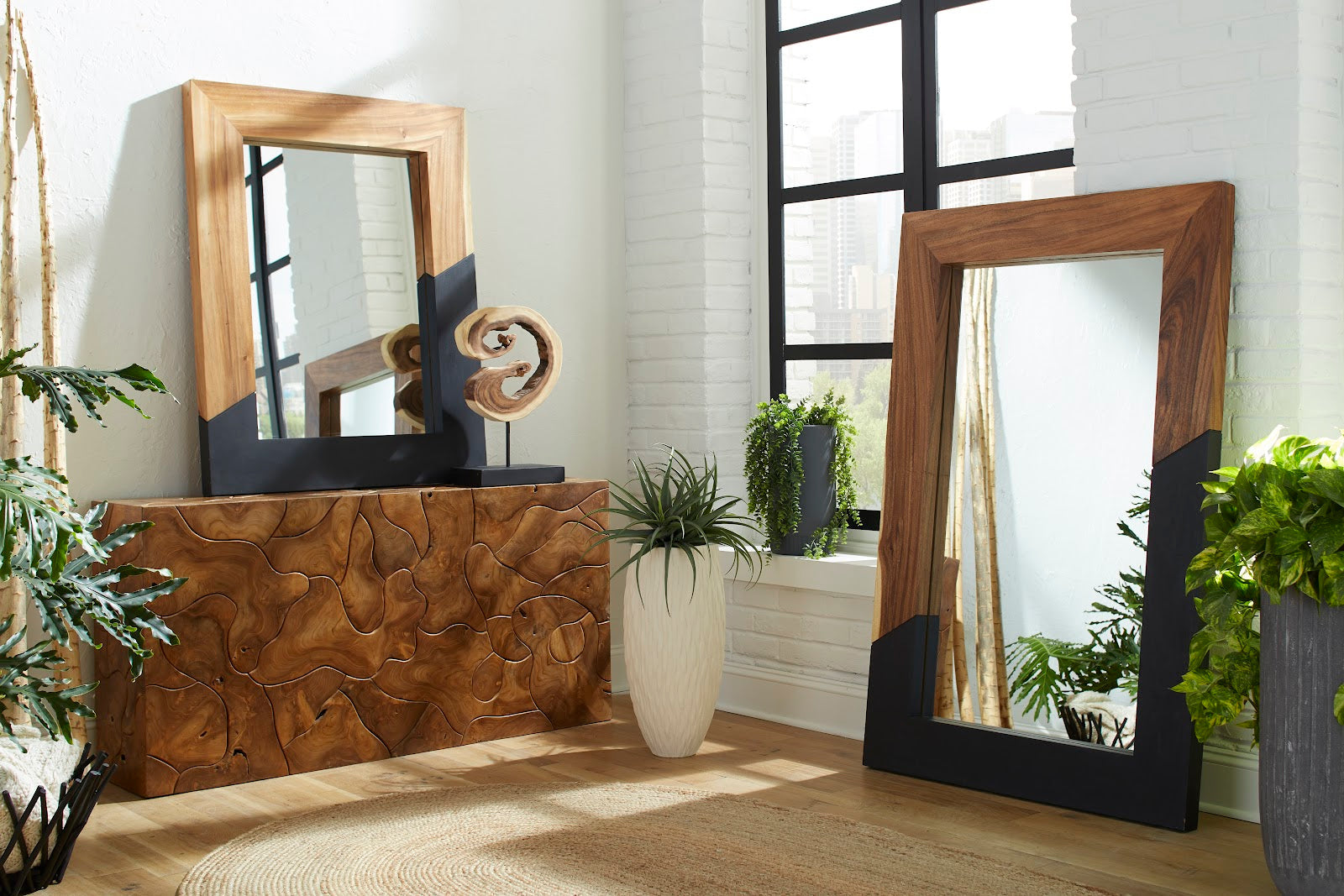 Playing around with shapes is one of the main implements in our tool kit at Phillips Collection. In combining the deepest black and natural wood on slant, as we have with our Geometry Small Natural Mirror, we’ve created a sophisticated profile that brings organic warmth and contemporary cleanness to a space. The surface variations of the woodgrain also bring texture into a room. We have a wide array of shapes in coffee tables, console tables, and side tables in this collection, as well as tables in a gray finish, and stools and wall tiles. The decorative mirrors come in small and large sizes. Each of these reflects the ethos that we personify: modern organic.
