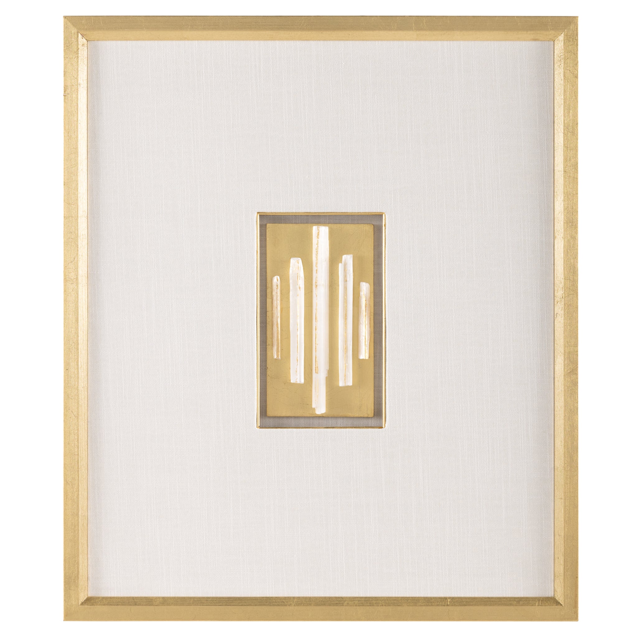 Gold Selenite is a striking in-house creation that features an elegant arrangement of natural selenite stone set against a gold leaf backdrop. The composition is presented within a rustic frame, hand-gilded in gold leaf and accented with a matching filet and white linen mat. This panel is designed for vertical display only.