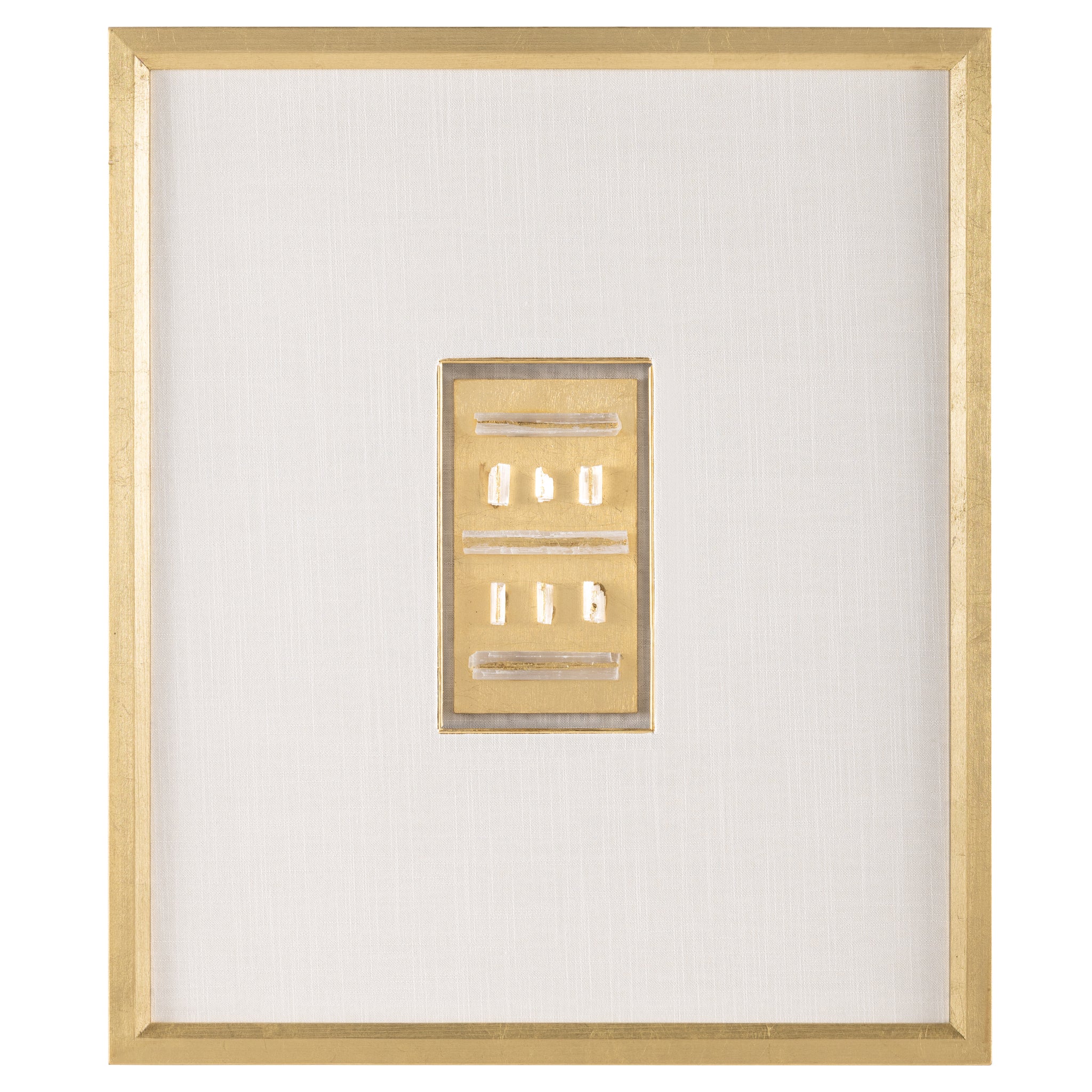 Gold Selenite is a striking in-house creation that features an elegant arrangement of natural selenite stone set against a gold leaf backdrop. The composition is presented within a rustic frame, hand-gilded in gold leaf and accented with a matching filet and white linen mat. This panel is designed for vertical display only.