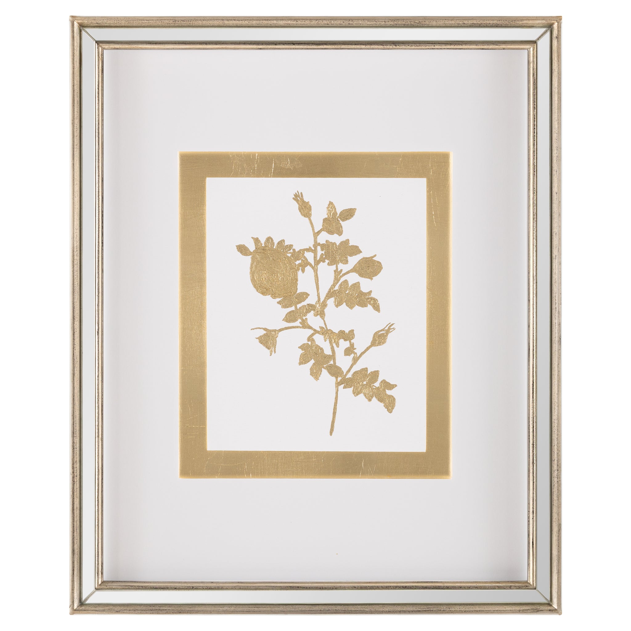 Golden Botanicals is an in-house production printed on watercolor paper that showcases elegant gold leaf florals with matching background trim. The piece is held within a Champagne mirror frame and may only be displayed from a vertical orientation.