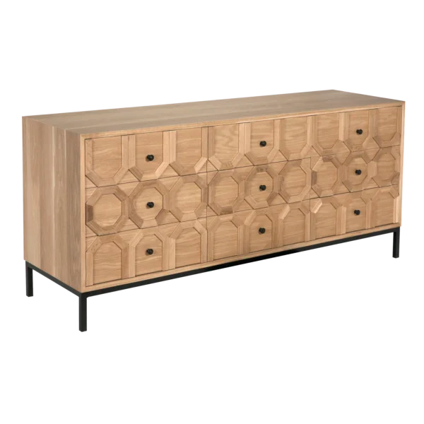 The Hadley Buffet in Natural Oak is a signature piece. Handcrafted in the USA, it is celebrated for its industrial-meets-organic aesthetic, pairing rugged, high-quality wood with a minimalist steel foundation.