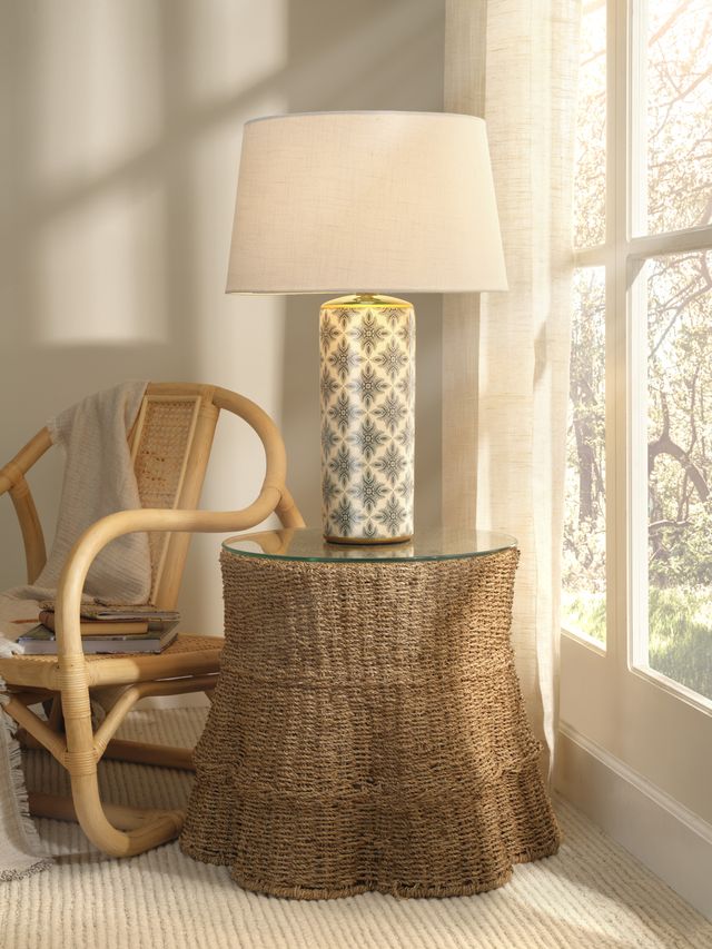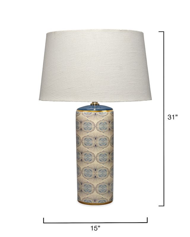 The repeating pattern on these colorful lamps is hand stamped by expert artisans onto a cream ceramic base. Additional hand-painted touches in green and gold amp up the impact! Jamie tops it with a white linen drum shade and coordinating brass ball finial. Place one next to a comfortable upholstered armchair to create a welcoming reading nook.