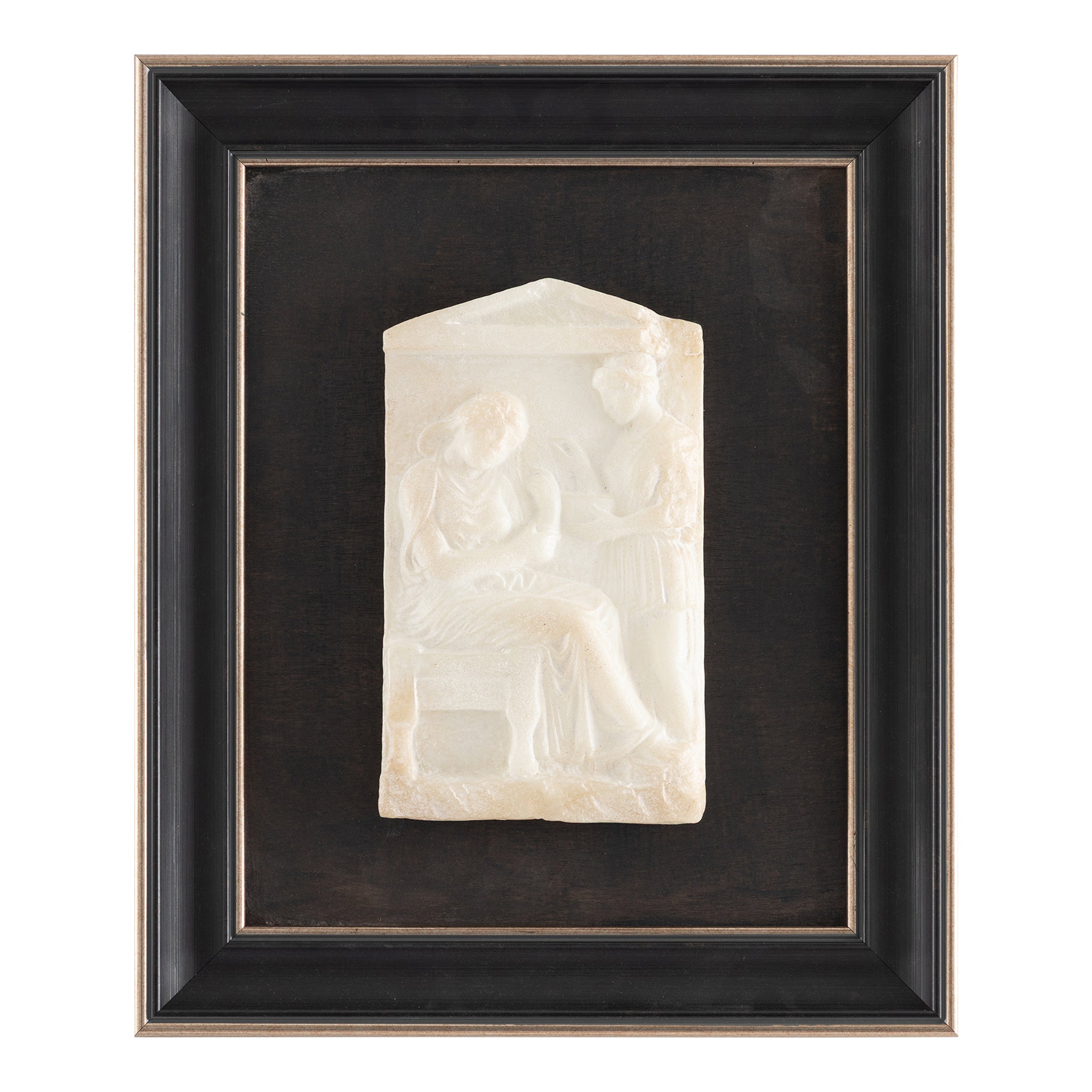 The Hellenistic Relief Wall Art is a timeless tribute to the artistic mastery of ancient craftsmen. A fragmented composite relief captures two feminine figures in striking detail. The silver frame with matching silver fillet is complemented by the deep blacks of the molding and backdrop, enhancing the piece with a dramatic presence.