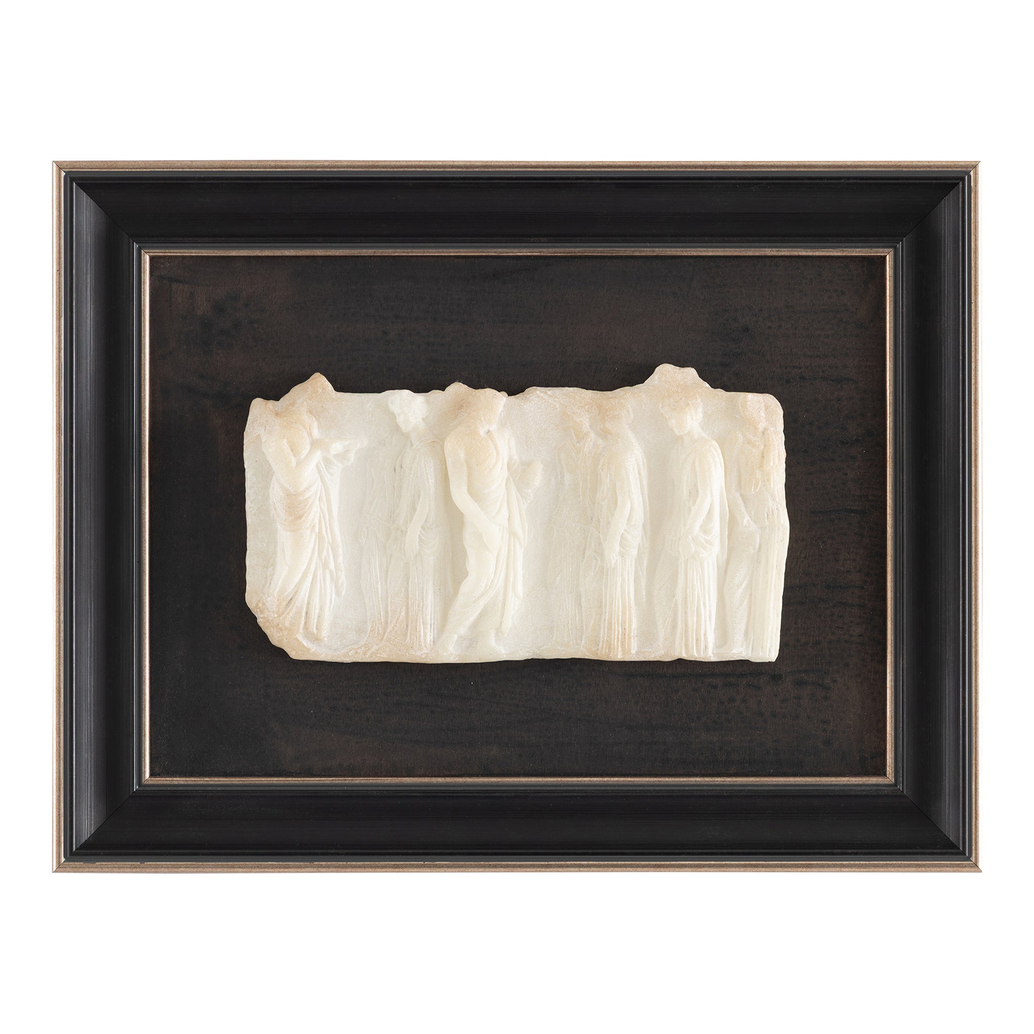 The Hellenistic Relief Wall Art is a timeless tribute to the artistic mastery of ancient craftsmen. A fragmented composite relief captures several robed figures in striking detail. The silver frame with matching silver fillet is complemented by the deep blacks of the molding and backdrop, enhancing the piece with a dramatic presence.