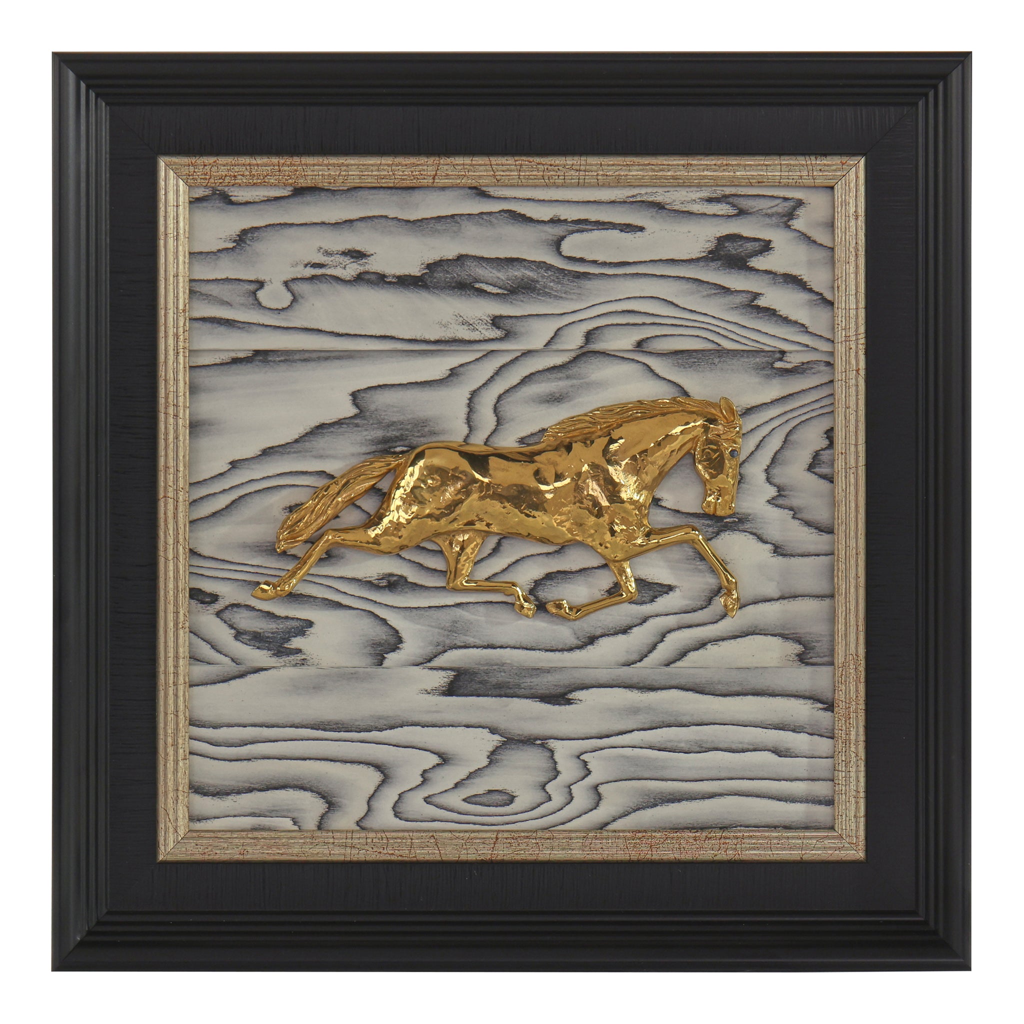 Hoofbeats in the Wind is an elegant wall panel featuring an intricately detailed Polished Brass horse mid-gallop, gracefully set against a dramatic black-and-white backdrop of ethereal, swirling waves. The dynamic composition is displayed in a molded black frame with a refined brass fillet, adding a touch of sophistication to the piece’s striking presence.