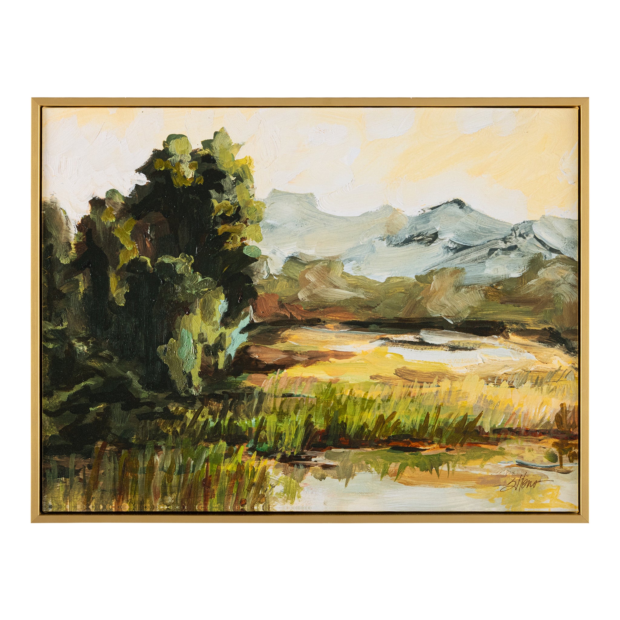 Mini Landscapes by artist Jackie Ellens is a majestic print on canvas that depicts a vast, verdant landscape. A satin finish has been applied to the artwork, bringing the natural color palette to life. The piece is held within a gold floater frame and may only be displayed in a horizontal orientation.