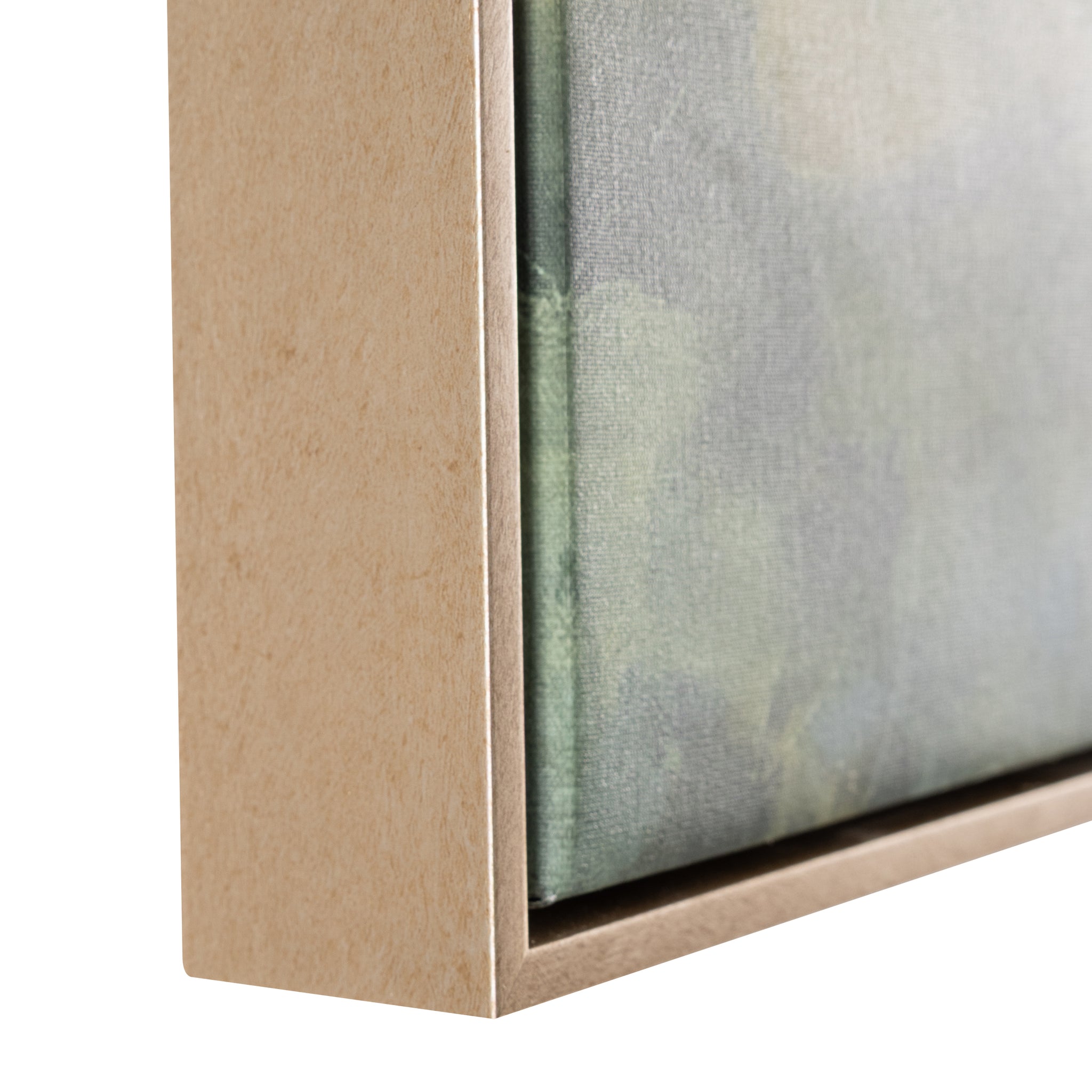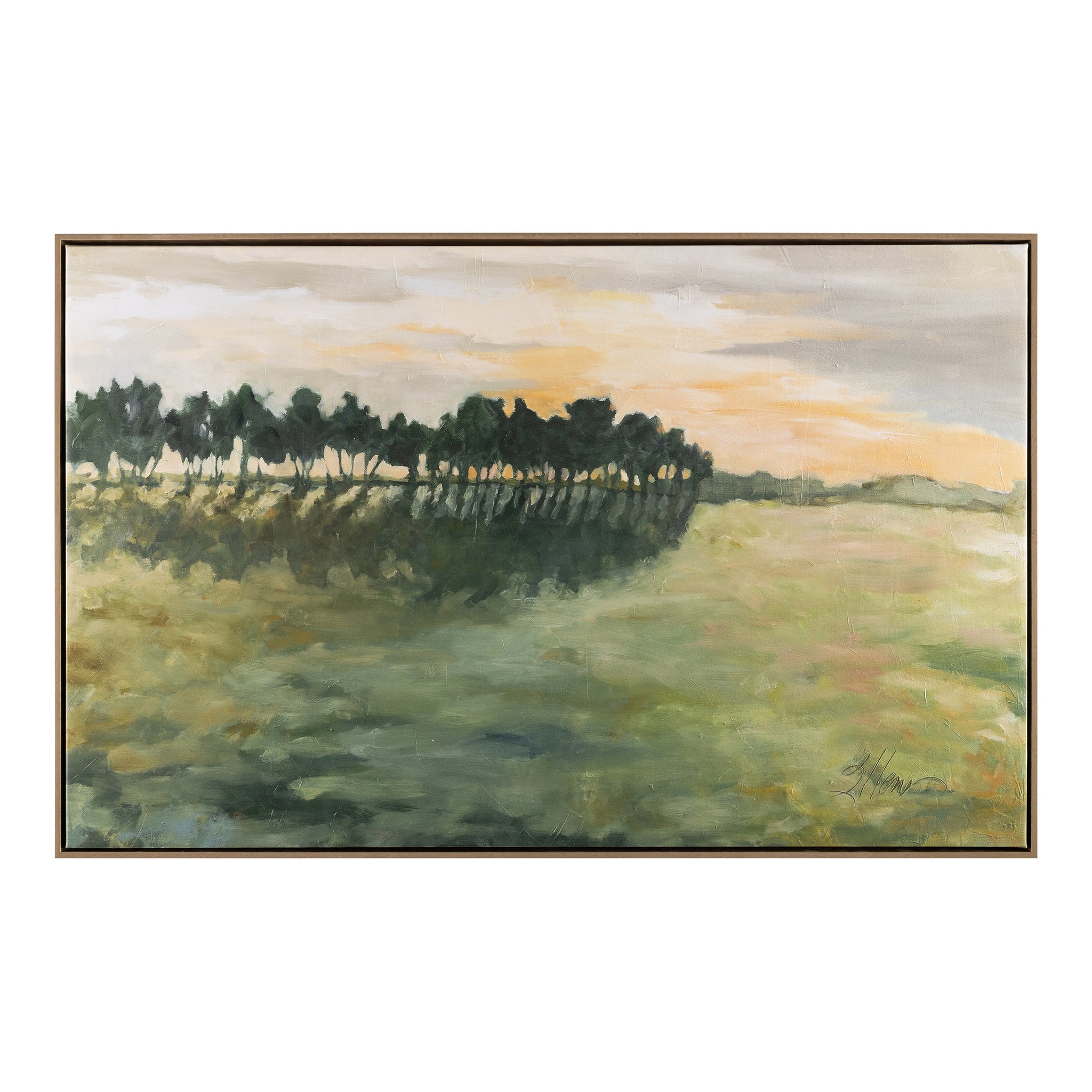 Reminiscence by artist Jackie Ellens is a captivating print on canvas, one half of a horizontal diptych. This section features a small grove among a vast, verdant landscape. A smooth satin finish enhances the piece, lending an air of elegance and refinement. The artwork is held within a champagne frame, contributing luxurious gold tones to complete the look.
