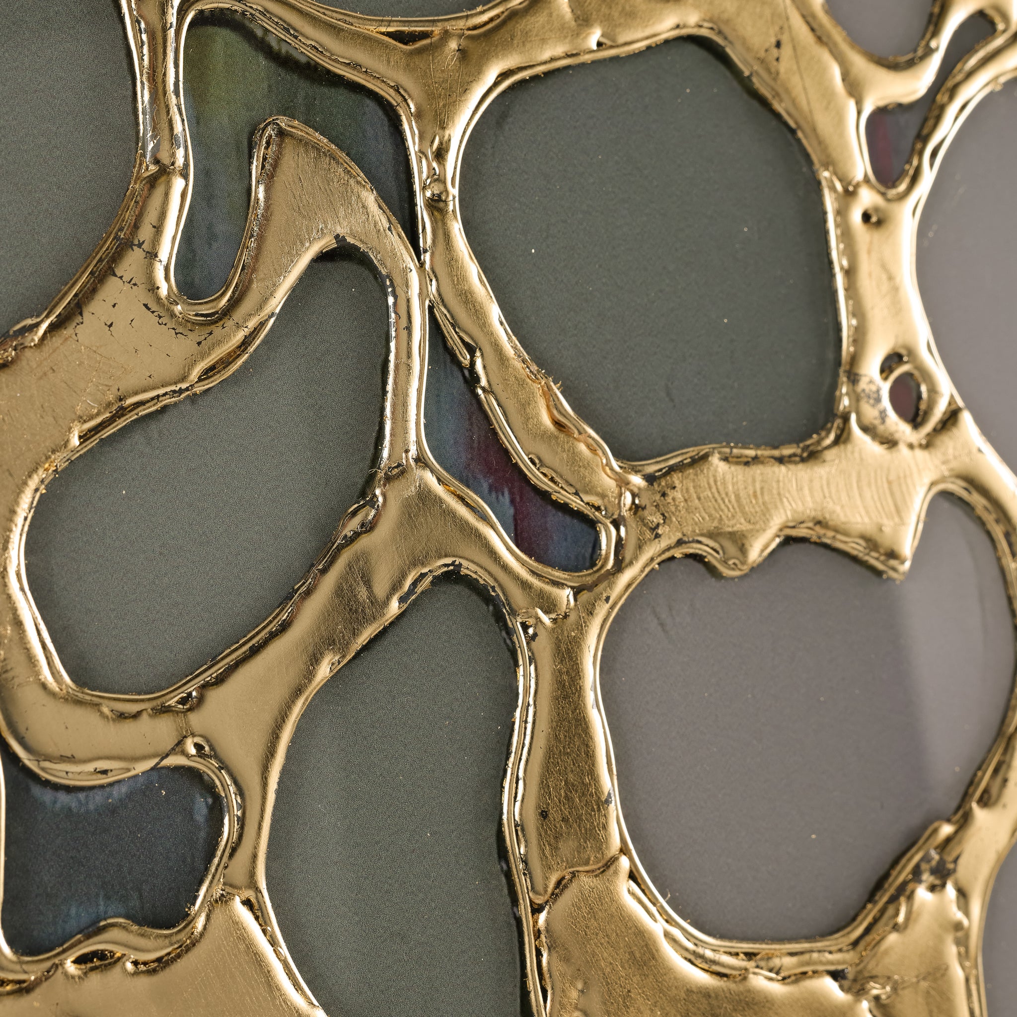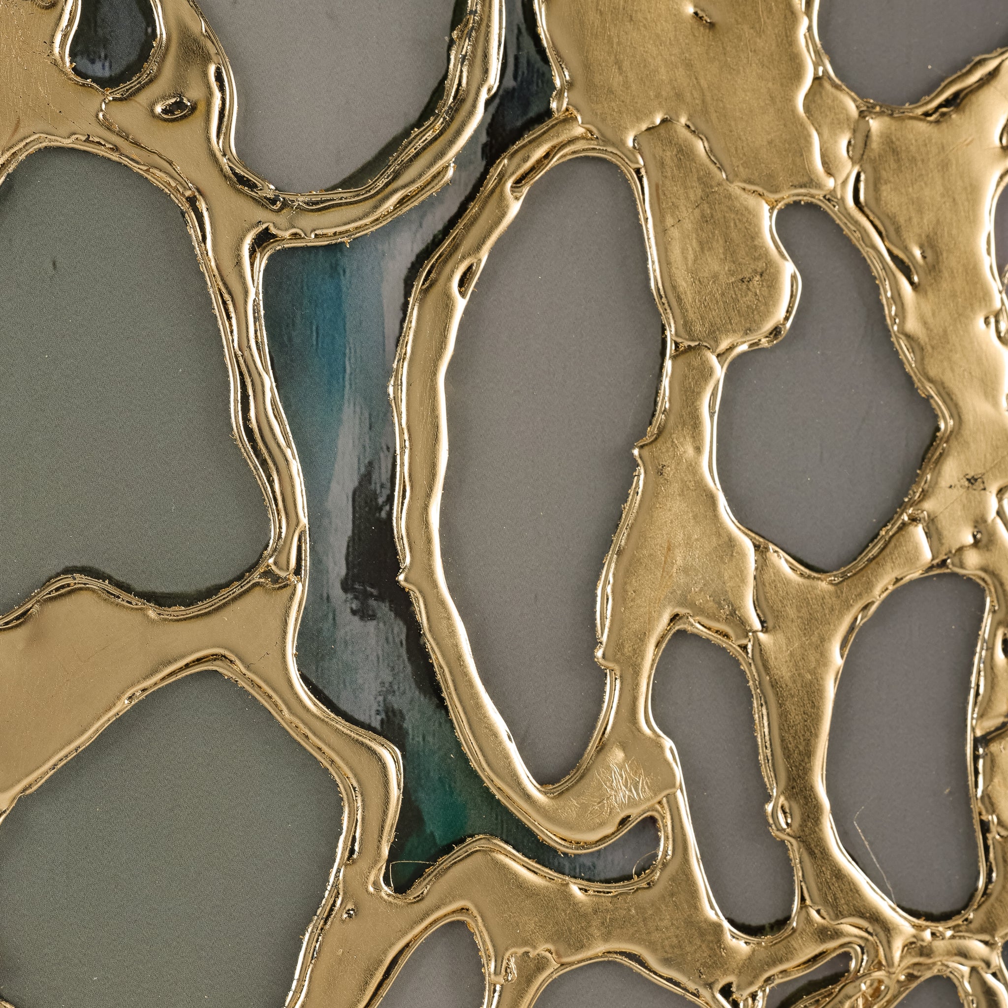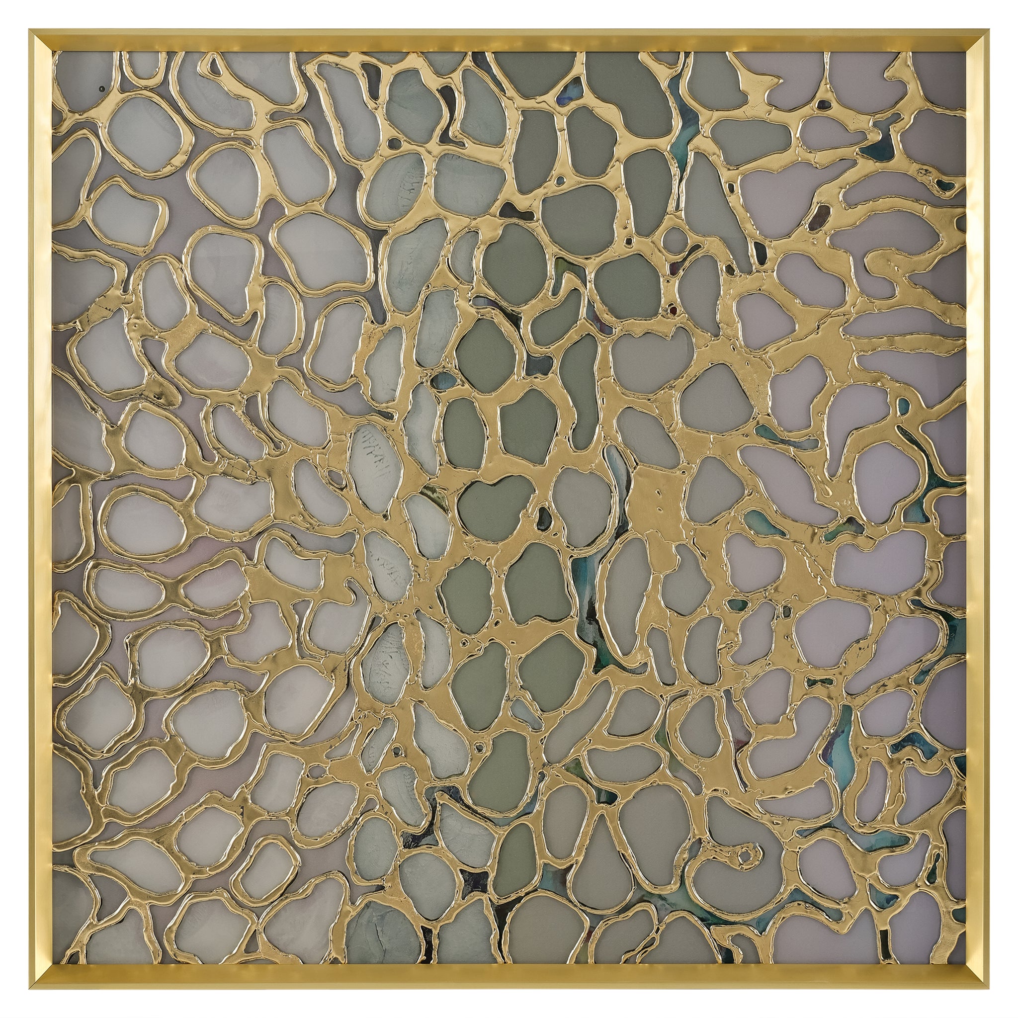 Unearthed by artist Kate DeOssie is a stunning print on acrylic that showcases a captivating organic mesh, enhanced with raised gold leaf. The flowing, abstract forms harmonize beautifully with the rich gold accents, creating a striking contrast that contributes a wealth of texture and depth. This exquisite artwork is framed in a gold wedge gallery frame, complementing the composition's luxurious tones.