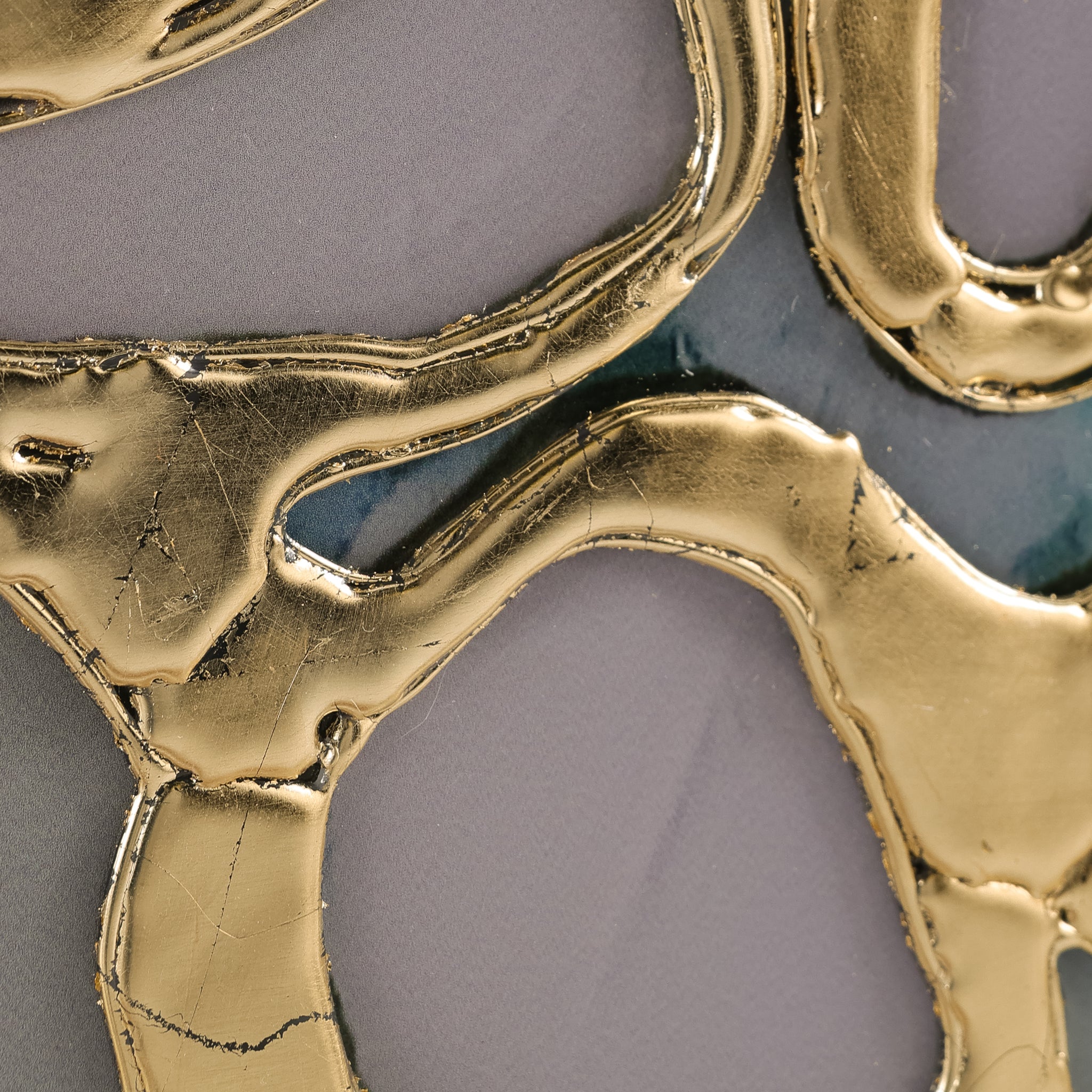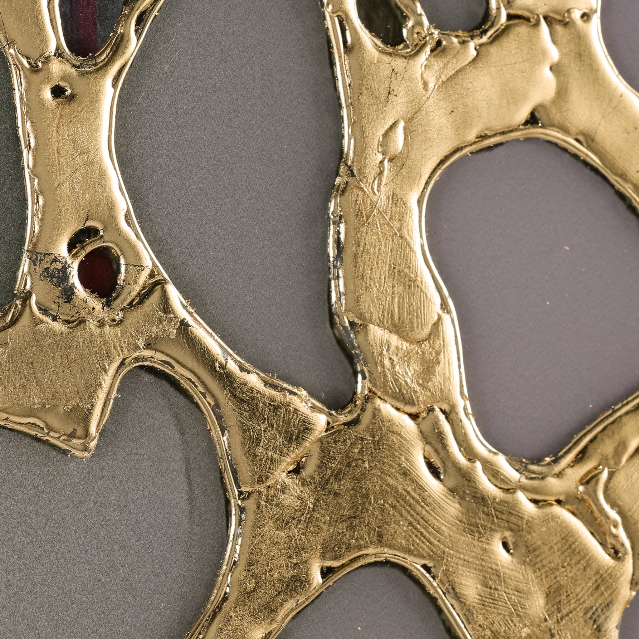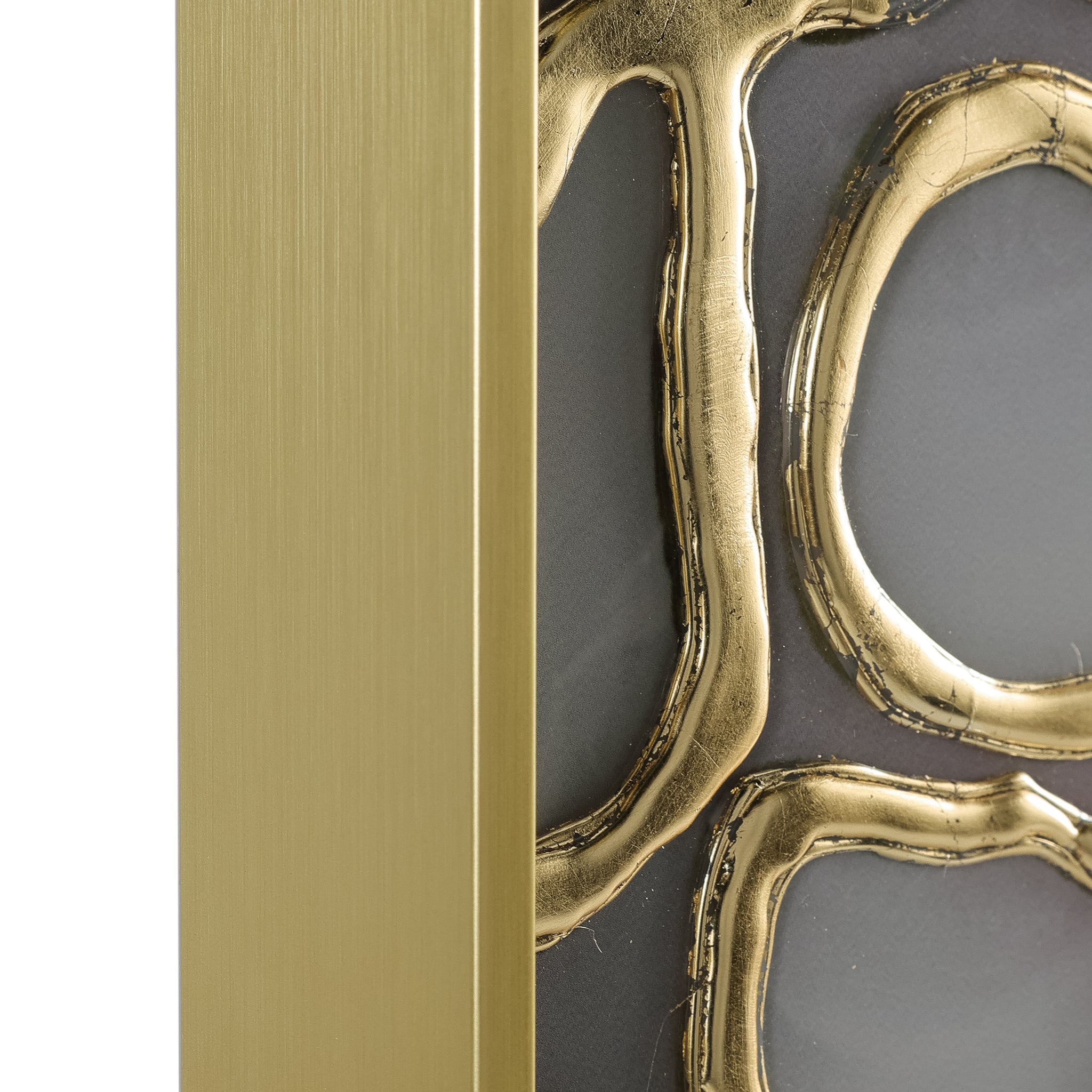 Unearthed by artist Kate DeOssie is a stunning print on acrylic that showcases a captivating organic mesh, enhanced with raised gold leaf. The flowing, abstract forms harmonize beautifully with the rich gold accents, creating a striking contrast that contributes a wealth of texture and depth. This exquisite artwork is framed in a gold wedge gallery frame, complementing the composition's luxurious tones.