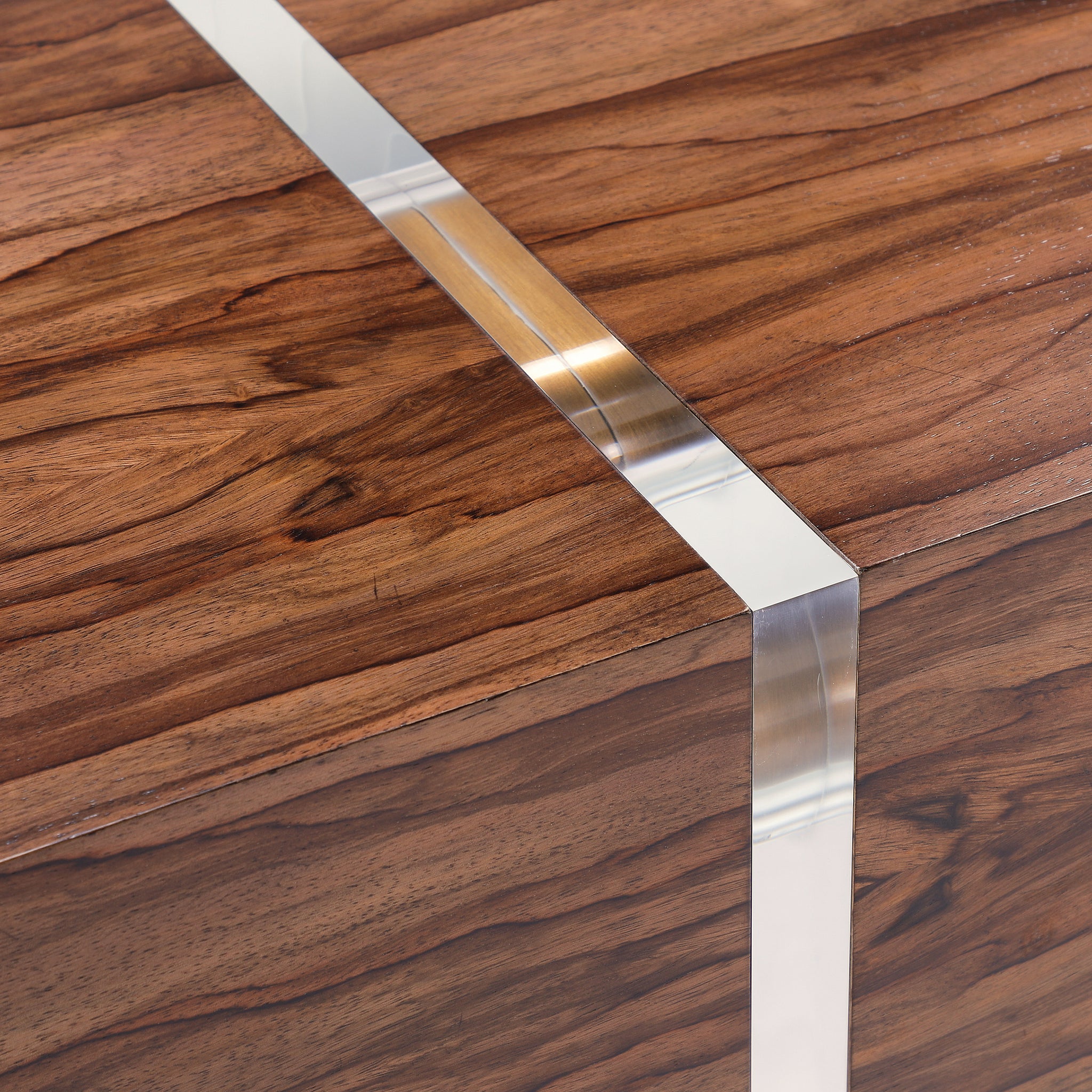 The Loftus Console Table showcases a sleek, contemporary design with beautiful natural tones. Crafted from ofram wood, the rectangular surface is adorned in a Olive Brown finish that gracefully highlights the organic grain patterns. Two acrylic slab supports run seamlessly through the body, enhancing the design with a modern touch. The look is completed by subtle steel fittings in radiant Aztec Gold tones.