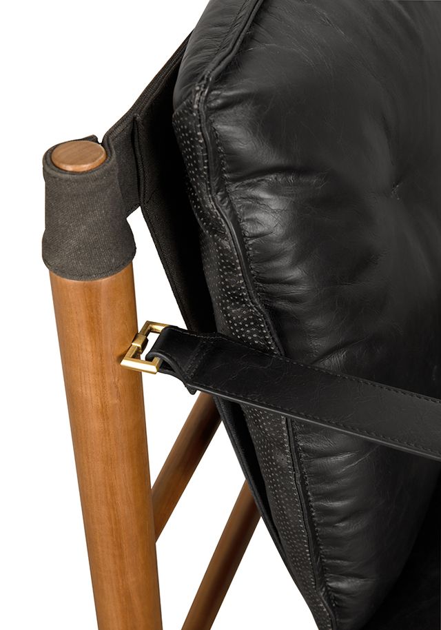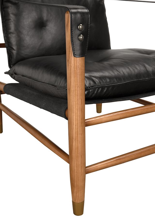 This chair features a Dark Walnut frame paired with Ebony Black leather and canvas details. Its clean lines and material contrast create a sophisticated, mid-century modern-inspired armchair.