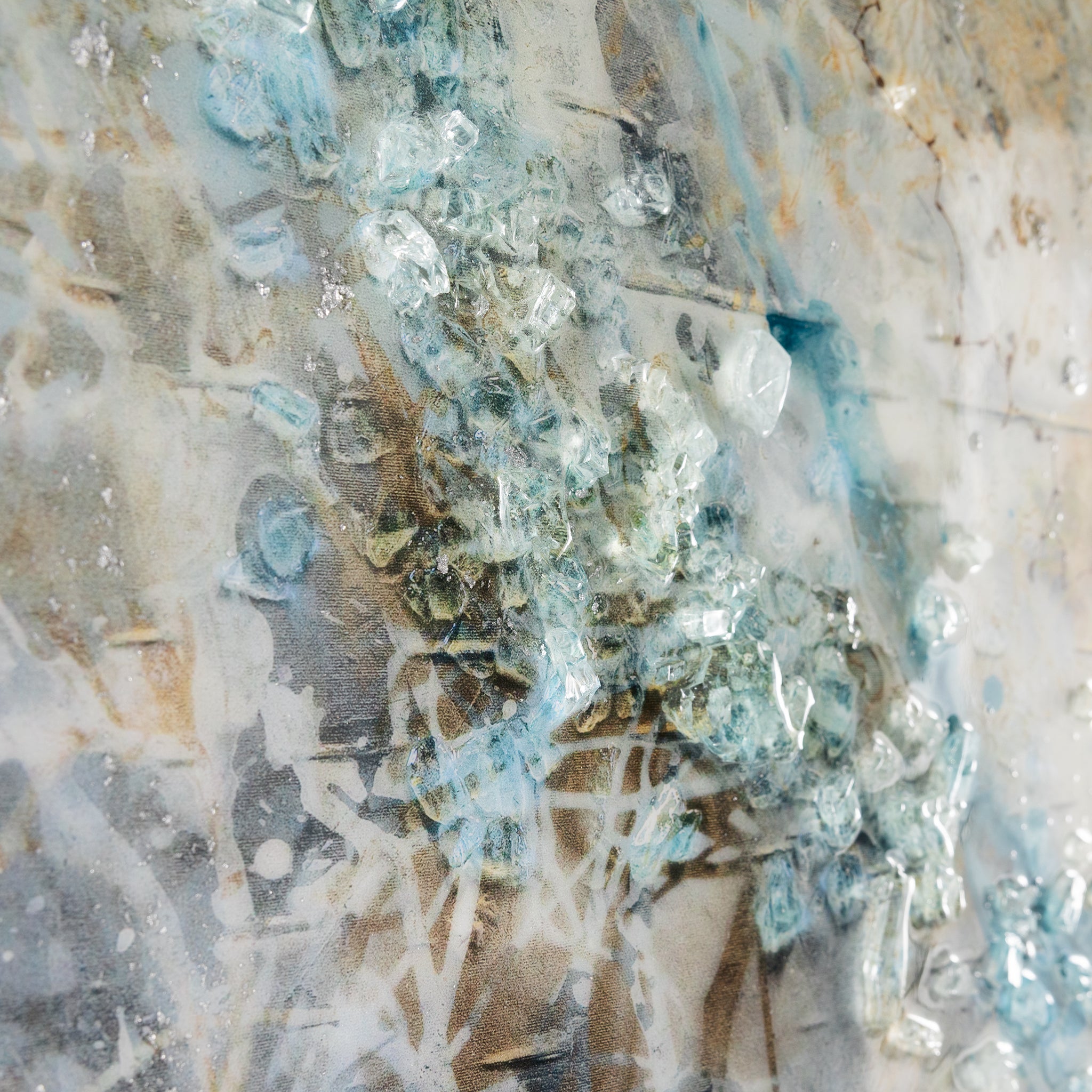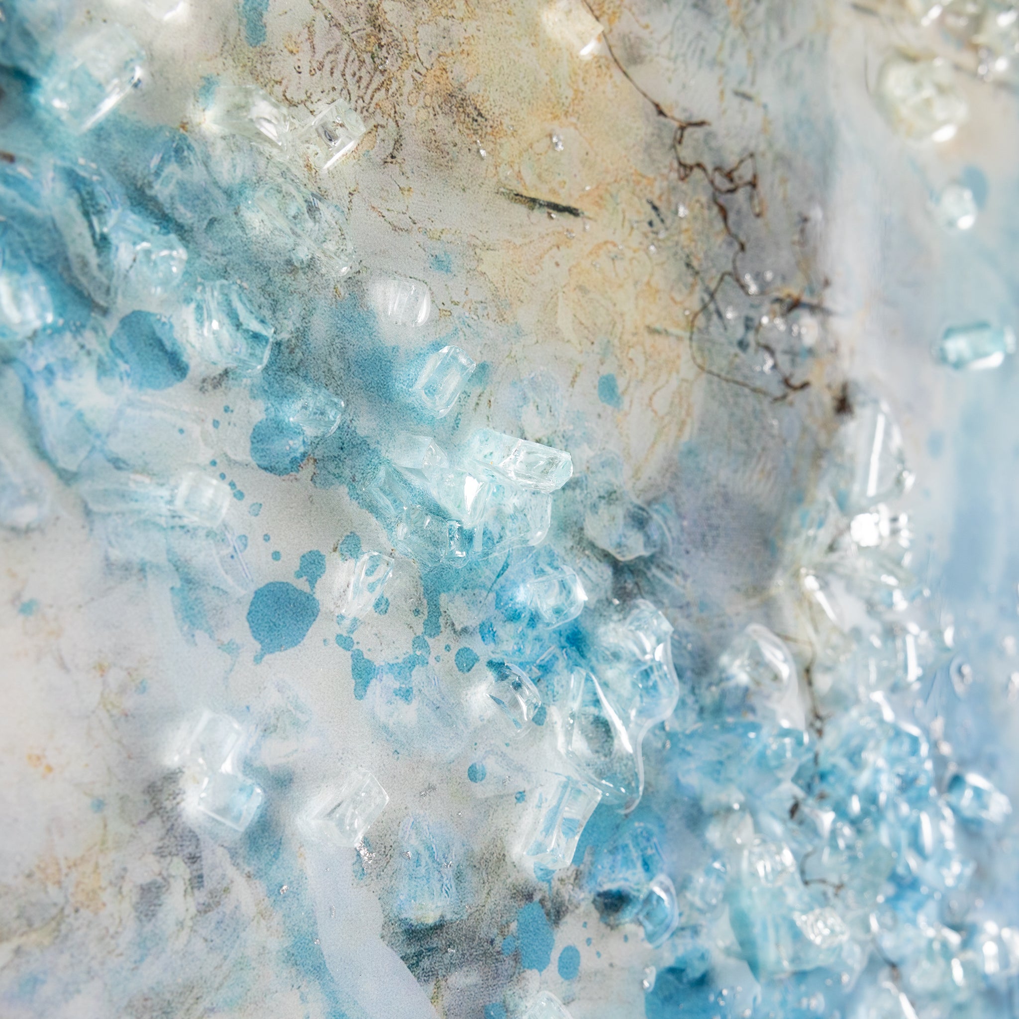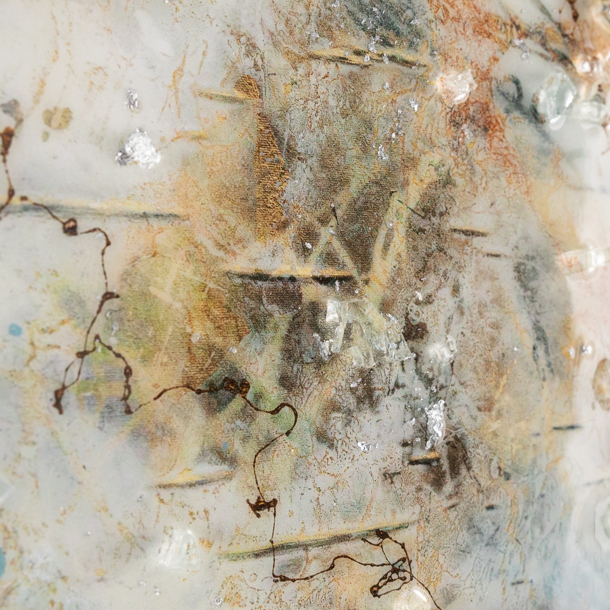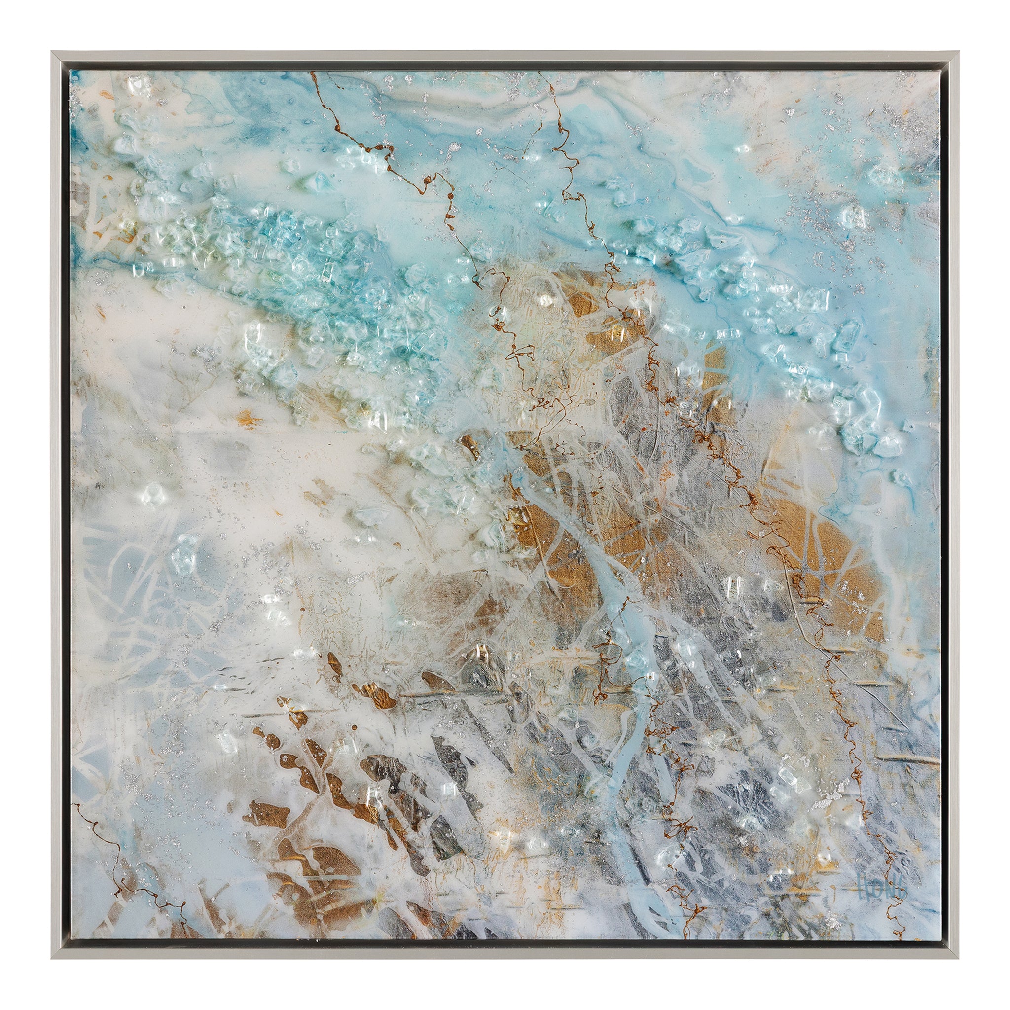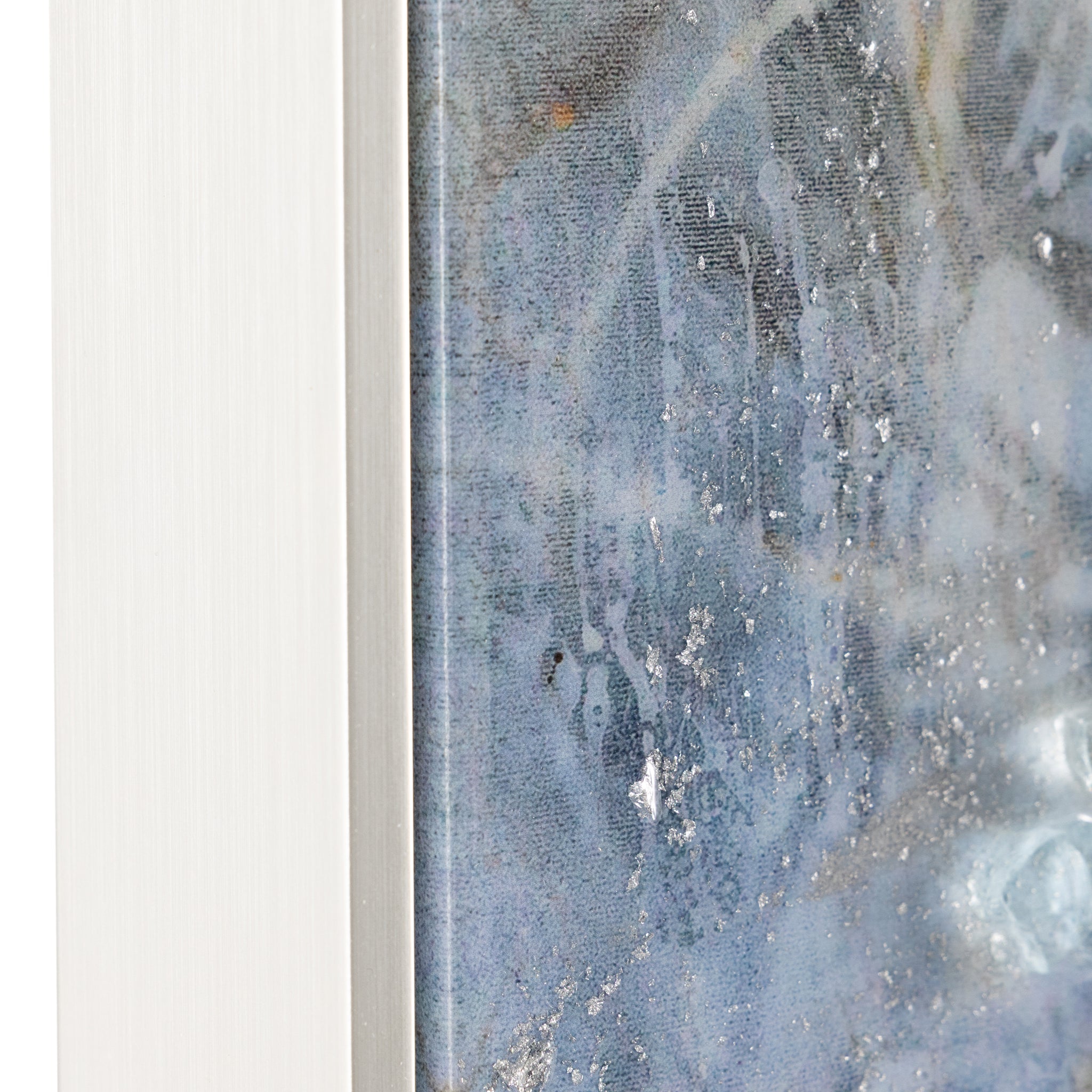 Dream Catcher by Mary Hong is an abstract print on canvas that showcases ethereal forms in elegant blues, rich browns, and pristine whites. A vitreous finish enhances the piece with a glossy sheen, while delicate traces of silver leaf and shards of tempered glass add texture and visual depth. The piece is displayed from within a silver floater frame that echoes the artwork’s silver accents.