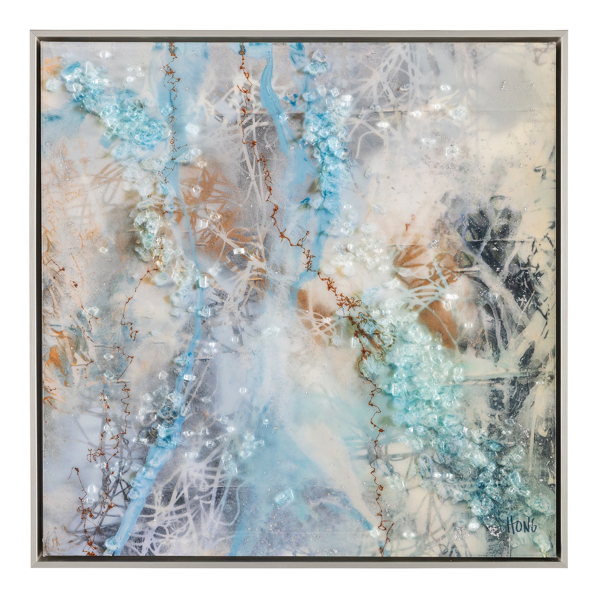 Dream Catcher by Mary Hong is an abstract print on canvas that showcases ethereal forms in elegant blues, rich browns, and pristine whites. A vitreous finish enhances the piece with a glossy sheen, while delicate traces of silver leaf and shards of tempered glass add texture and visual depth. The piece is displayed from within a silver floater frame that echoes the artwork’s silver accents.
