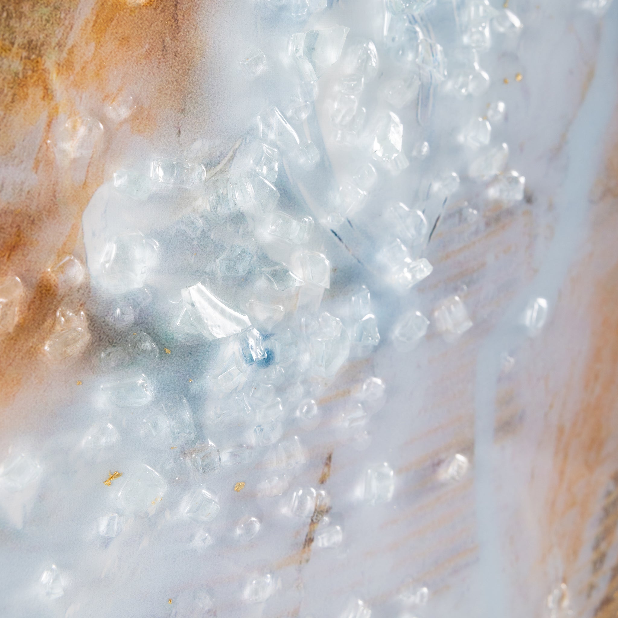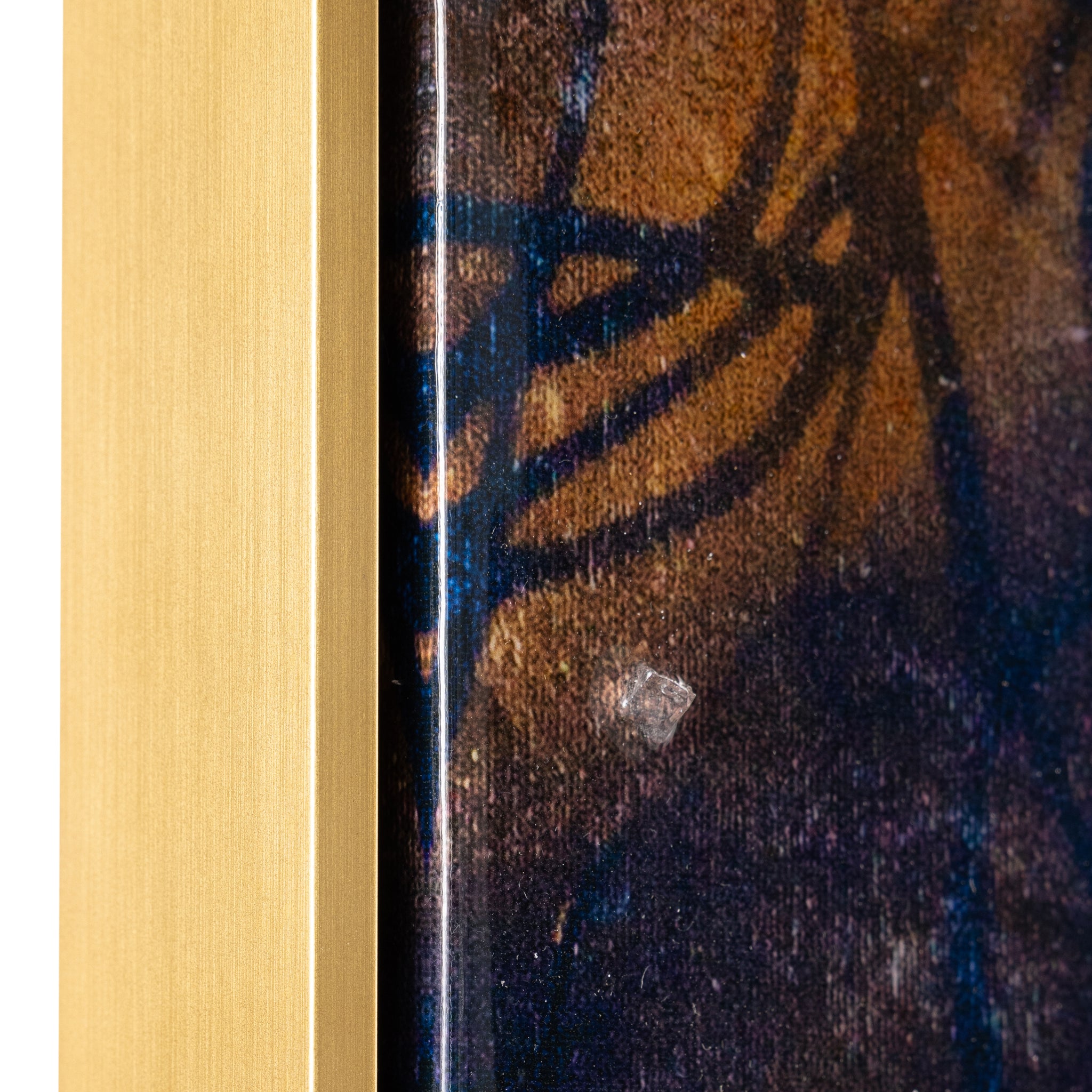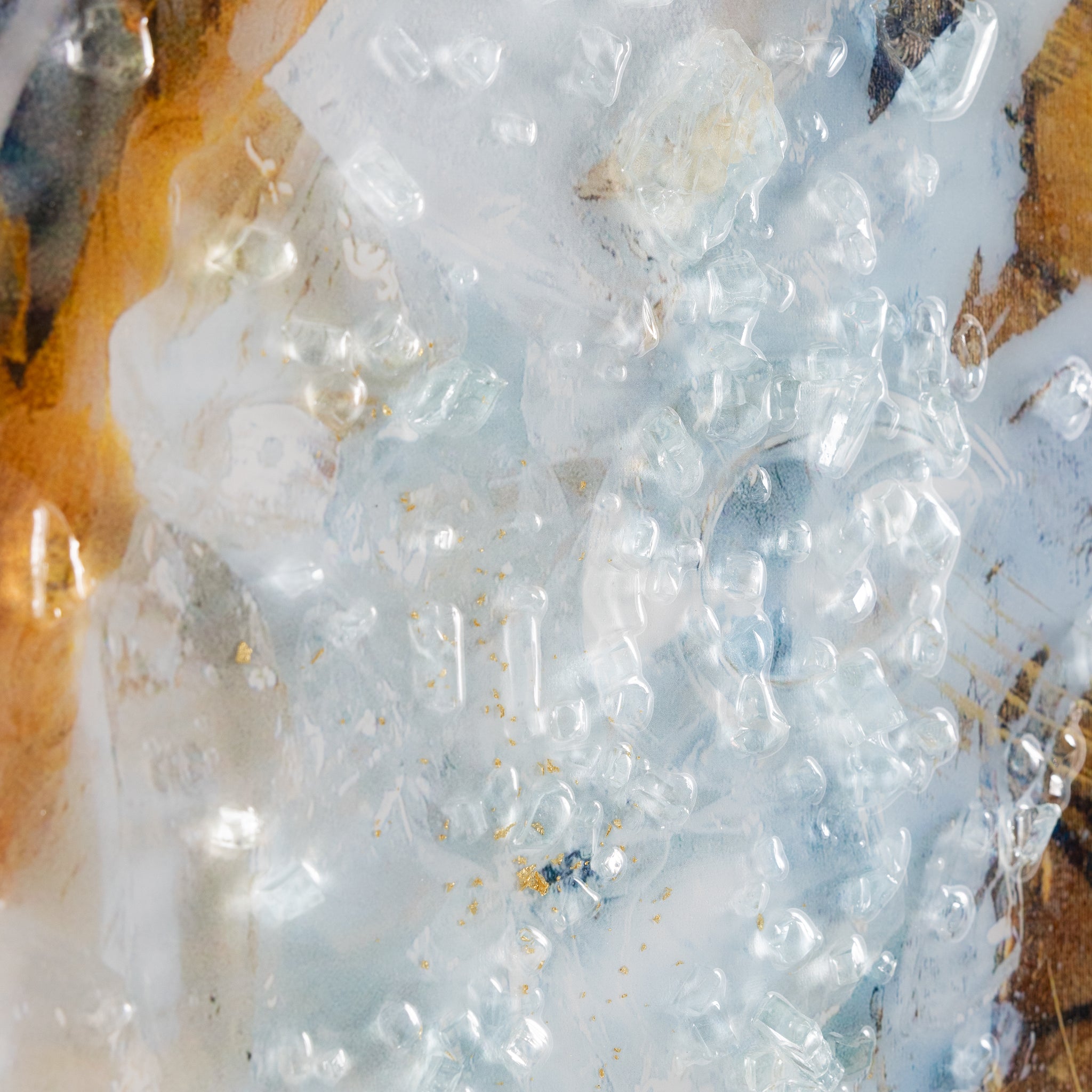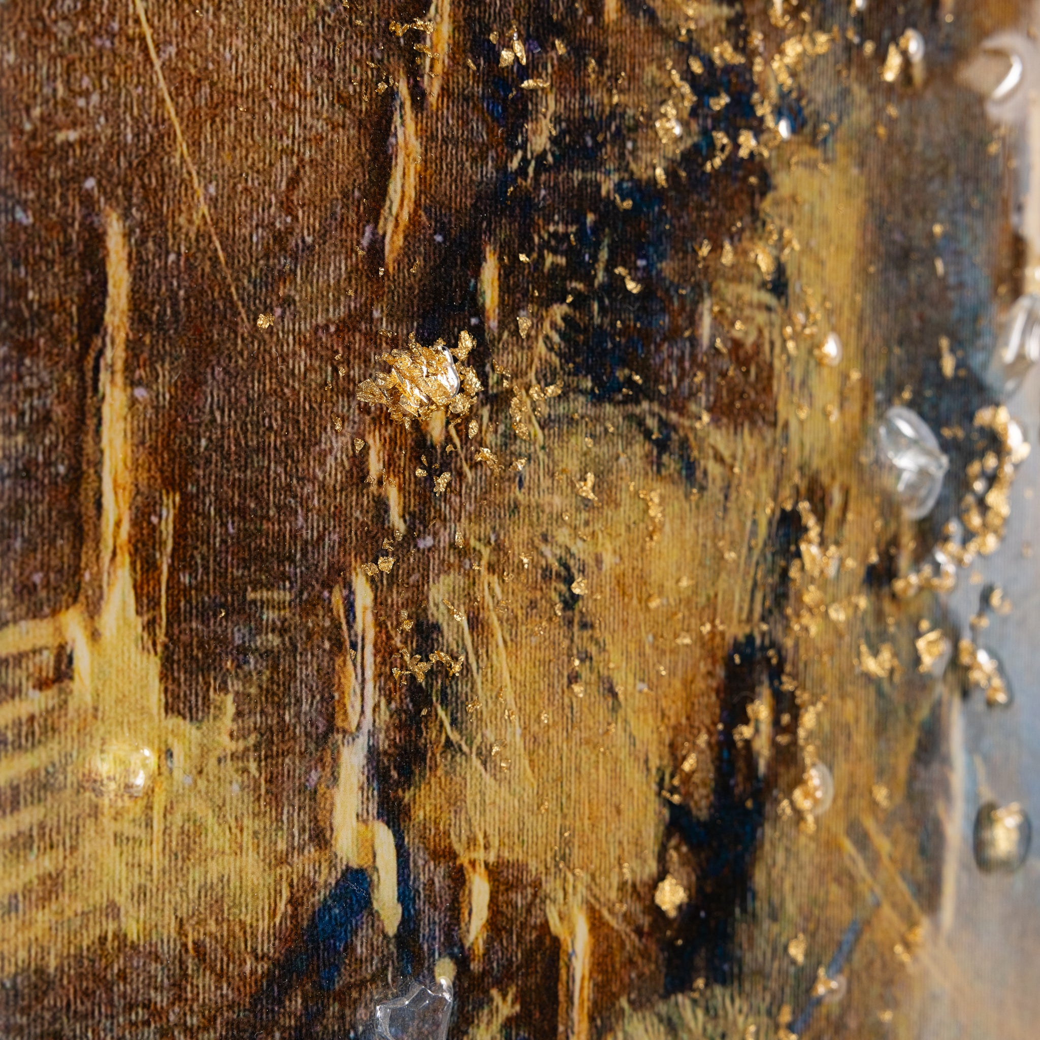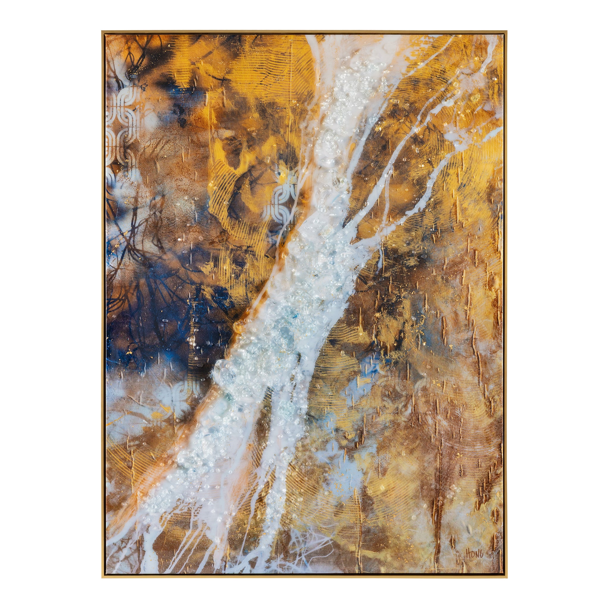 Roots Run Deep by artist Mary Hong is an exquisite print on canvas featuring meandering swirls of gold and black tones, intersected by soft white streaks that overlay the composition. The piece’s meandering shapes evoke a graceful sense of movement within an interior space. Tempered glass shards and gold leaf embellishments, combined with a glossy vitreous finish, add a wealth of texture and dimension. The artwork is held within a champagne floater frame, designed for vertical display only.