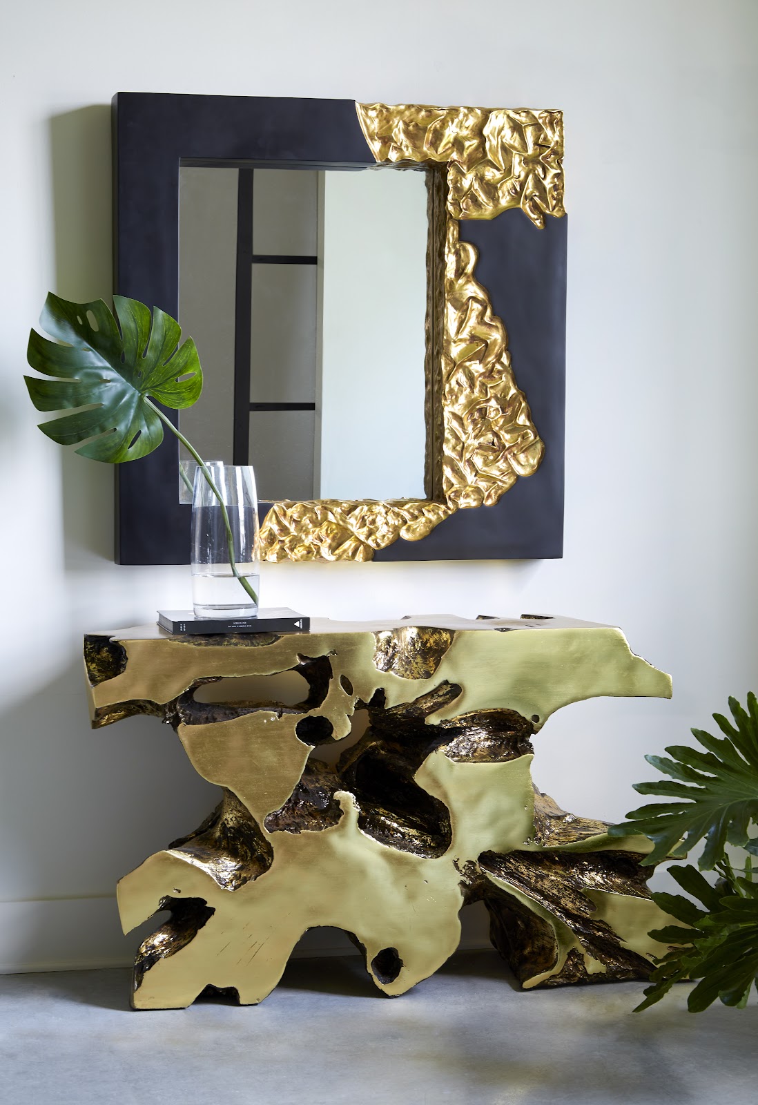 The otherworldly pattern that flows along the frame of the Mercury Square Black Gold Mirror makes a statement in its randomness, mimicking the surface of some far-away planet but with much greater style. Made of composite in a intermingling of black and gold leaf finishes, a design detail of note is how the decorative mirror’s frame is fluted where the gold pattern flows along it. This square mirror reflects the ethos that Phillips Collection personifies: modern organic. We also offer this design in a round version, and in round in silver.