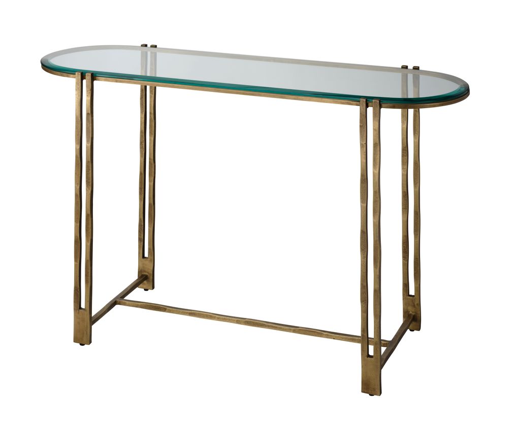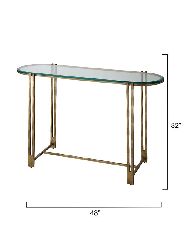 With its slim iron frame and beveled glass top, this console table embodies modern refinement and quiet sophistication. The antique brass finish adds a soft, golden warmth, while the elongated oval silhouette maintains an open, airy presence in any room. Perfect for an entryway, behind a sofa, or beneath artwork, it provides an elegant foundation for layered decor and thoughtful displays, balancing sleek design with artisanal craftsmanship.