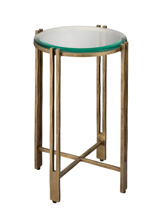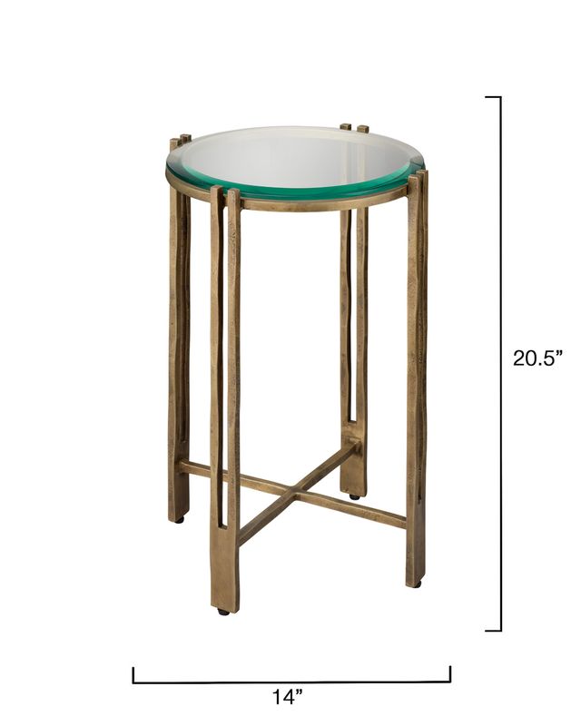A refined blend of glass and antique brass, this handcrafted side table radiates polished warmth and understated luxury. The airy, sculptural frame supports a round beveled glass top, creating an elegant balance of lightness and strength. Perfect beside a sofa or armchair, it offers a graceful perch for books, drinks, or artful accents. With its luminous finish and timeless form, it seamlessly complements both contemporary and classic interiors.