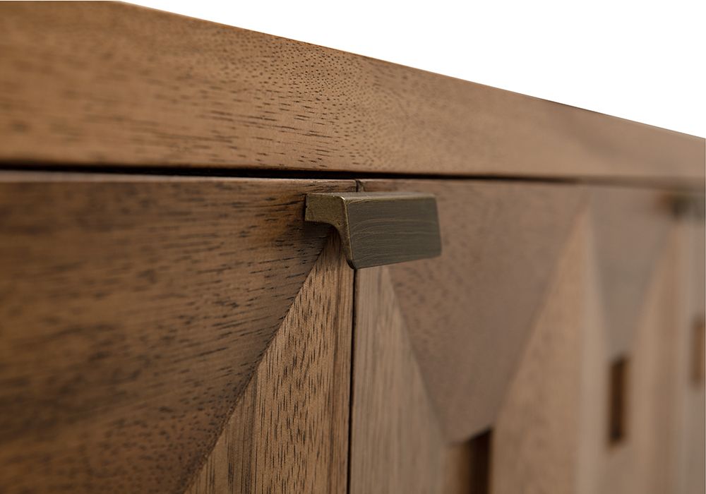 This six-drawer cabinet in Dark Walnut features six faceted, pyramidal drawer fronts that add sculptural depth and showcase dynamic wood grain. Minimal brass pulls and a defined base provide a grounded yet refined appearance, blending artisanal details with a clean, architectural style.