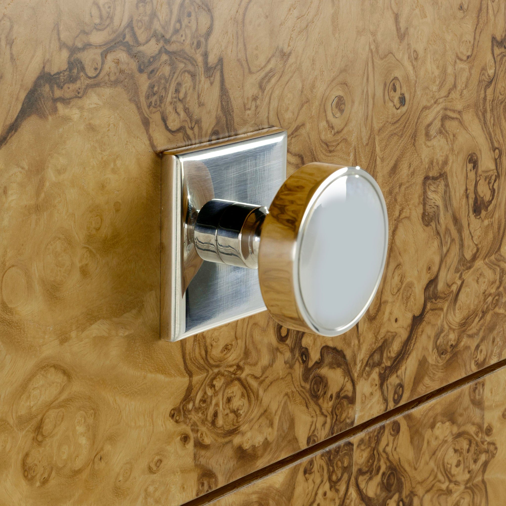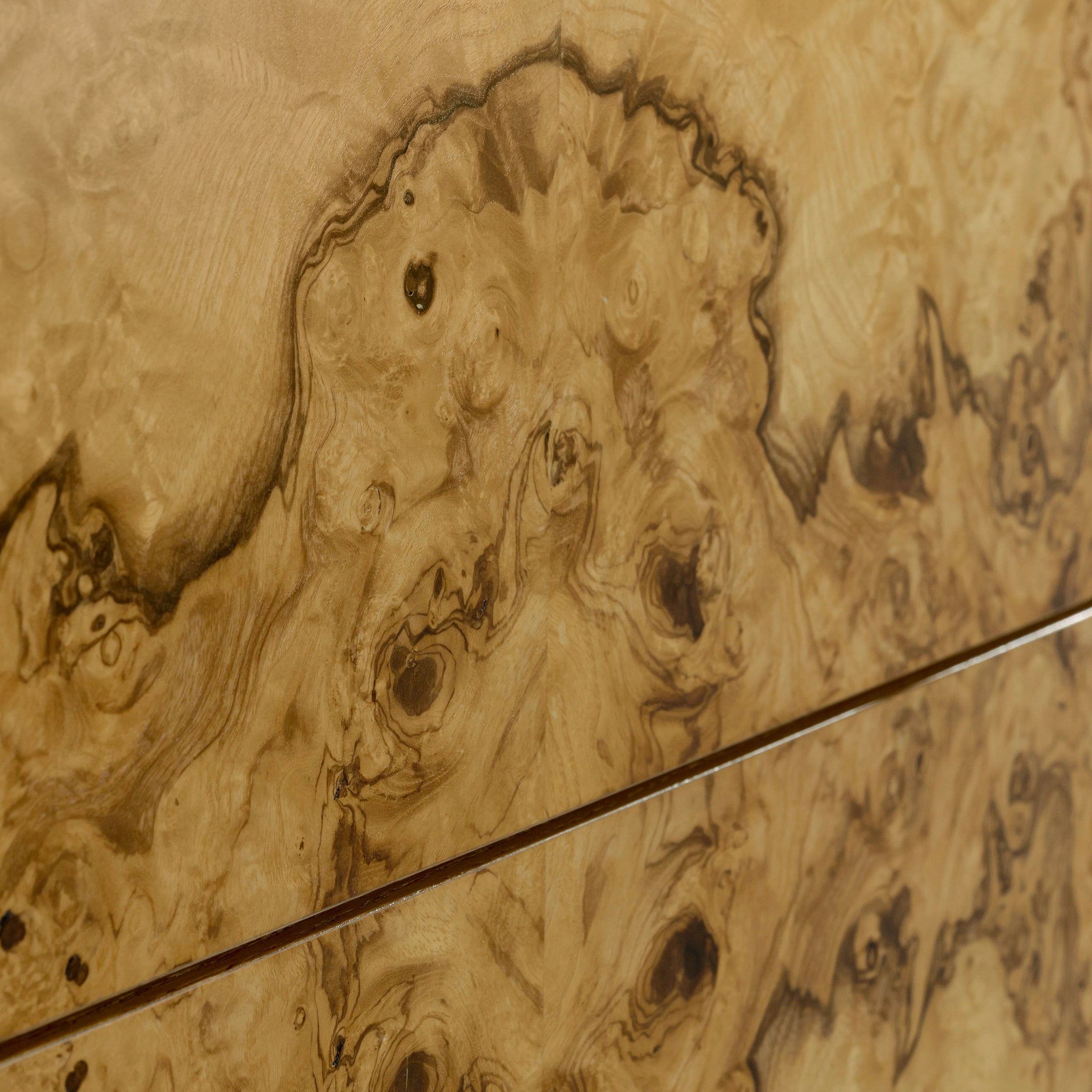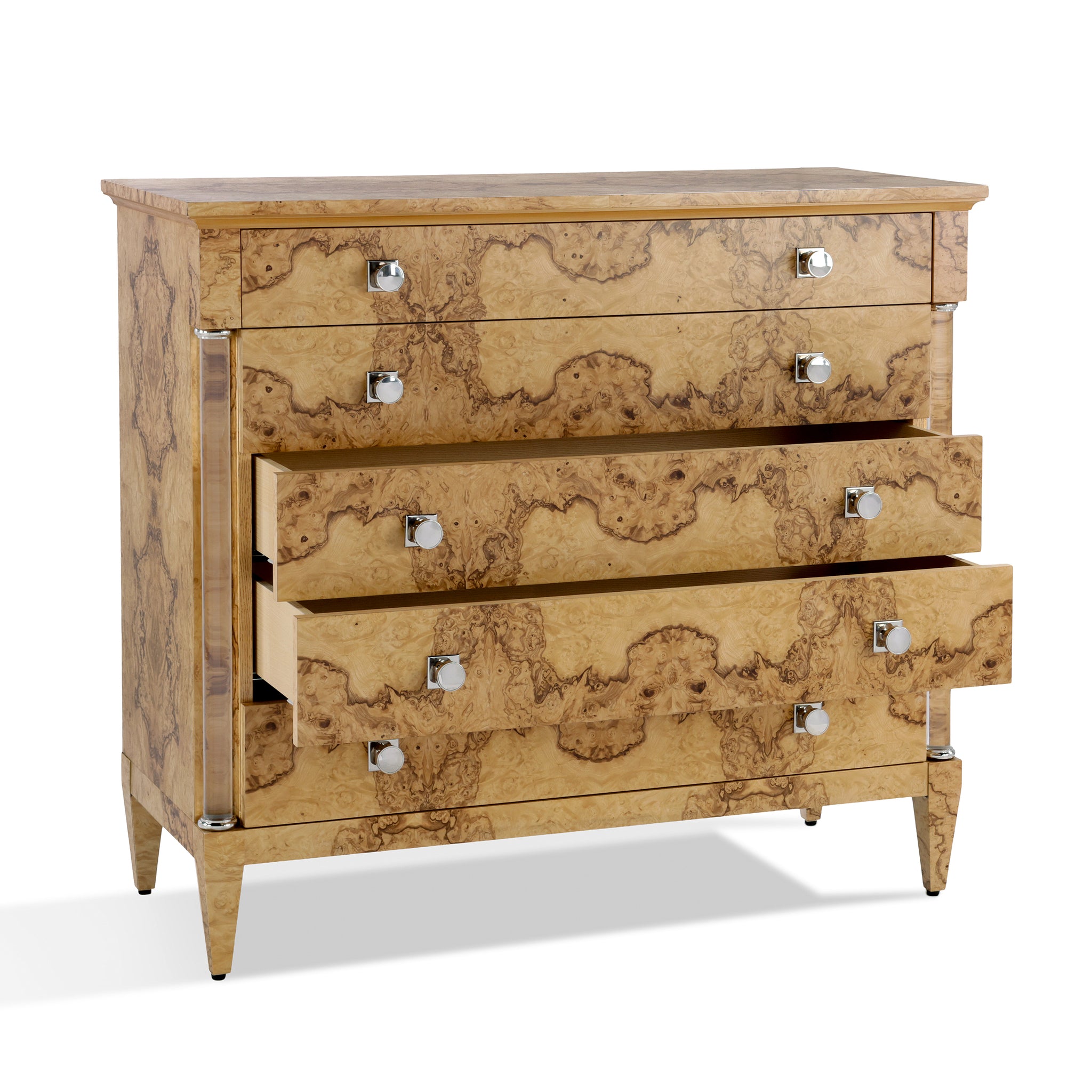 The Olea Five-Drawer Chest showcases the striking beauty of ash burl, finished in Natural Olive Ash to emphasize its unique grain patterns. The bold, organic swirls of the burl are beautifully contrasted with the chest's refined silhouette and sculptural legs. Two acrylic columns border the five drawers, contributing a modern touch that complements the Polished Stainless Steel handles.