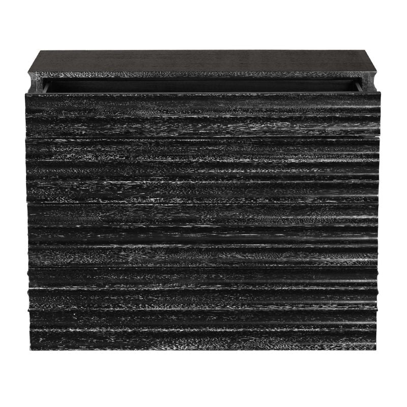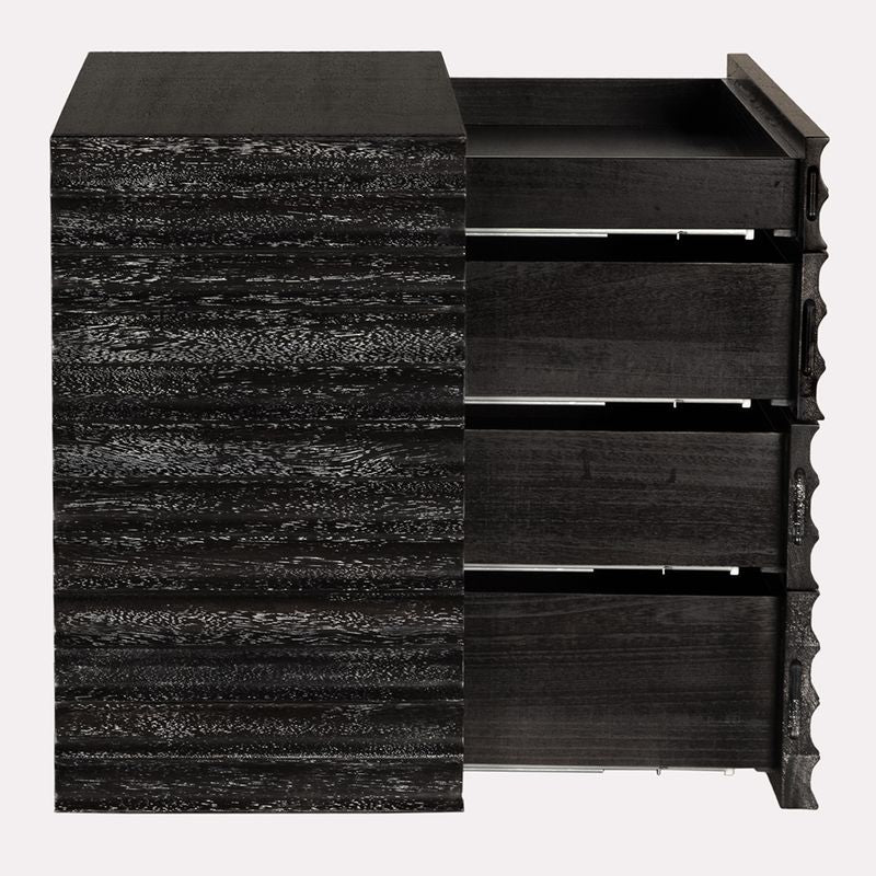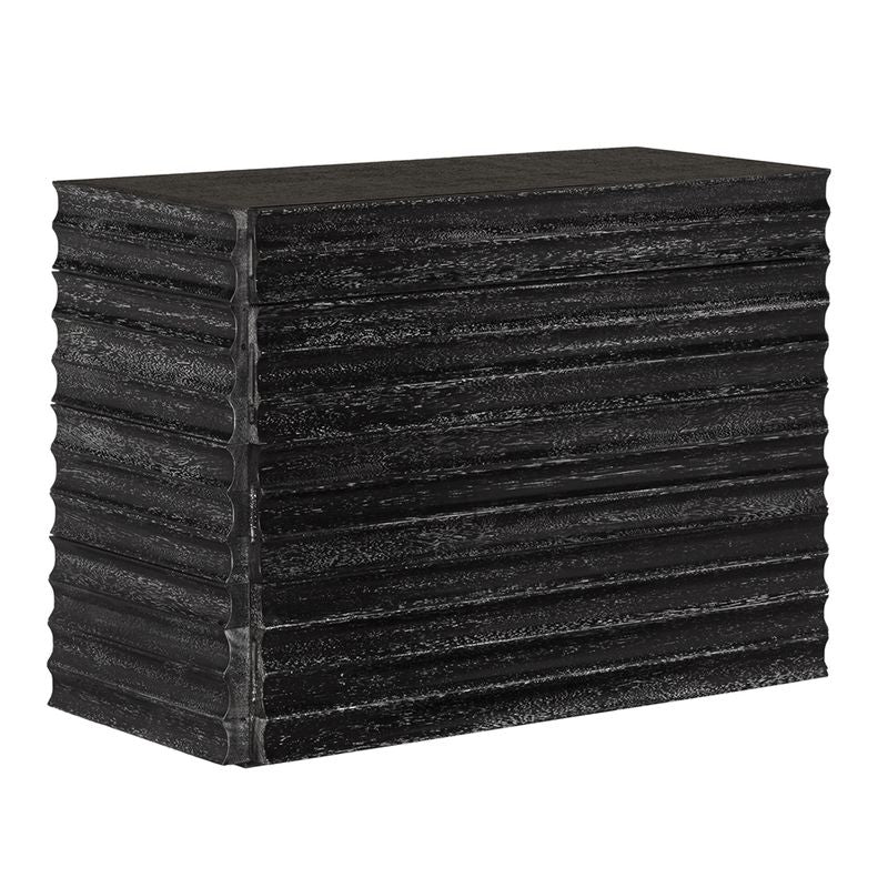 This four-drawer side table or dresser showcases a bold, sculptural design with deep horizontal fluting and a rich black finish, offering a modern, textured aesthetic perfect for contemporary or industrial-inspired interiors.