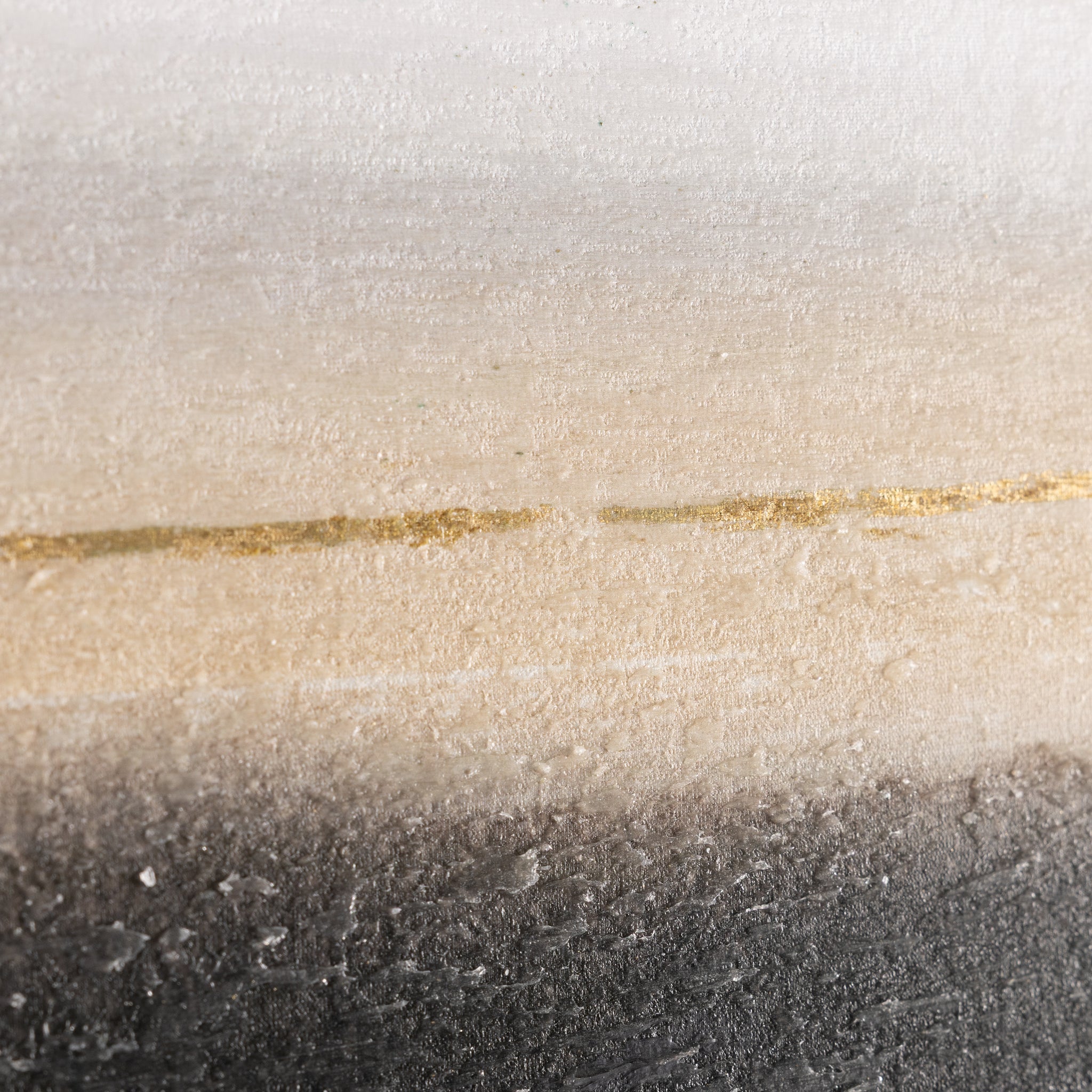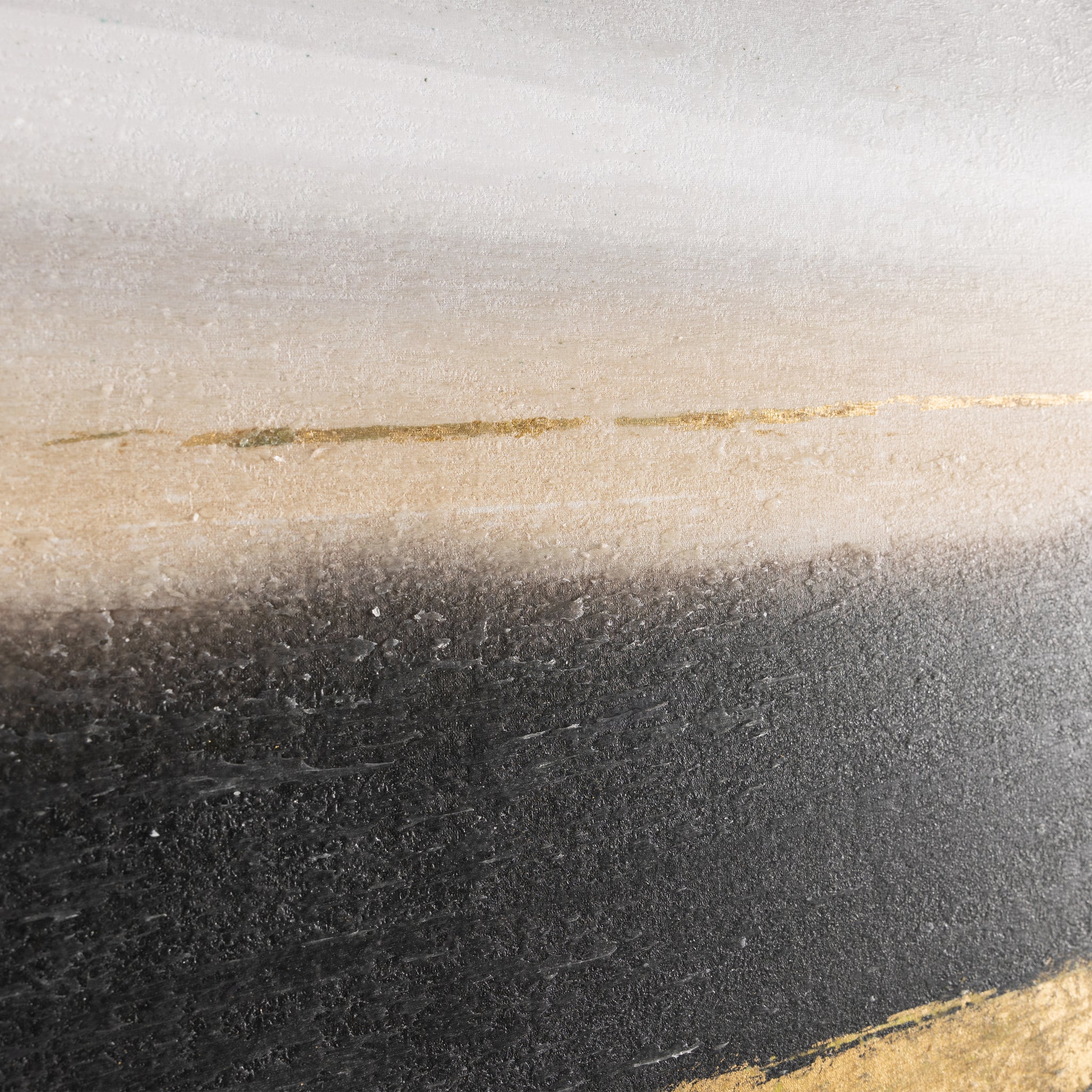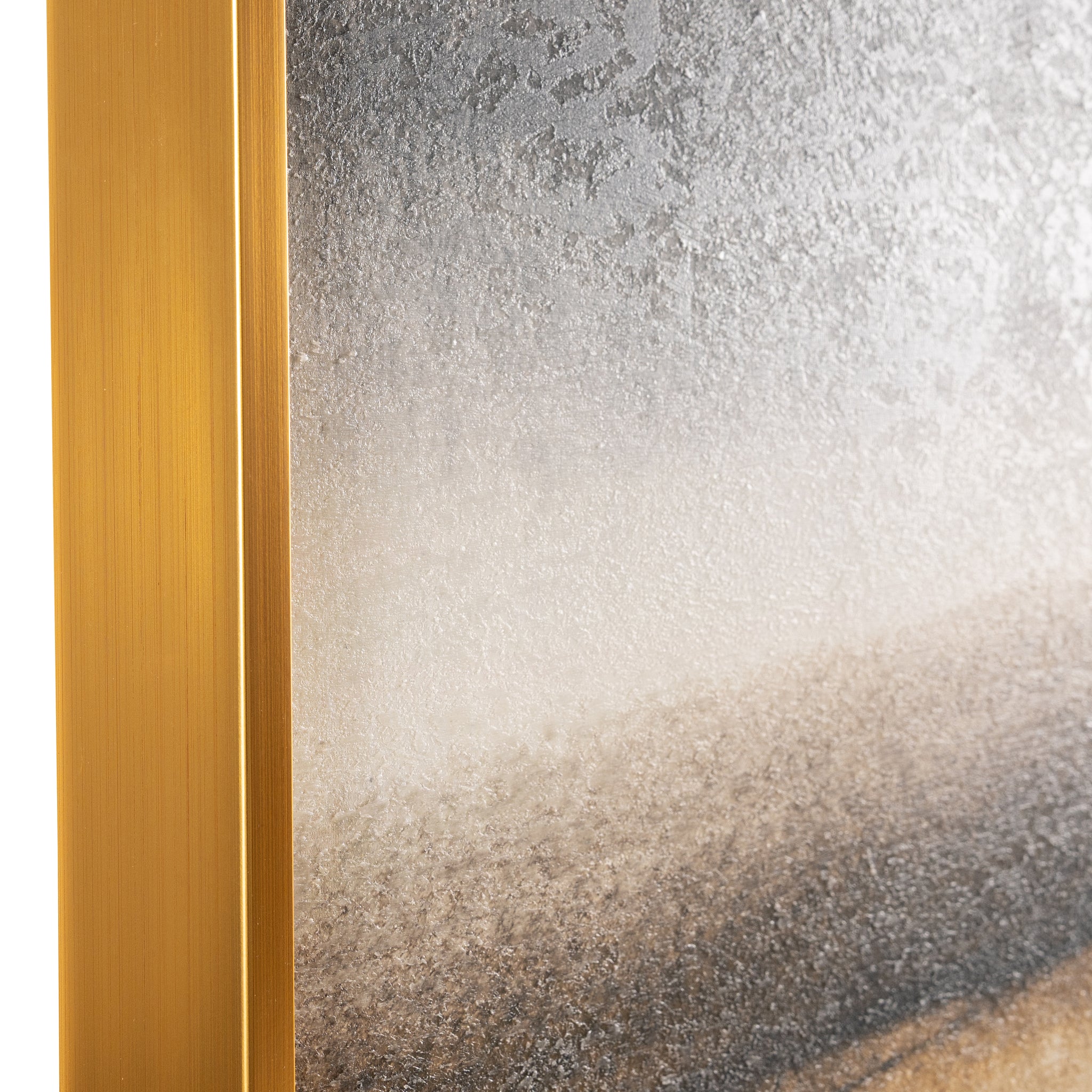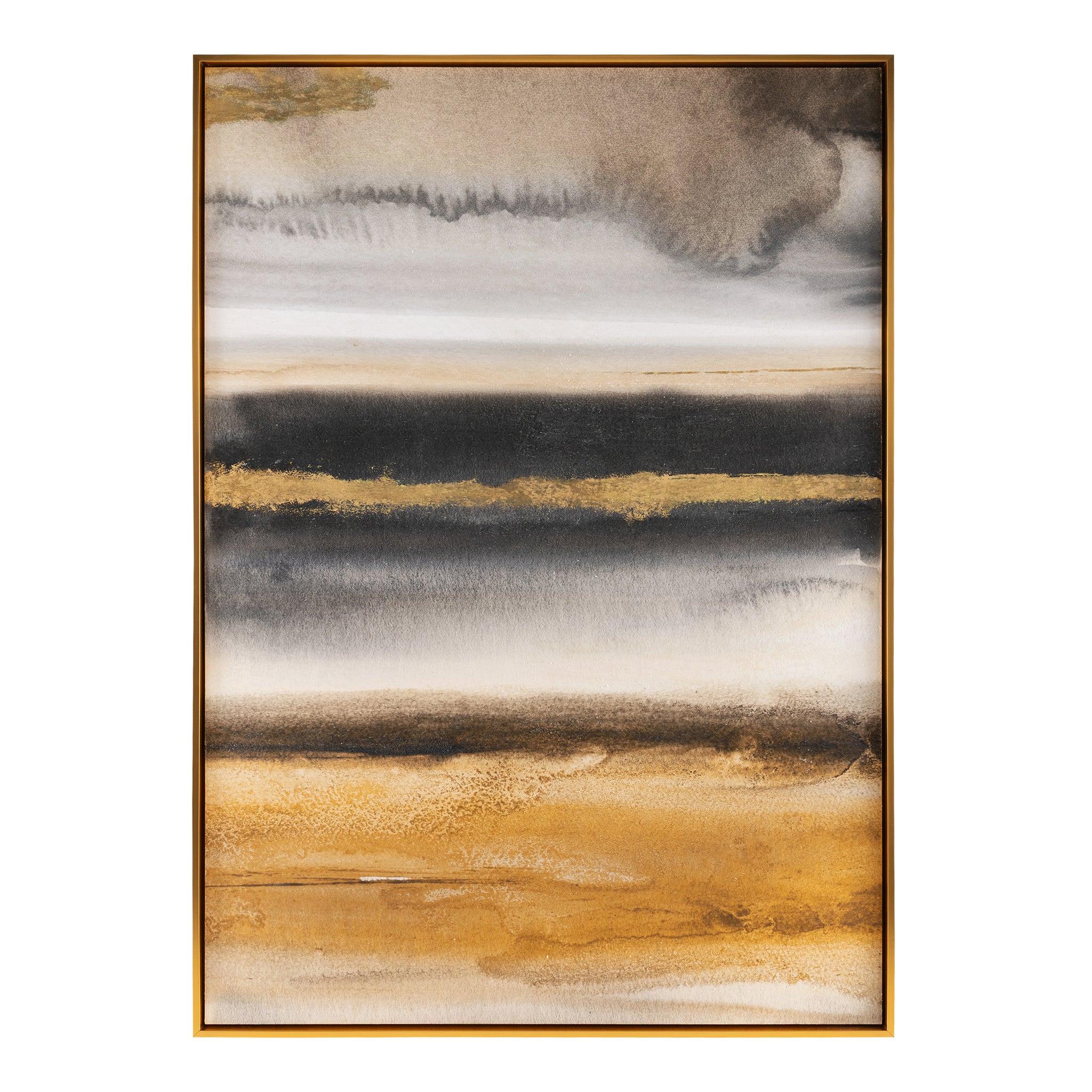 Trek by artist Paul Duncan is a striking canvas print that brings an alluring sense of dimension to any space. Rich tones of black, brown, and gray are layered with gold leaf and a textured matte gel, creating a dynamic sense of contrast and volume. Encased in a gold wood floater frame, this piece is designed only for vertical display.