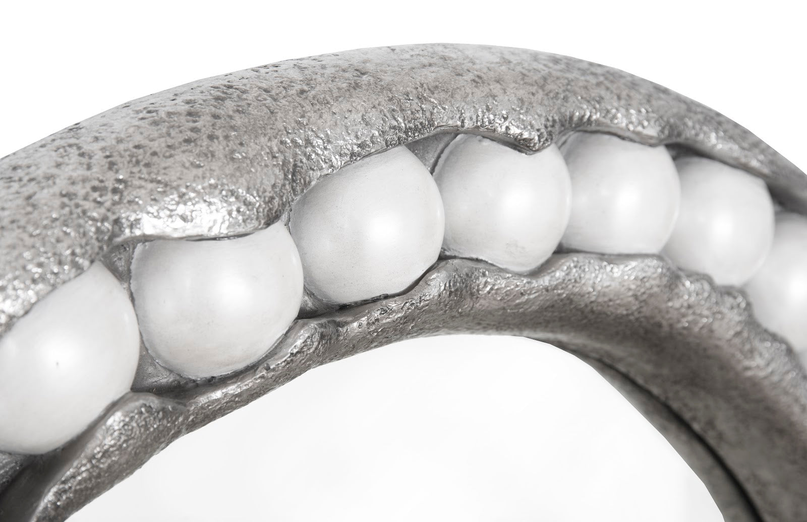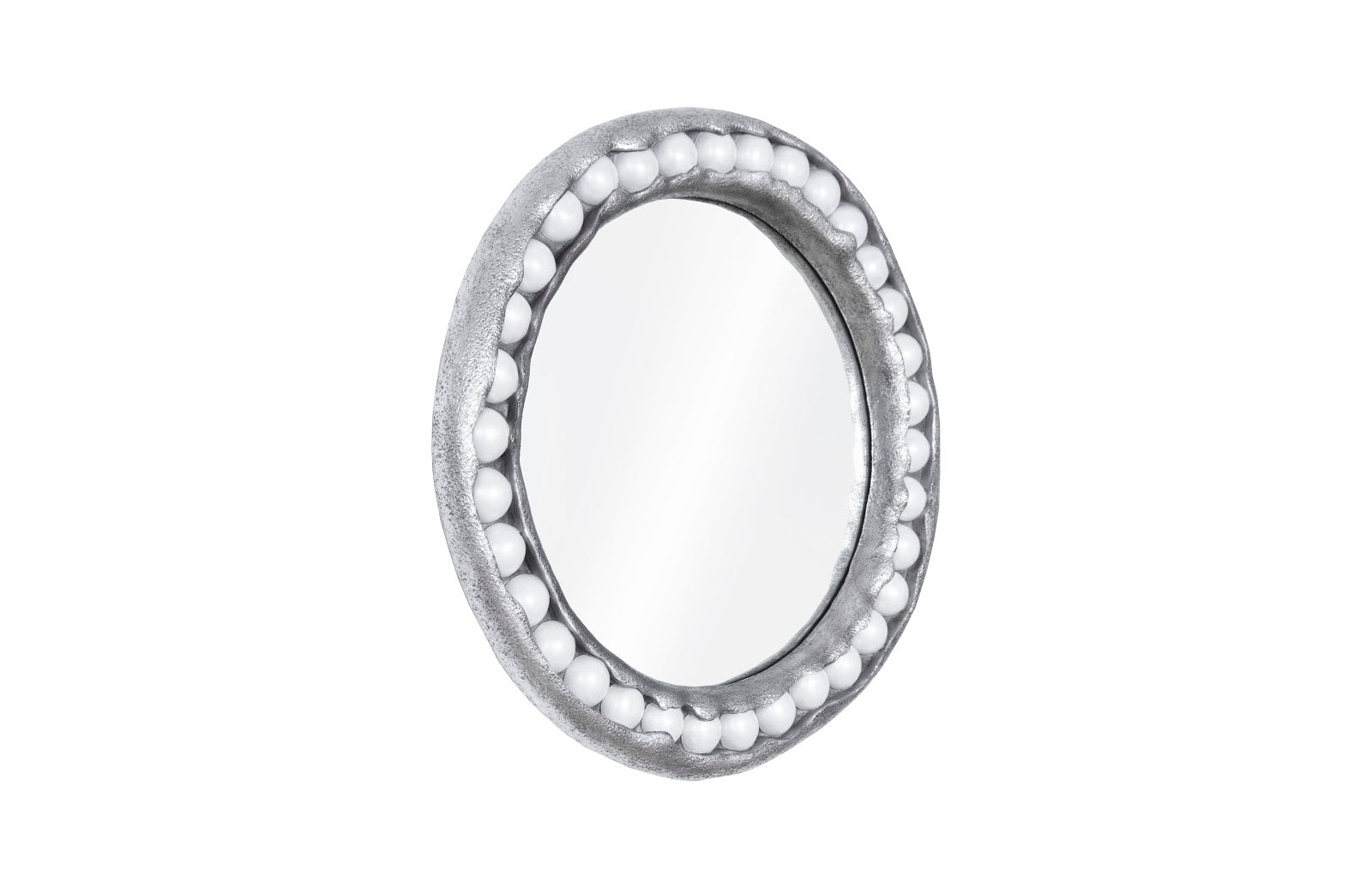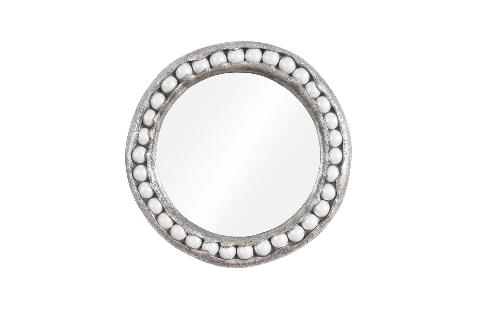 Like a piece of jewelry for a room, the Pearl Round Silver Mirror clasps its string of beads in circular fashion as if it is wearing them. Made of composite in a silver leaf finish, the exterior and interior rings have organic shapes that flow along the pearls, which have a white finish for a nice crisp feel. The interesting thing about this decorative mirror is it has a rather ethnic feel but it can swing Boho chic. We also offer the Pearl in a gold leaf finish. These round mirrors reflect the ethos that Phillips Collection personifies: modern organic.