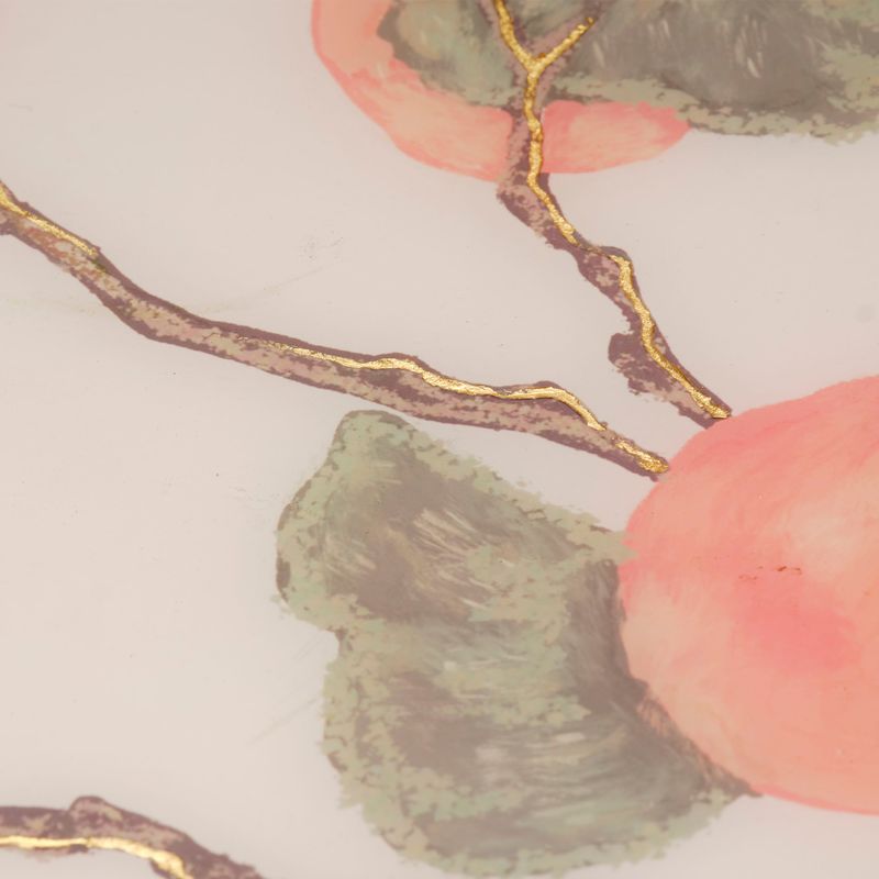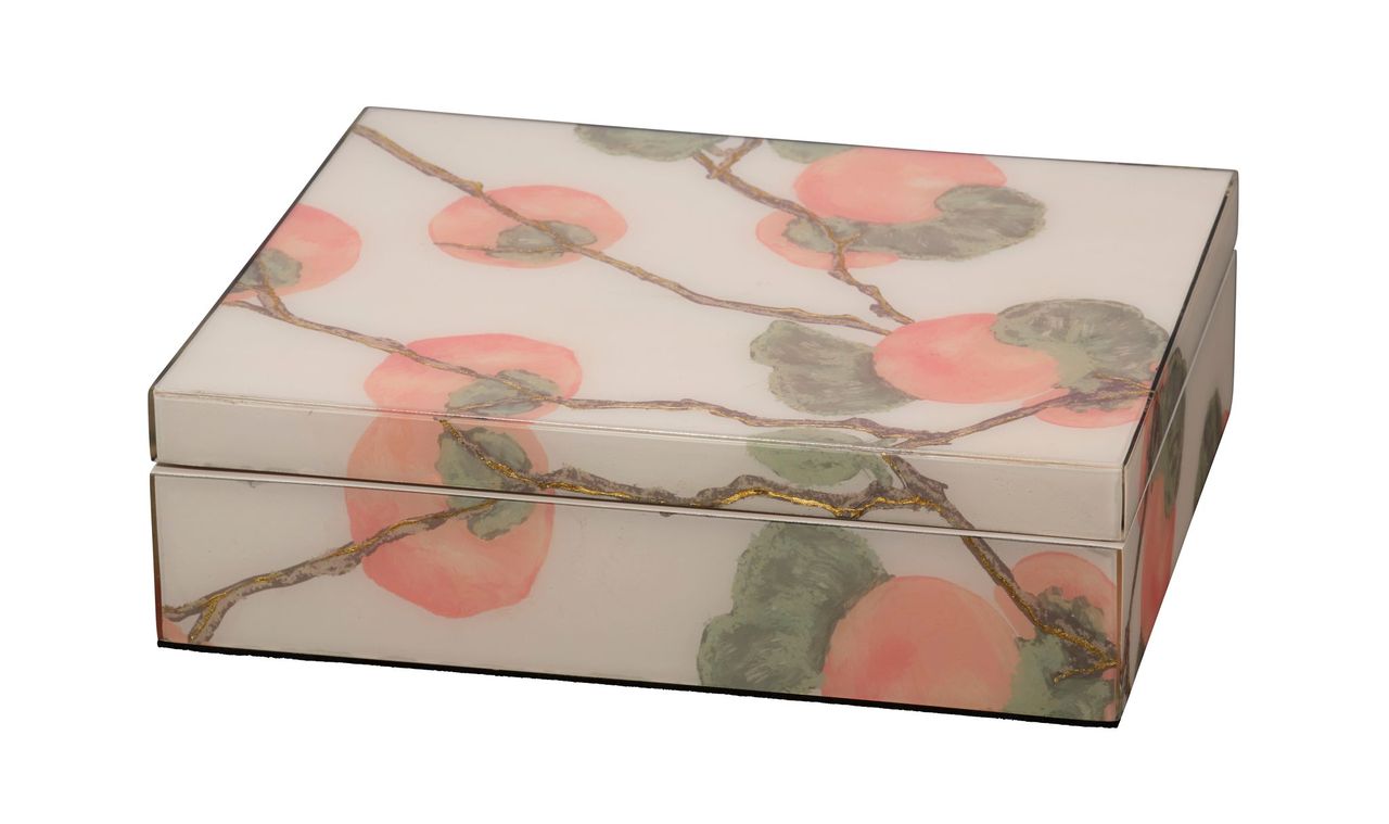 Bright and elegant, this lacquered box features a hand-rendered persimmon motif delicately accented with touches of gold leaf. Its high-gloss finish and pebble-grey interior elevate even the simplest of spaces, adding warmth and refinement to desks, vanities, or shelves. Perfect for jewelry, accessories, or small keepsakes, it is a radiant accent that combines utility with the grace of handcrafted design.
