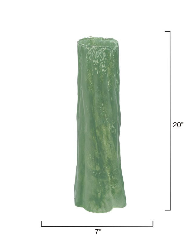 Expertly handcrafted of colored glass, the shape and nuanced details of this tall vase masterfully evoke the majesty of a single strong sequoia tree. Tall and slim, it is ideal for use with long stemmed florals.
