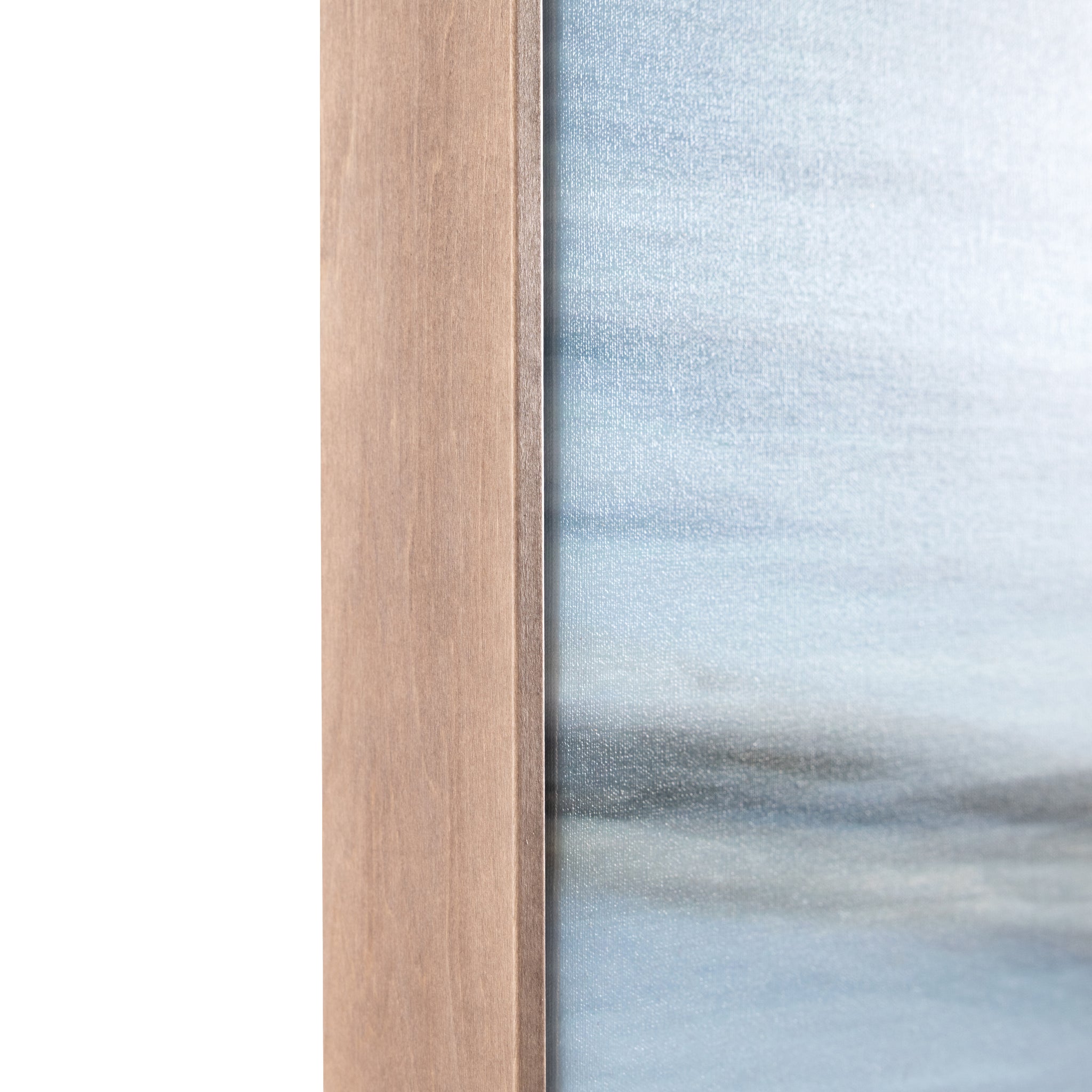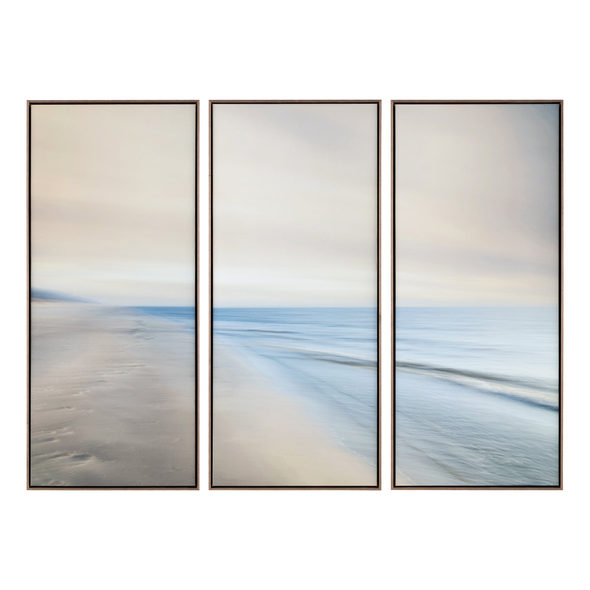 Dreamtime is a serene print on canvas based on photography by Stig Kalvelid. Presented as a stylish triptych, the piece captures a tranquil seascape, where vibrant blues fade into soft whites and grays. Each panel is set within a driftwood floater frame, adding a natural, coastal touch.