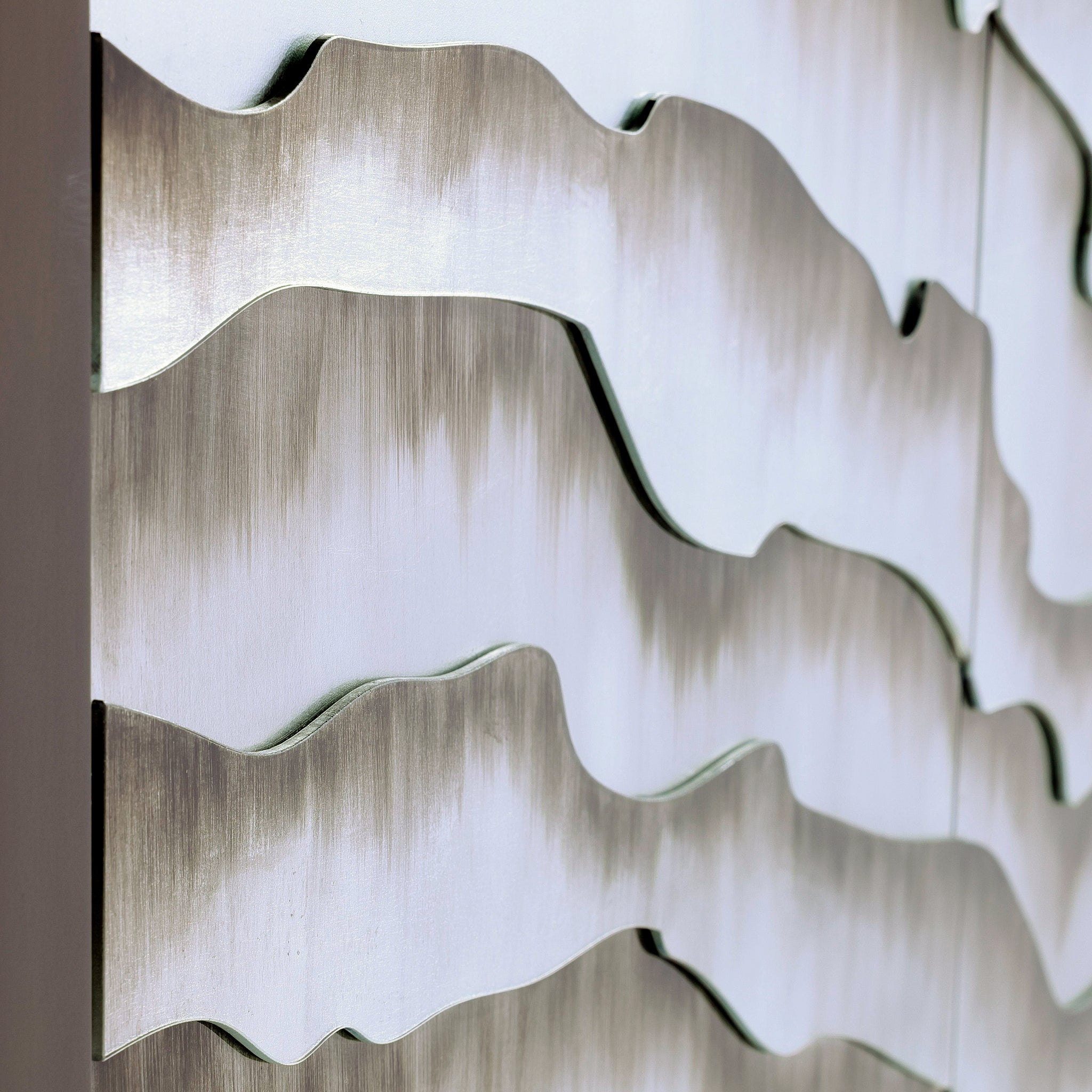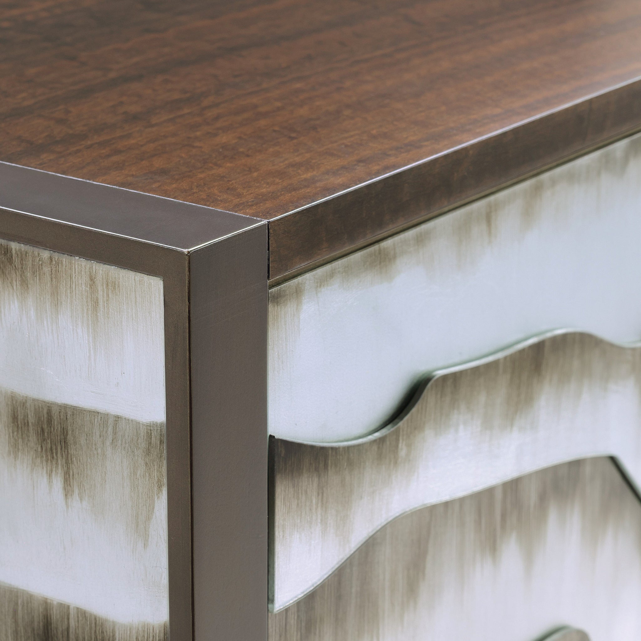 The Terrain Two-Door Cabinet is a creative statement piece that serves as an eye-catching focal point in any space. Crafted from eucalyptus wood in a Light Smoked Eucalyptus finish, the table showcases warm brown tones and subtle grain patterns. Glass panels on the sides and two push-latch doors feature a striking arrangement of jagged shapes in a Terraces finish, evoking the contours of natural terrain with a contemporary edge. The legs are framed in an Indo Bronze finish, complementing the wooden tones. This piece includes a single interior compartment with an adjustable shelf.