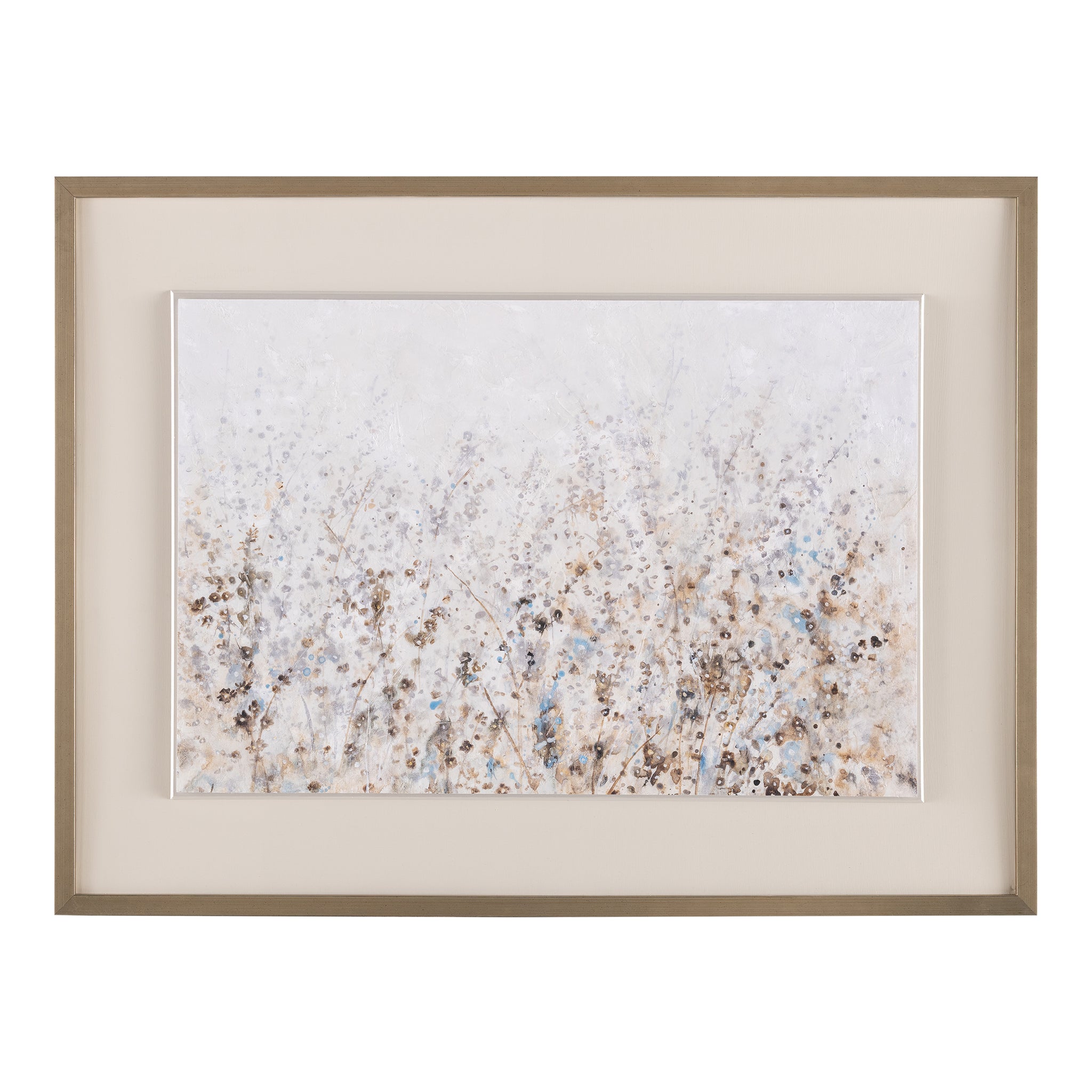Wildflower Cluster by artist Tim O’Toole is a refined print on paper that showcases delicate, airy florals. The elegant flowers in tan and silver tones are set against a pearl white backdrop, enhanced by a gloss texture gel that adds depth and dimension. The piece is framed in a distressed champagne gallery frame, adding warm golden tones to complete the sophisticated look.