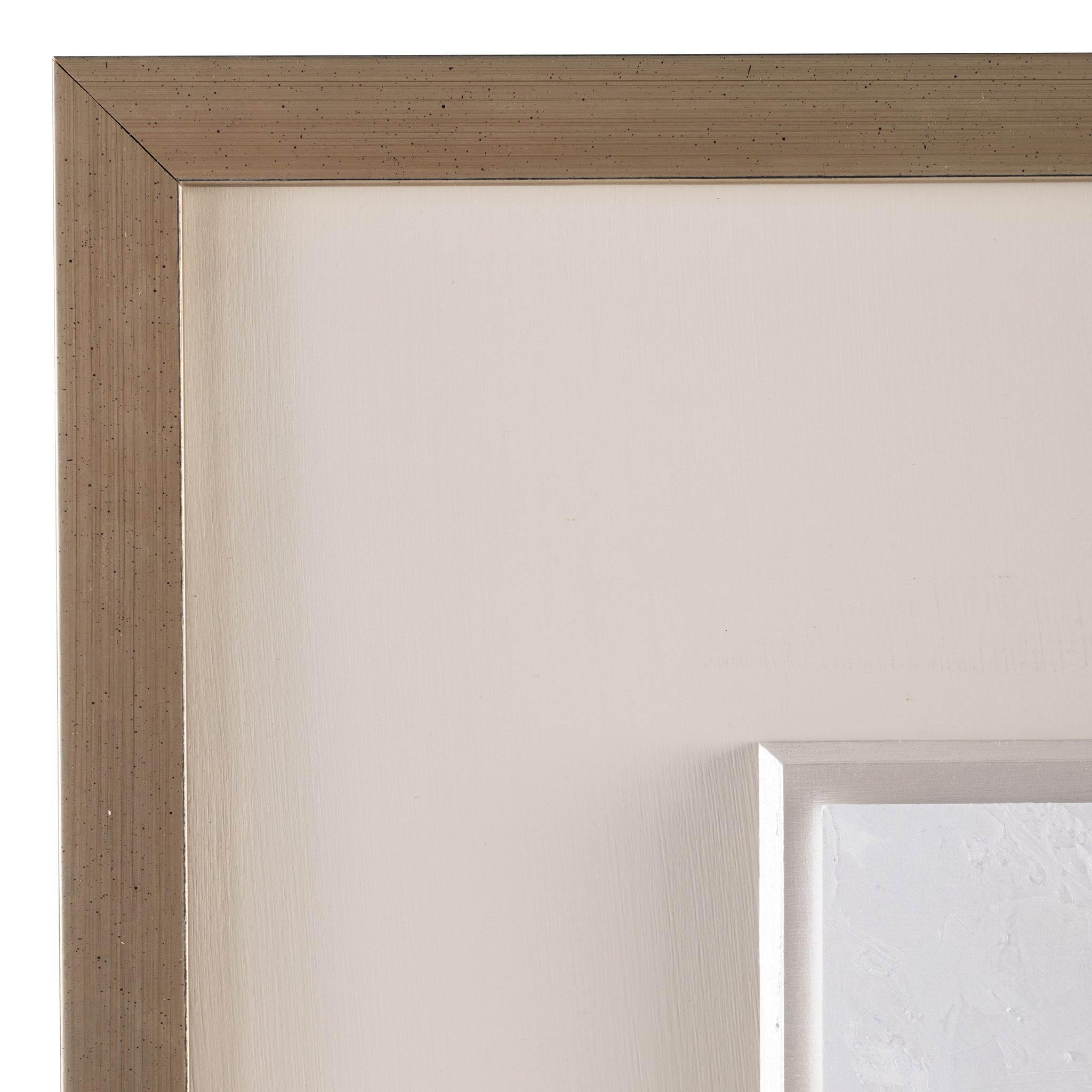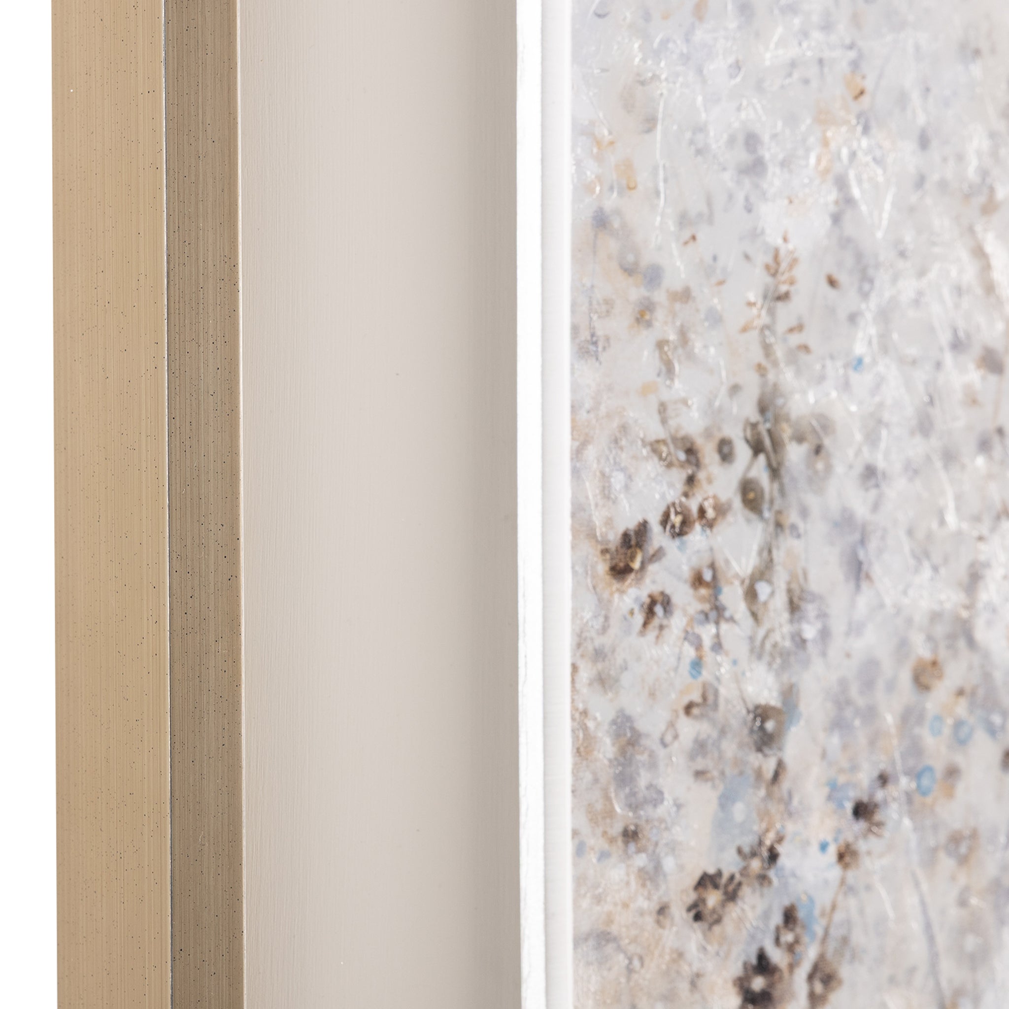 Wildflower Cluster by artist Tim O’Toole is a refined print on paper that showcases delicate, airy florals. The elegant flowers in tan and silver tones are set against a pearl white backdrop, enhanced by a gloss texture gel that adds depth and dimension. The piece is framed in a distressed champagne gallery frame, adding warm golden tones to complete the sophisticated look.