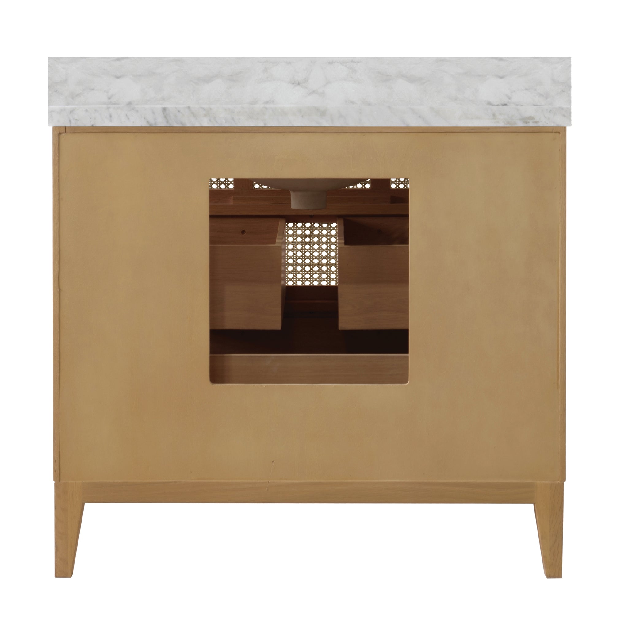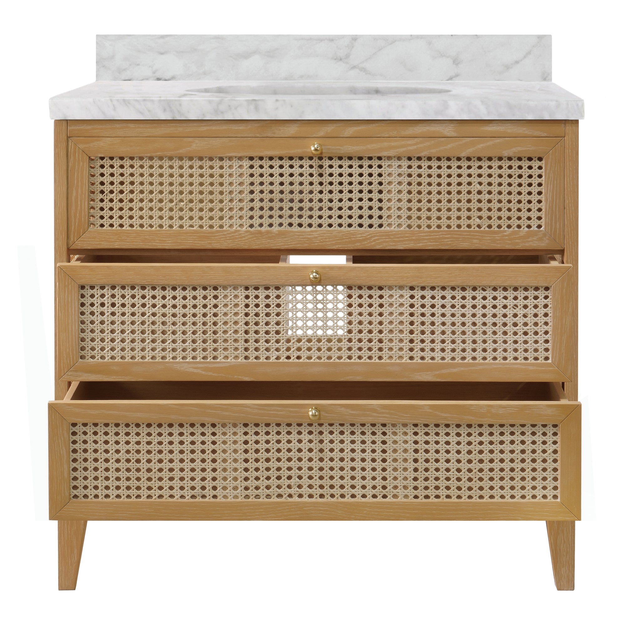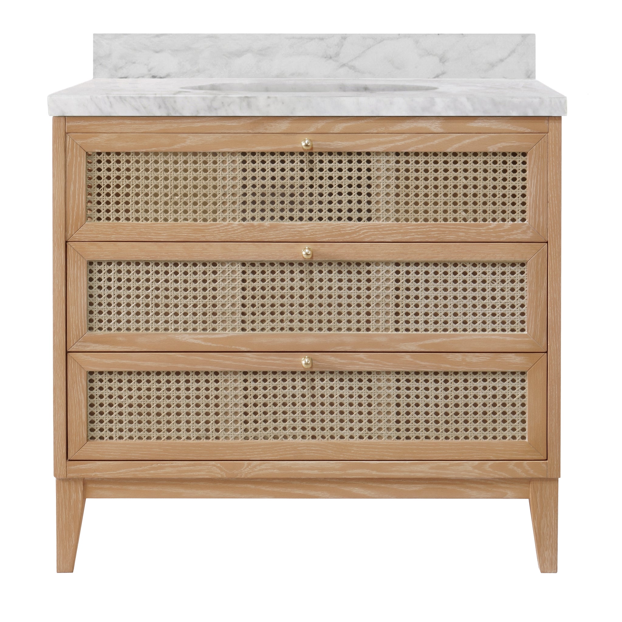 Bath vanity in cerused oak with cane front drawers, white marble top, and porcelain sink
